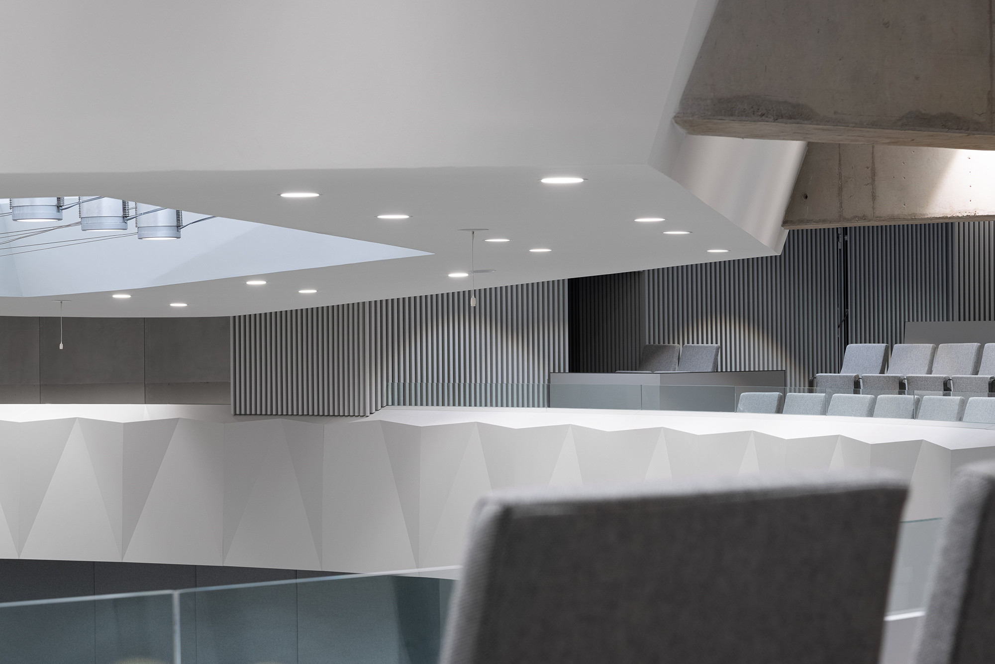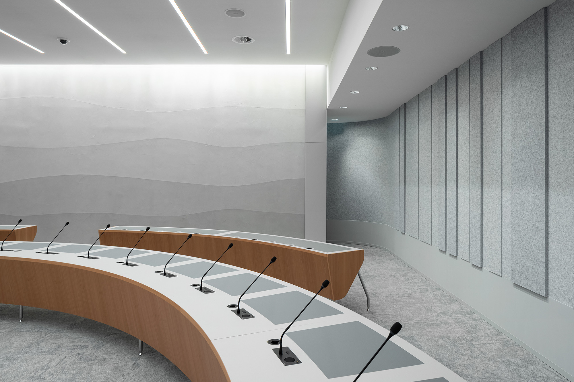 Ook op de eerste verdieping attendeert de bekende messingkleur de bezoeker op een belangrijke ruimte. De contouren van de plenaire zaal worden afgetekend door behang en stoffering in deze tint. Van binnen is de oorspronkelijke zaal ontmanteld en groter gemaakt. Dankzij het samenspel met het moderne, lichte interieur, dat gekenmerkt wordt door zachte grijstinten, krijgt het meubilair een frisse(re) uitstraling. Hiertoe draagt ook een dakraam bij, waarvan de geometrische vormen terugkomen in onder meer de balustrade van de zaal. Met deze geometrische accenten wordt de verbinding gelegd met de vormentaal die in het oorspronkelijke gebouw van Apon te vinden zijn.