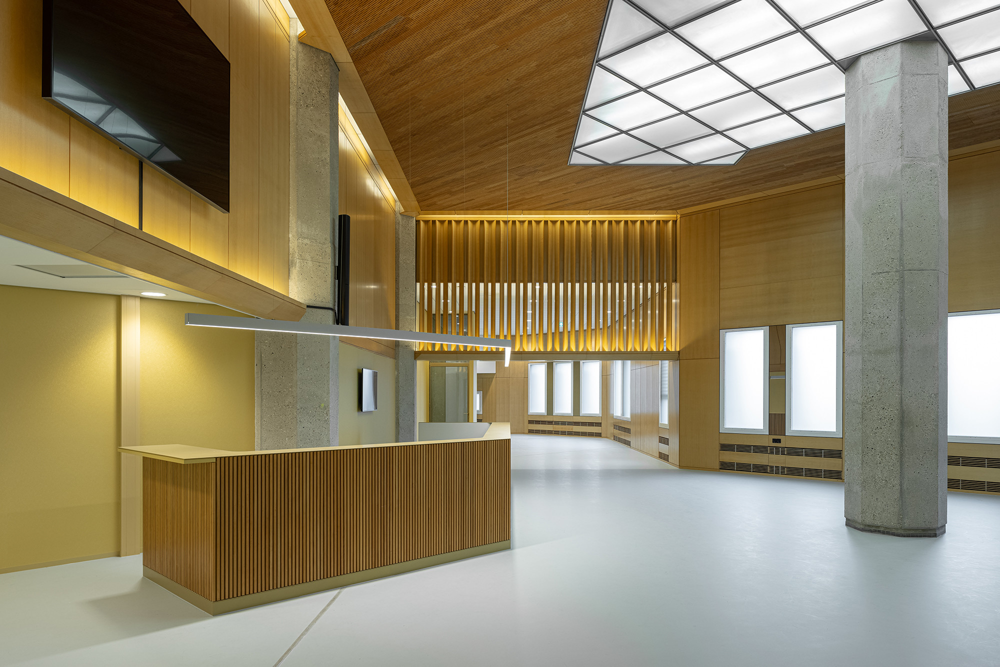 Vanuit de hoofdentree lopen de bezoekers naar de beveiligingscheck. De scanstraten, die volledig zijn uitgevoerd in de elegante messingkleur, vallen door hun discrete plaatsing in de ruimte buiten het zicht. De check is snel vergeten zodra de bezoekers de centrale hal in stappen. Met zijn hoge rasterplafond, kenmerkende slanke pilaren en de messingkleurige roltrap, is deze ruimte het indrukwekkende oriëntatiepunt van het gebouw.