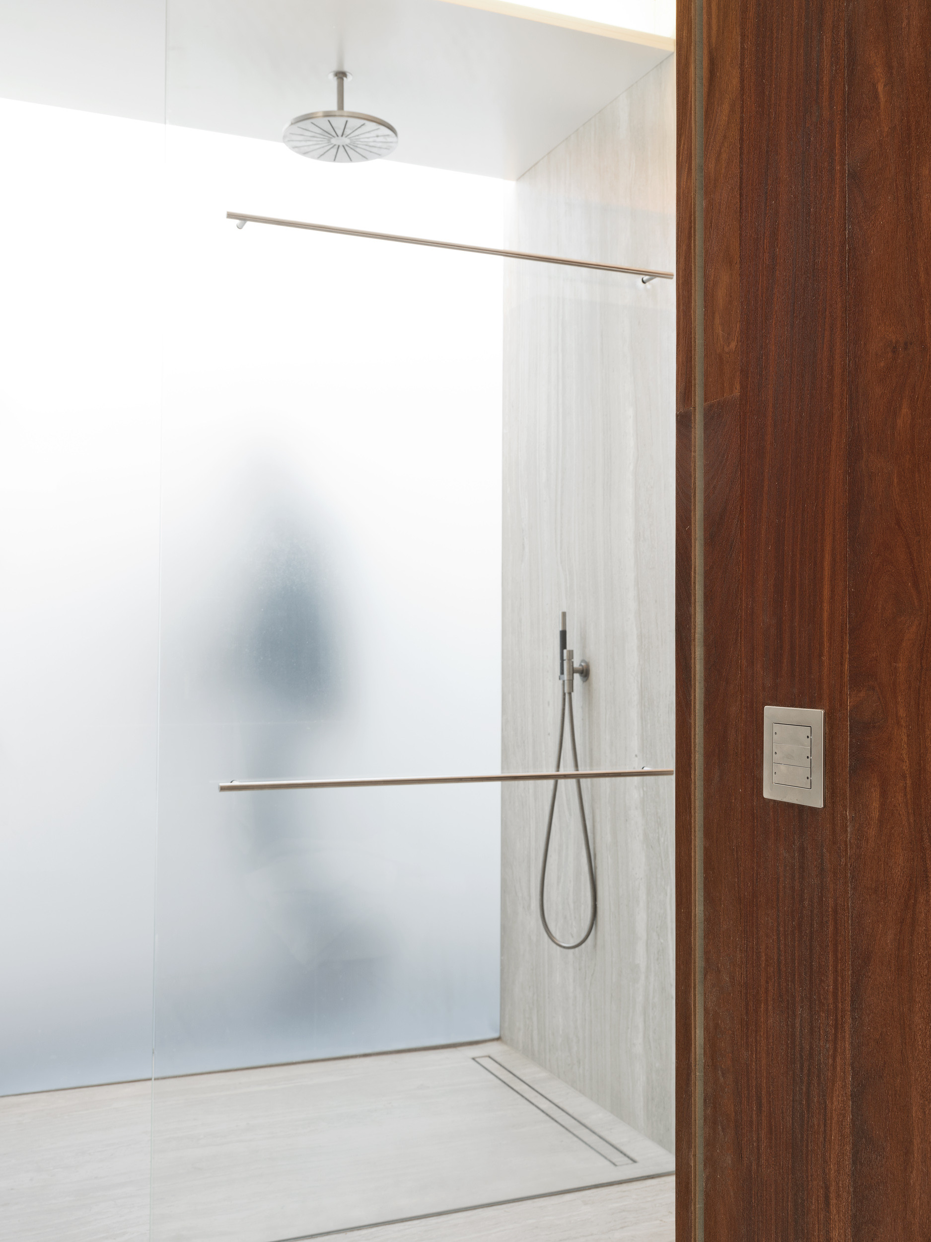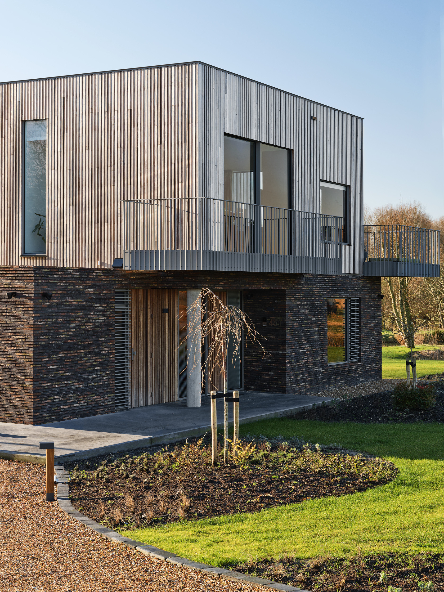 Het woonhuis bestaat uit twee krachtige blokken welke op elkaar zijn geplaatst en worden verdeeld door de vrijdragende terrassen. Ieder blok heeft haar eigen tactiliteit en detaillering, maar samen met de horizontale belijning vormen ze ook een krachtig geheel. Ruw in combinatie met gestylleerd.
