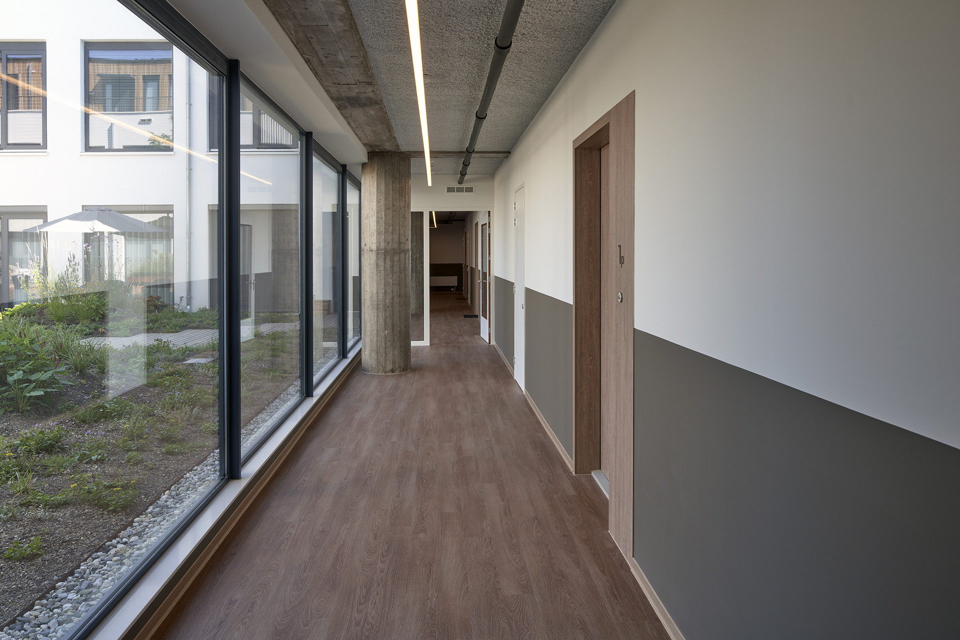 Op de begane grond bevinden zich de hoofdingang, commerciële ruimten en de fietsenberging. In
