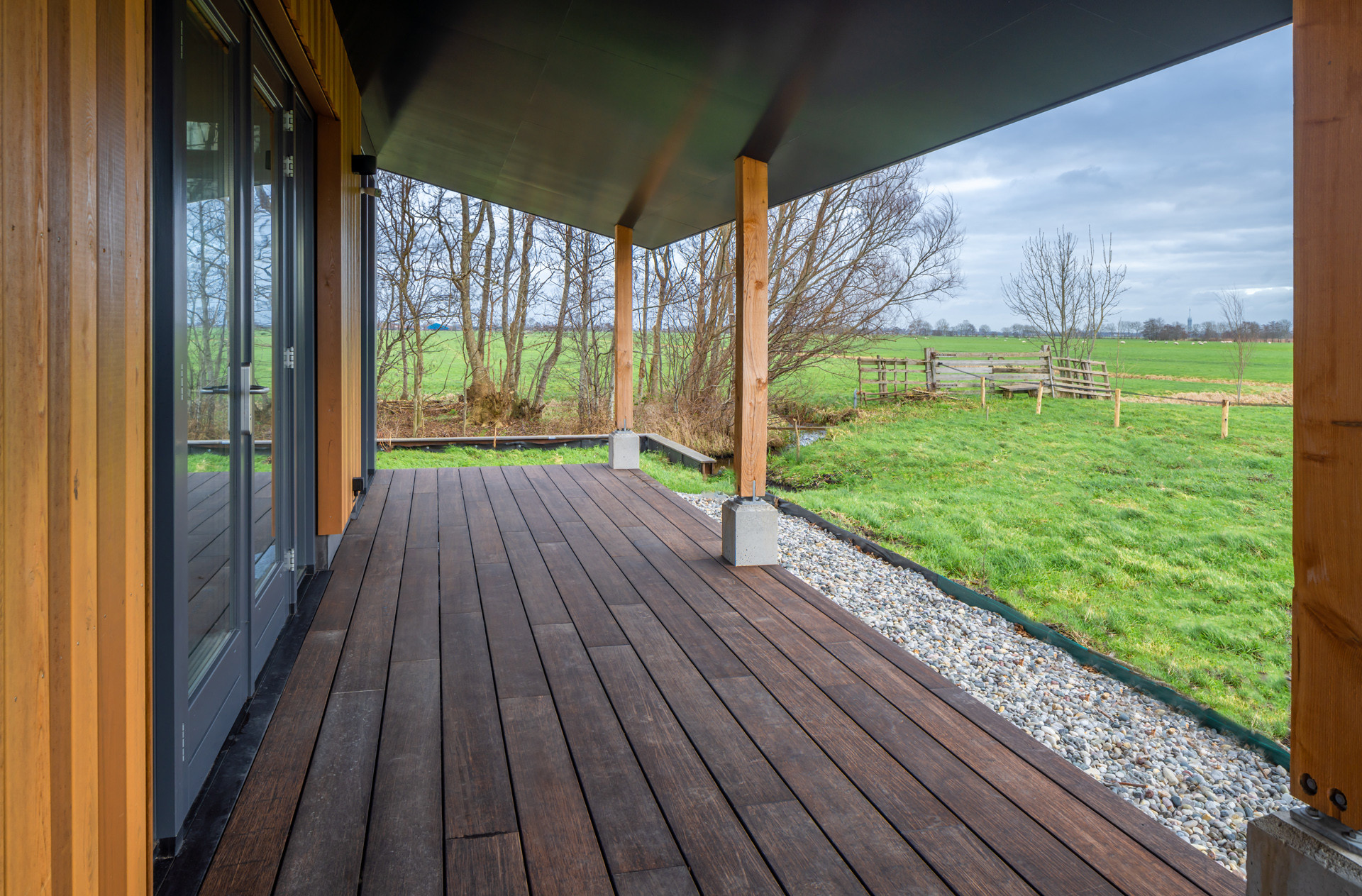De veranda is een verlengstuk van de woonruimte tijdens de verschillende seizoenen. Zelfs op regenachtige dagen kun je op je luie stoel, met je (blote) voeten op de bamboe vlonder zitten, onder het dakoverstek. Zo kun je genieten van het geluid en het lichteffect van de regendruppels, die van het dak glijden als een waterval, in de grindstrook. Tijdens de lange zomerdagen is de veranda een ideale plek om beschut buiten te zitten en te genieten van het uitzicht.