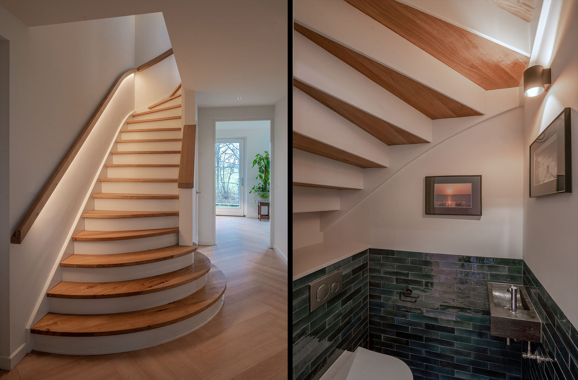De riante trap is een blikvanger, wanneer je het huis binnenkomt en daarnaast handig in gebruik. Door de grote ronde treden loop je heel makkelijk vanuit de woonkamer, via de hal, naar boven. Onder de trap bevindt zich een toilet, met de eiken traptreden als plafond in het zicht.