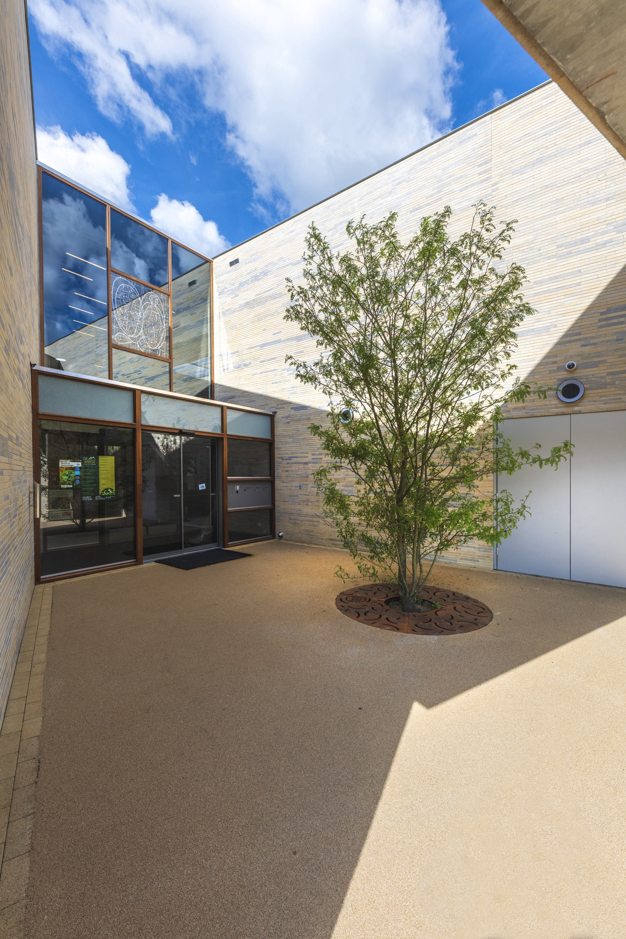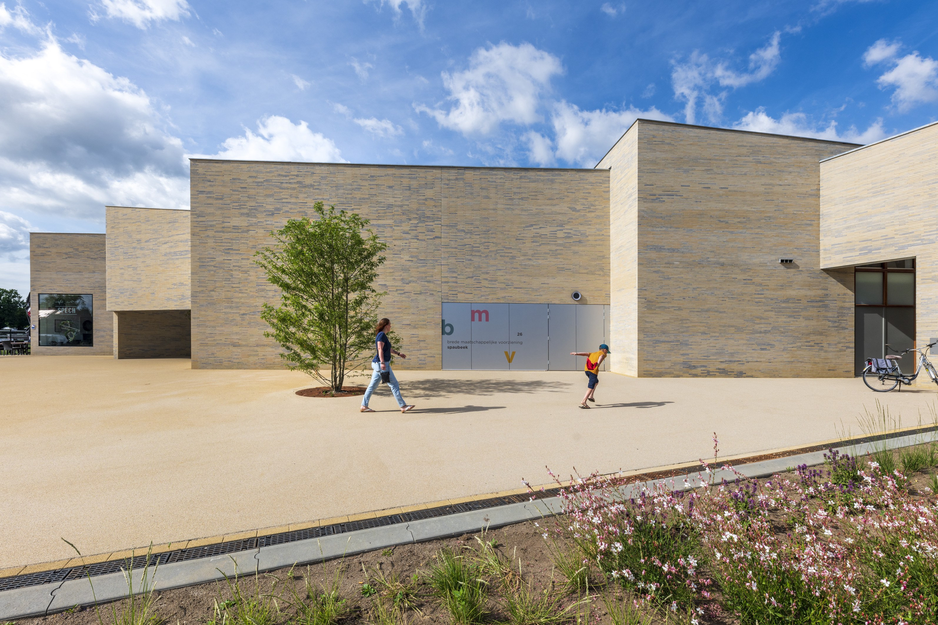 Limburg is oud cultuurland, vanaf de Romeinen die bouwden met lokale kalksteen tot de langs de Maas geïntroduceerde Barok met het brede gebaar, eigen aan de Limburger (Bouwen in Limburg – Vereniging Ons Limburg). Nieuwe architectuur die voorkomt uit deze rijke historie zal een ‘verbinder voor allen’ kunnen zijn. Zoals de vertrouwde Limburgse boerderij met stoere volumes rond een centrale cour, veelal introvert met enkele grote (poort)openingen en ramen waar nodig. De nieuwe BMV integreert tal van deze ‘specifieke’ kenmerken in een meer ‘generieke’ vormgeving. Een schijnbaar willekeurig ensemble van losse gebouwen herinnert aan het boerenhuis met schuren, maar biedt tegelijkertijd herkenbare gebouwdelen voor iedere afzonderlijke gebruiker. Maar zoals bij de witgekalkte boerengevels, voegen wij door toepassing van één materiaal de losse delen weer samen tot een ensemble. ‘Eenheid in verscheidenheid’ door gebruik van uniforme Limestone gevelstenen o.b.v. restfracties van de lokale Kunradersteen zelf ontwikkeld met MBI. Een houten lambrisering en gevlinderde betonvloer zijn zowel huiselijk als praktisch.
