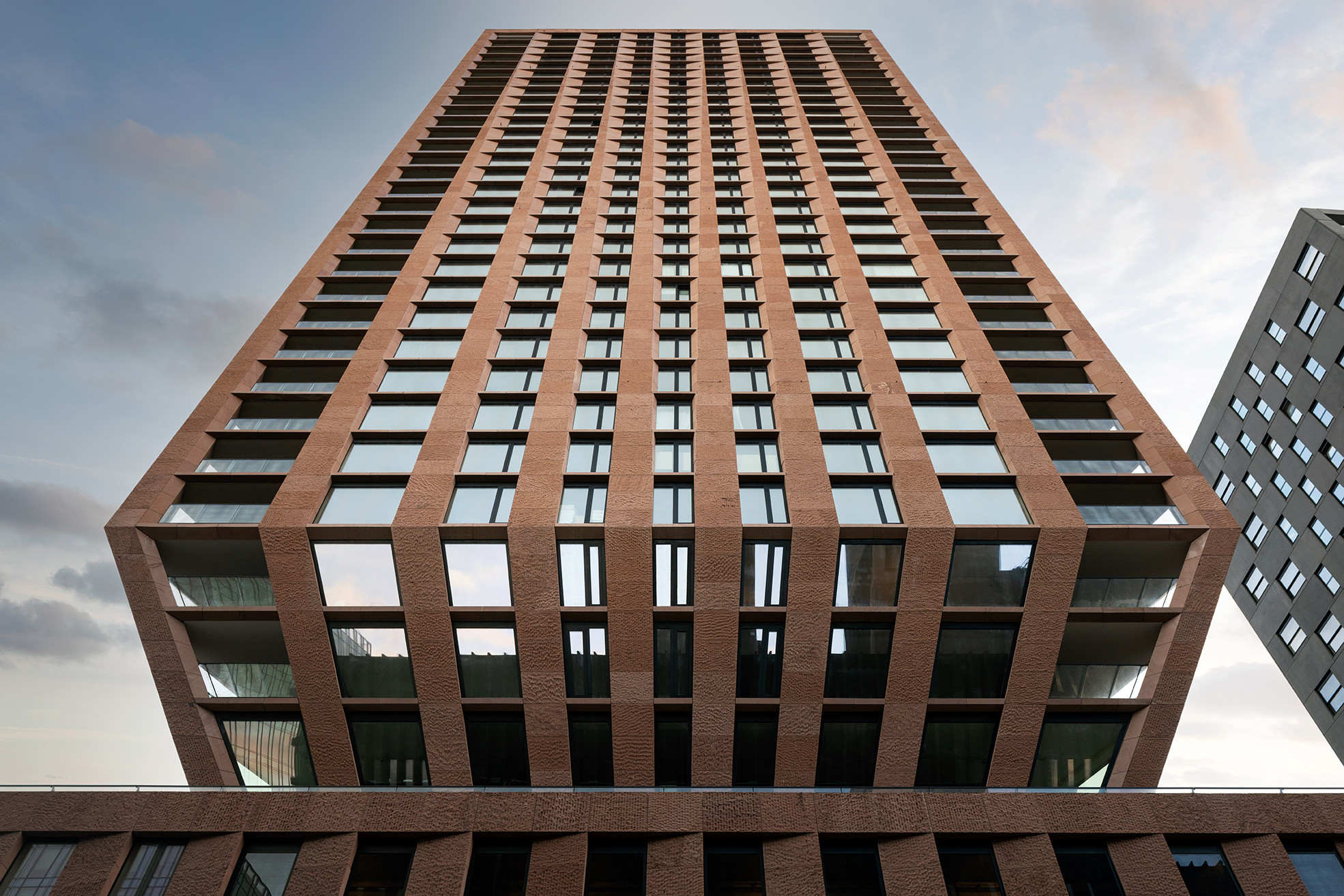 Het idee van het beeldhouwen van een toren komt ook tot uitdrukking in het gevelontwerp. Handgekapte panelen van roodbruin natuursteen (Neckartäler Hartsandstein) geven de toren een ambachtelijk en warm karakter. Het sterke reliëf in de steen geeft met veranderend licht steeds weer een nieuwe uitstraling aan het gebouw. Richting de top van de toren krijgen de panelen steeds bredere gladgepolijste afvlakkingen. Op subtiele manier transformeert het gevelontwerp tot aan de top van het gebouw.