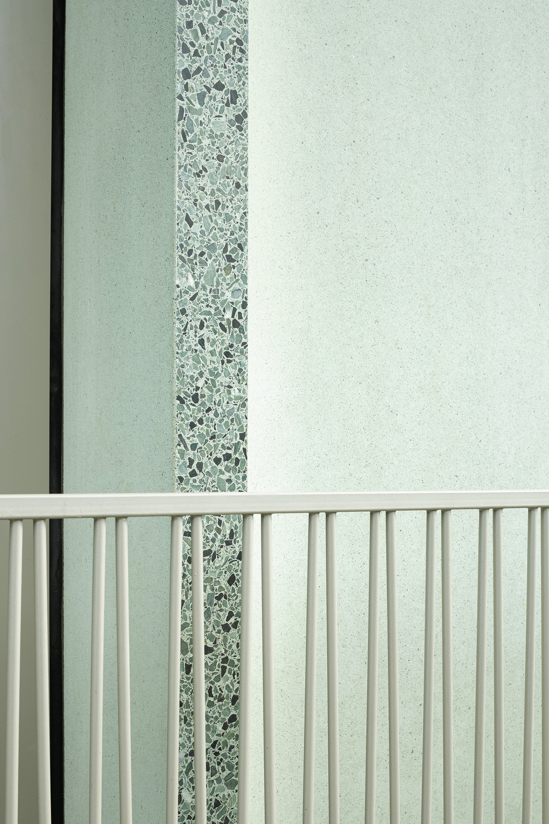 De heldere architectuur wordt versterkt door de toepassing van één enkel materiaal: lichtgroen beton. Het lijnenspel tussen de horizontale banden en penanten van het zachtgroene materiaal onderscheidt De Jakoba verder van de omliggende gebouwen. Doordat de smalle uiteindes van de groene betonpanelen in één beweging konden worden gepolijst, hebben we op een eenvoudige manier de gevels de aantrekkelijke detaillering kunnen geven. De materialisatie wordt verrijkt met kozijnen en balustrades met een poedercoating in zilvergoud, die een warme gloed toevoegen. De subtiel gebogen pijlers creëren een wisselend spel van licht en schaduw gedurende de dag.