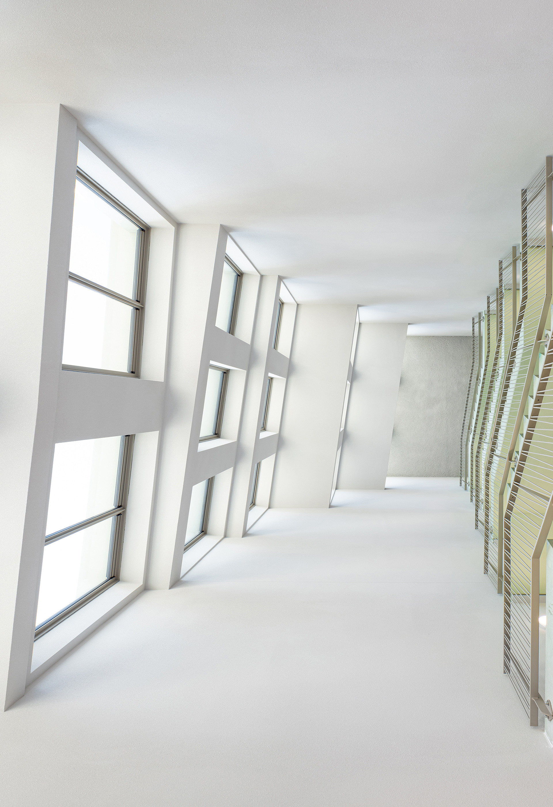 Binnen het rechtlijnige stedenbouwkundige plan voor Overhoeks – dat met zijn ‘campusachtige’ setting nogal on-Amsterdams is – hebben we een eigen interpretatie gegeven aan de gestelde regels. In het plan zijn voor de gebouwen setbacks gespecificeerd om de volumes vanaf het straatniveau te minimaliseren. We hebben van deze conditie gebruik gemaakt door het hele volume van De Jakoba naar binnen te buigen, waardoor het gebouw niet alleen op de bovenste verdiepingen, maar over de volledige hoogte en lengte verspringt en geleidelijk naar boven afbuigt. De vier verschillende gevels en de golvende balkons die zo ontstaan geven De Jakoba rondom haar herkenbare gezicht in de stadswijk.