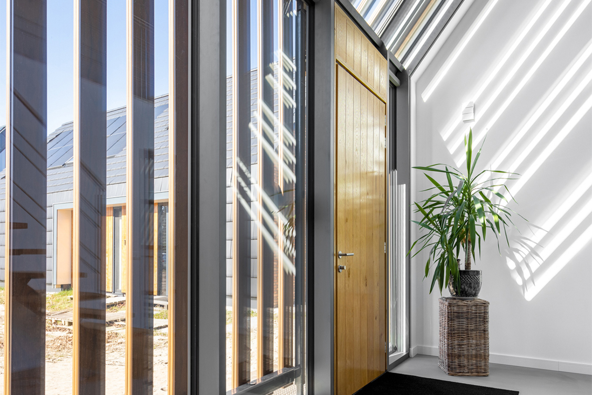 De woning is aan de hofzijde meer gesloten, waar deze zich aan de tuinzijde meer opent. Er is veel rekening gehouden met zichtlijnen vanuit de woning ten opzichte van de eigen tuin en het landelijke groen achter de woning.
