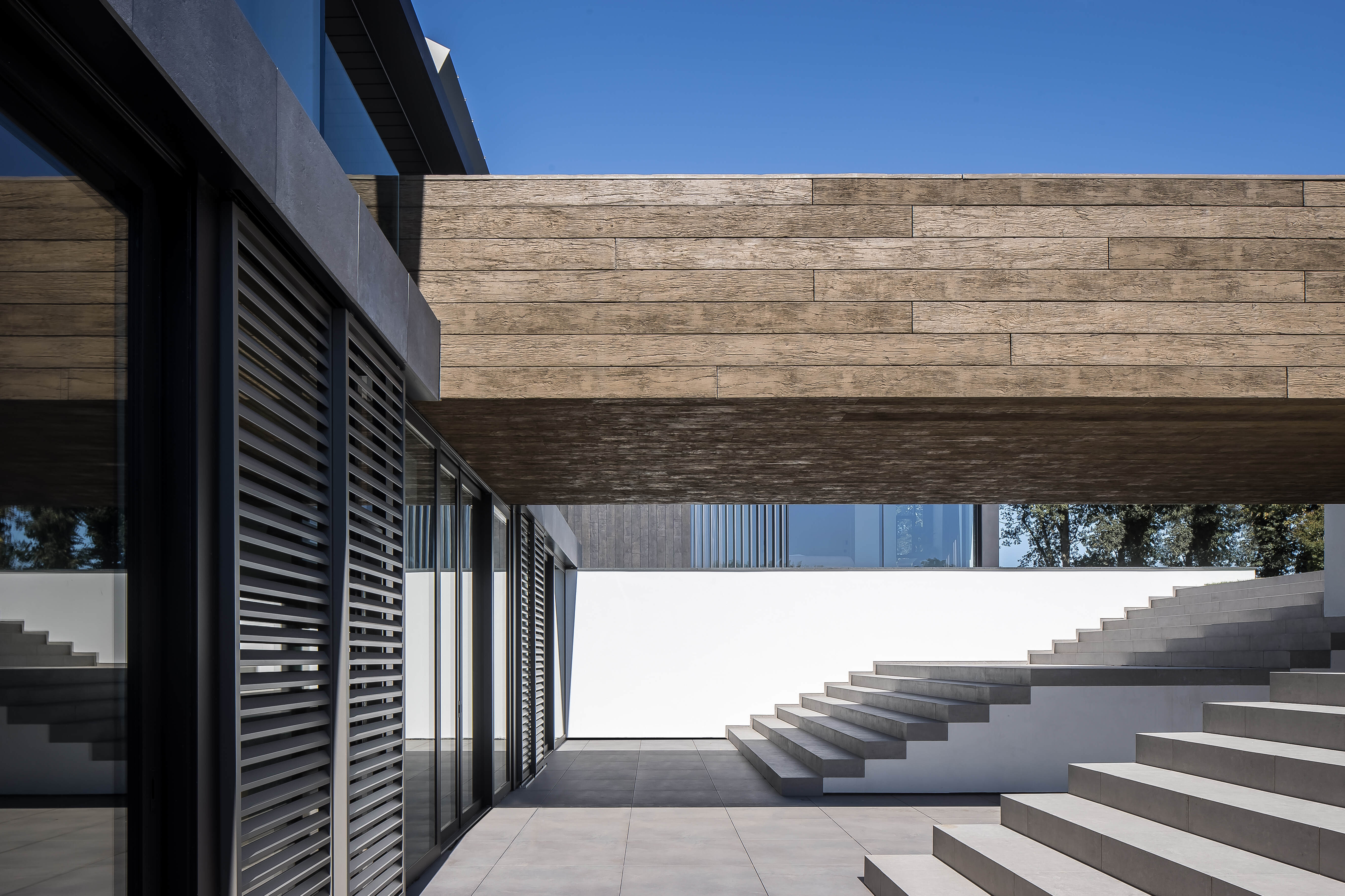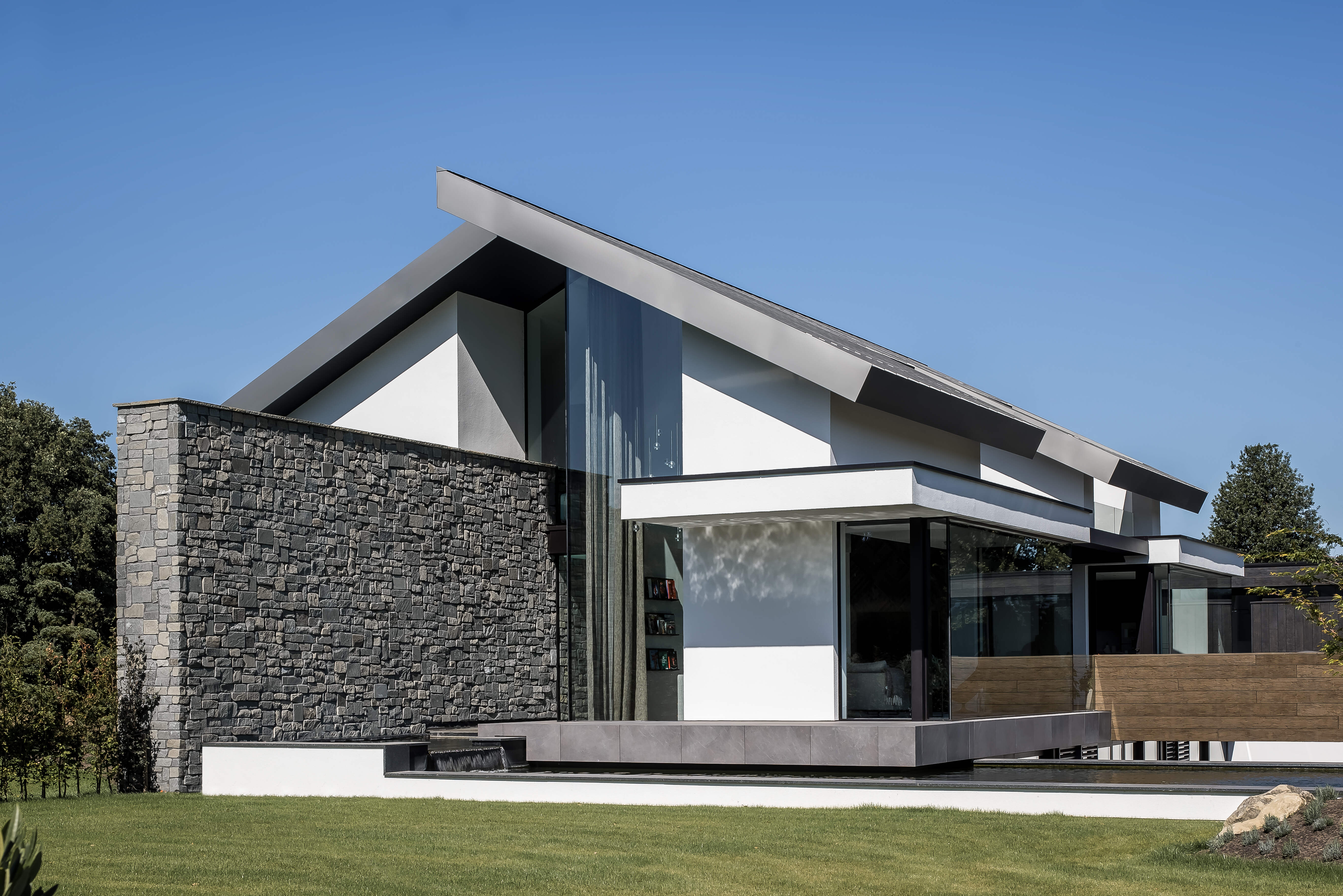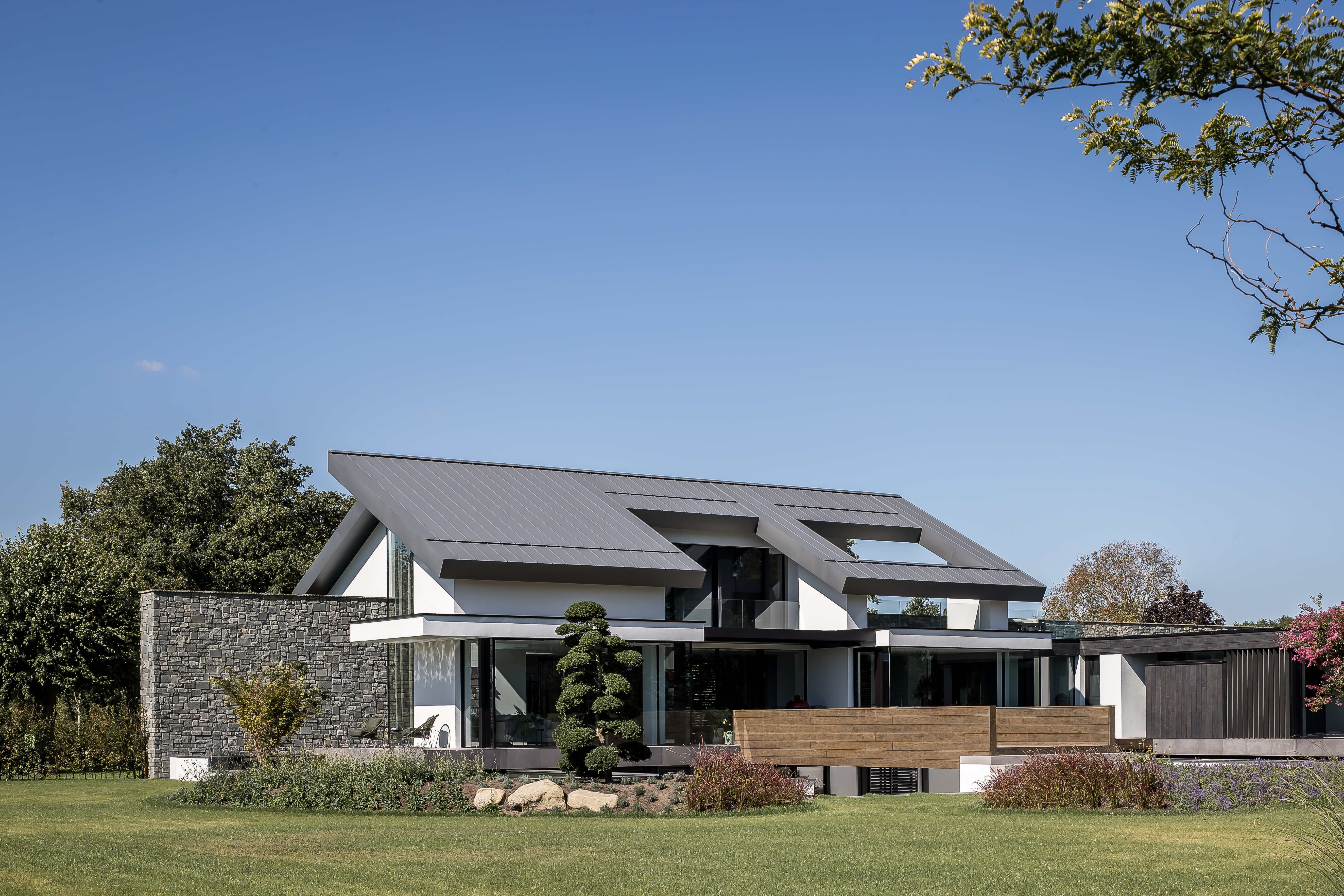 Het hoofdvolume, bestaande uit een samenspel van glad afgewerkte witte wanden en een grote minimaal gedetailleerde glazen puien, afgedekt met een zinken zadeldak, staat op een weloverwogen plek, uit het hart van de iconische stapelwand. De plattegrond is op een stramien van 90x90cm opgebouwd, en heeft een middenlid met op de vier hoeken een uitstekende glazen binnenruimte. Op die manier ontstaan beschutte buitenruimten op de lange zijden van de woning.