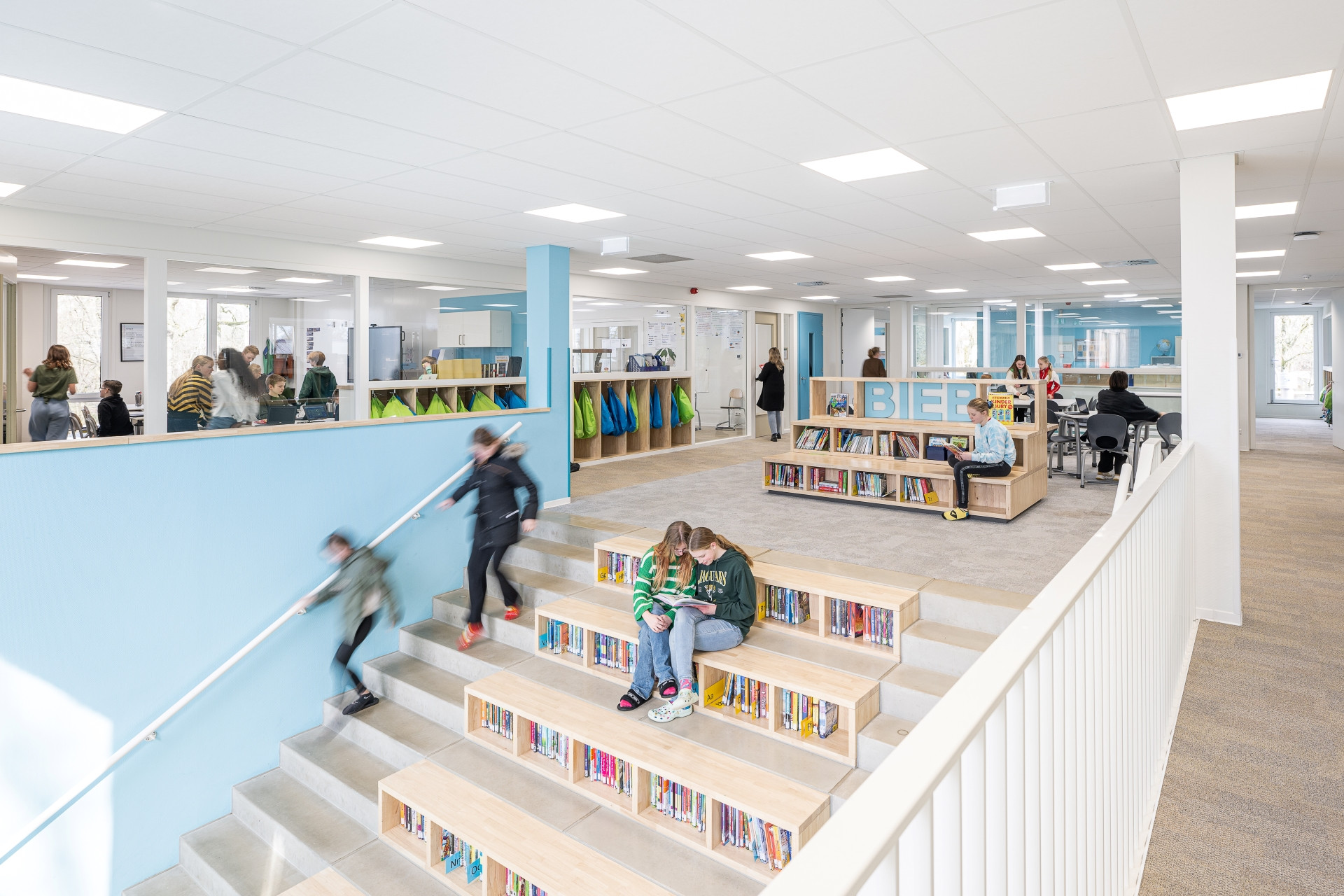 Ook de midden- en bovenbouw heeft een mooi open leerlandschap op de verdieping wat door middel van de tribunetrap met de begane grond wordt verbonden. Deze tribunetrap heeft een dubbelfunctie, het is namelijk ook de bibliotheek. Het leerlandschap ligt tussen de lokalen en heeft verschillende werkplekken waar kinderen alleen en in groepjes kunnen leren en werken. De gehele bovenverdieping is voorzien van tapijt, dit zorgt voor een bijzonder prettige akoestiek wat ten goede komt van de leerprestaties.
