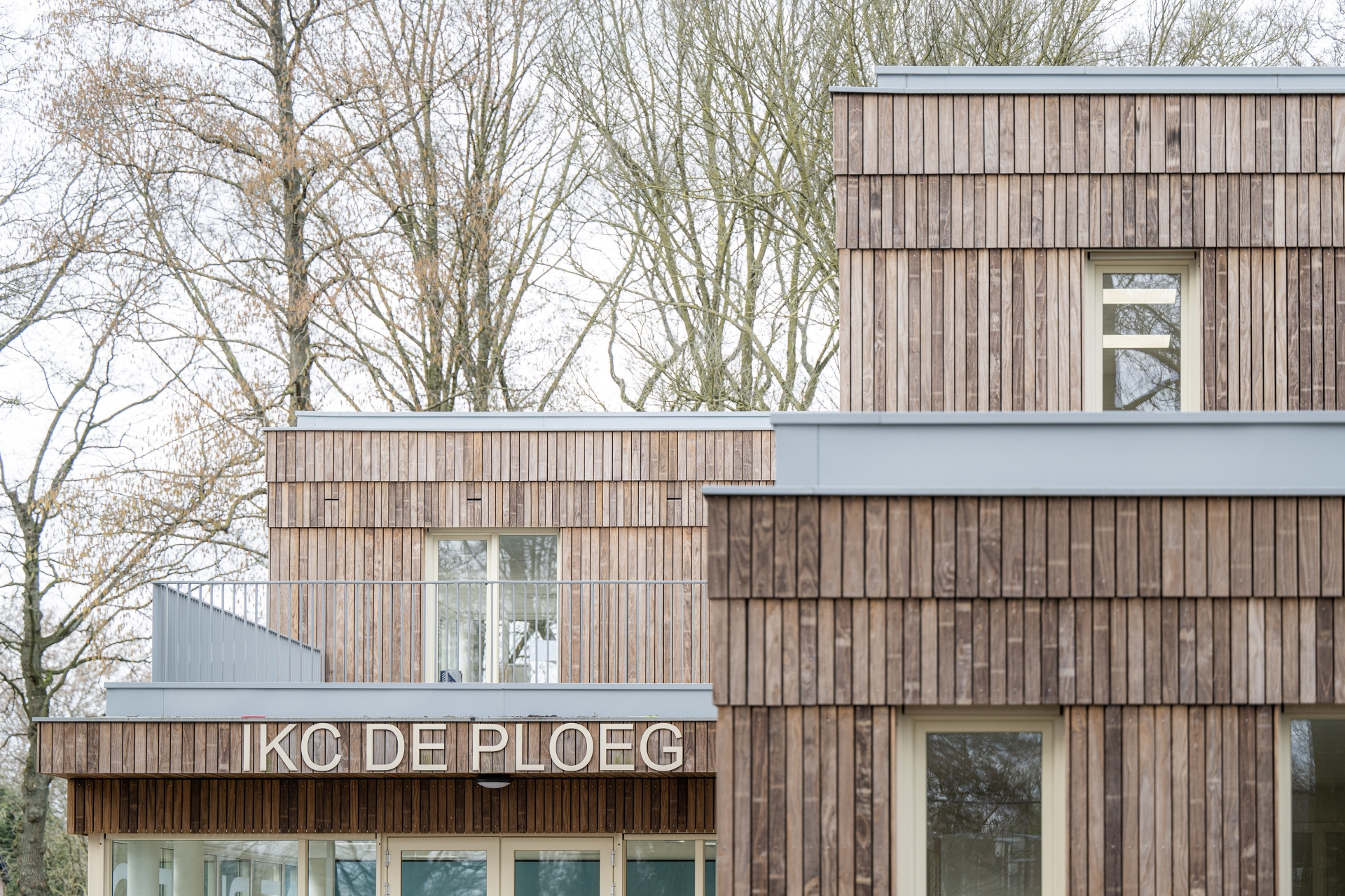 Het schoolgebouw van De Ploeg staat gedeeltelijk tussen de bomen. Daar waar het gebouw de bomen benadert is de entree. Het gebouw bestaat uit twee lagen waarbij de tweede laag kleiner is en er een mooie volume opbouw ontstaat en er ruimte is voor een dakterras.