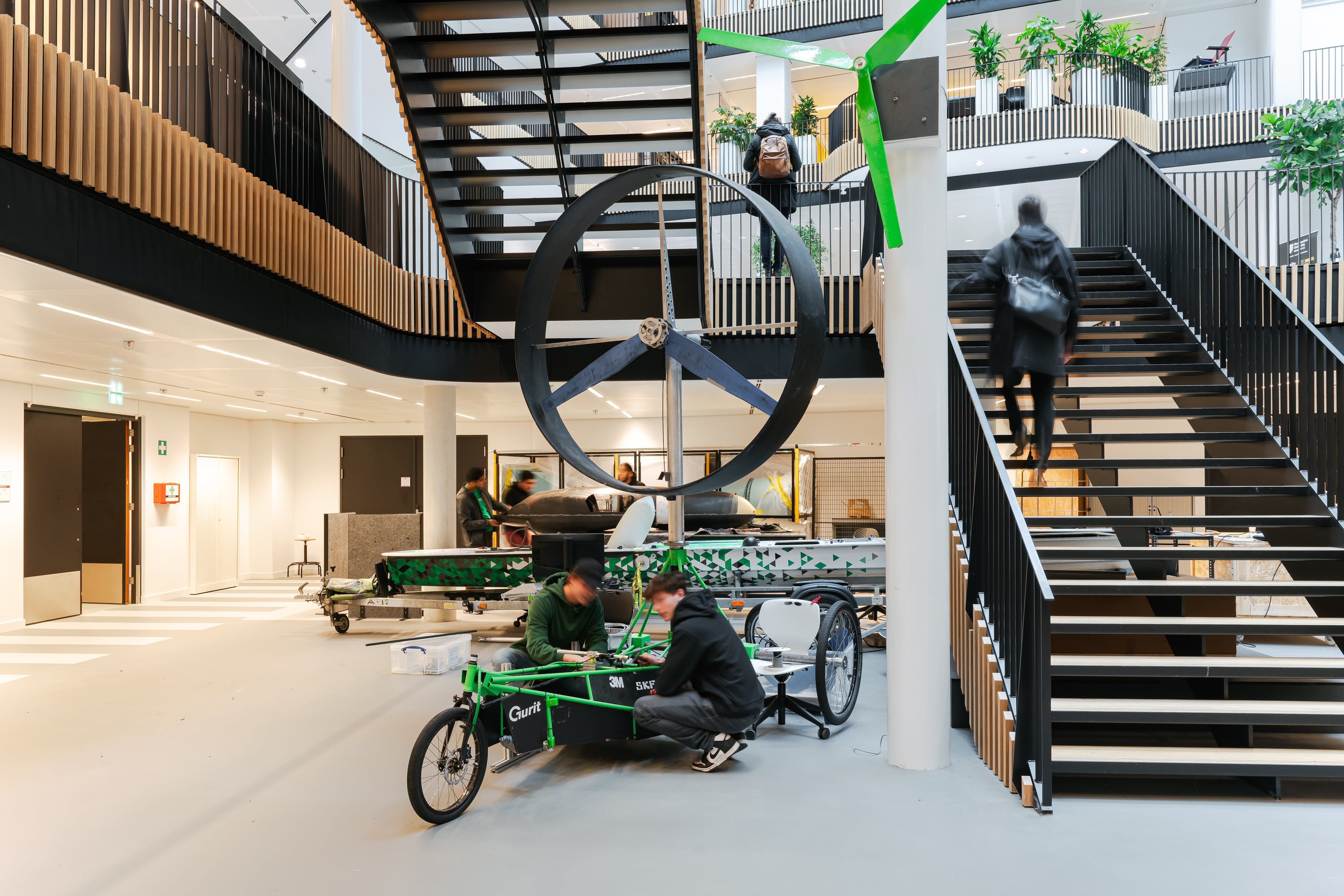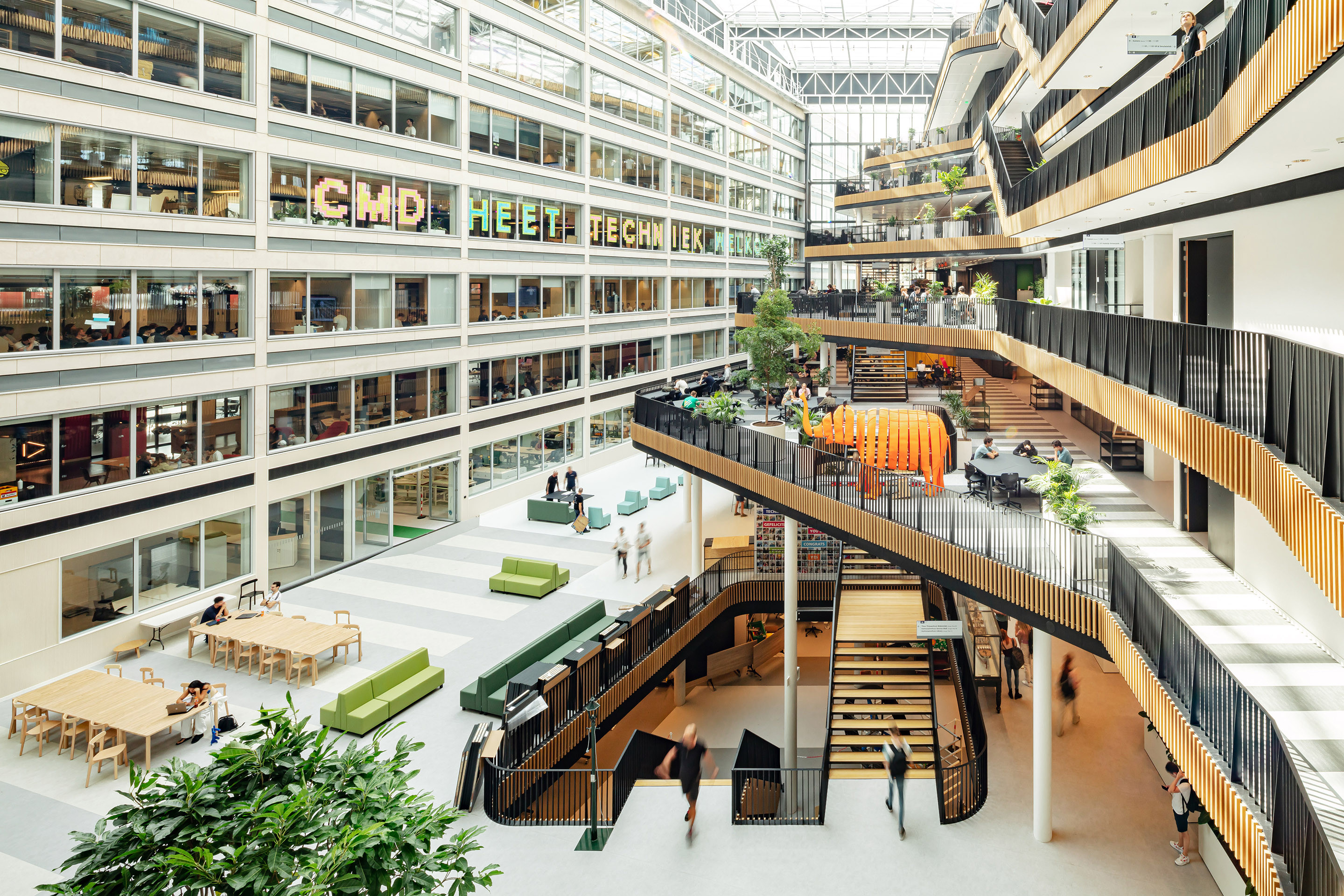 Het ontwerp van Jakoba Mulderhuis gaat over cross-over stimuleren in een open, creatieve omgeving. Projectruimtes worden gefaciliteerd in de vorm van studio’s waar alle noodzakelijke methodiek, expertise, machines en kennis aanwezig is. Studio’s, zoals bijvoorbeeld voor sensortechniek, BIM & virtual reality of energietransitie, zijn verspreid door het hele gebouw. Op deze manier ontstaat ruimte voor verrassende innovaties, waarmee de HvA kan bijdragen aan de oplossing van vraagstukken van de toekomst. Het gebouw is toegespitst op een onderwijsvisie waarbij er projectmatig wordt gewerkt, er minder hoorcolleges zijn en studenten werken in communities. De labs en mixed zones zijn te vinden in de laagbouw en de weinige ‘traditionele’ klaslokalen voornamelijk in de hoogbouw. Door de flexibele opzet van de hoofddraagstructuur met grote overspanningen tussen de kolommen, verplaatsbare binnenwanden en slimme installaties kan het interieur eenvoudig worden aangepast aan veranderende manieren van onderwijs. Docenten kunnen ruimtes ‘customizen’ met een mix aan ruimtelijke opstellingen, zoals groepswerk aan tafel eilanden, labs, concentratieplekken en ontmoetingsplekken.