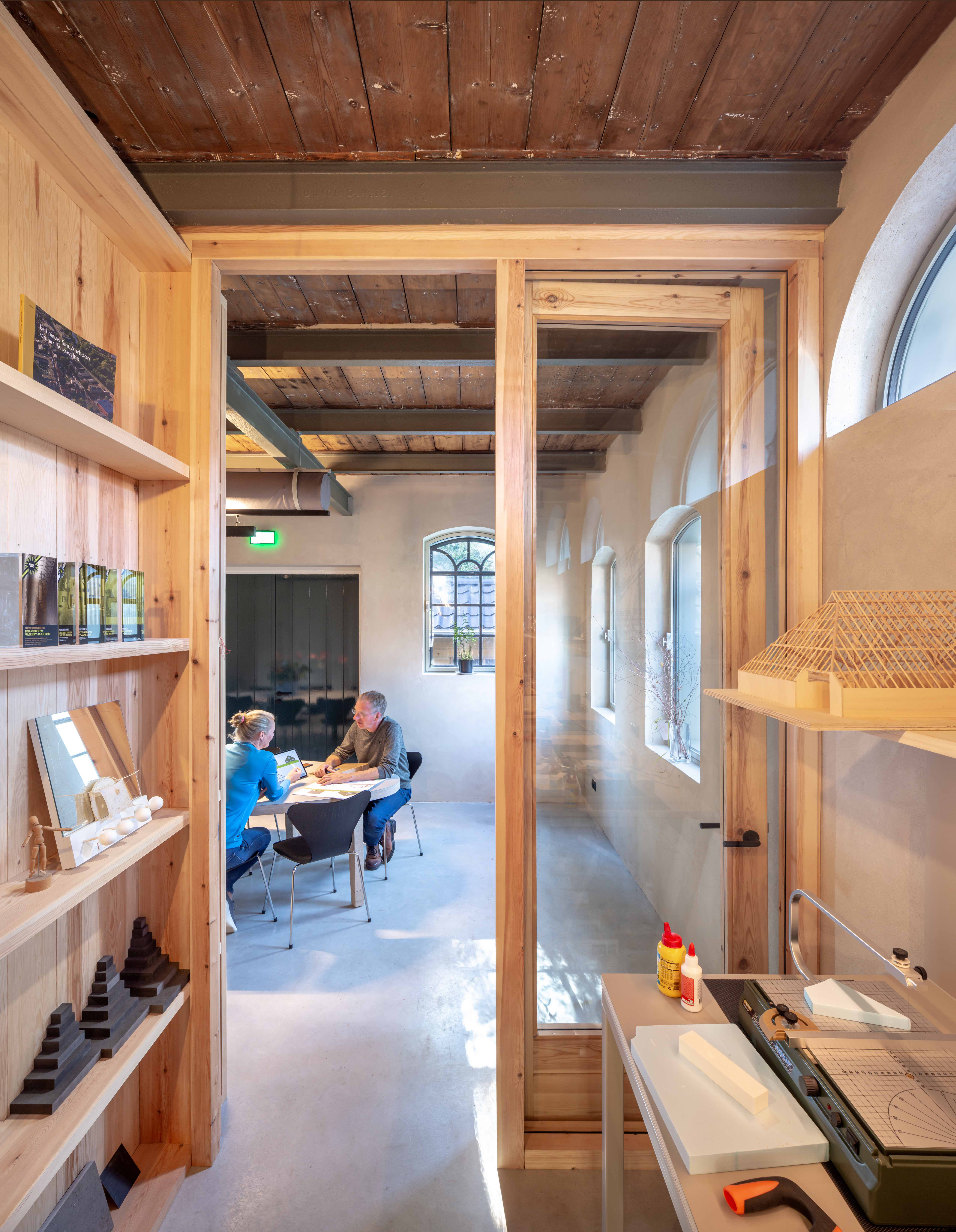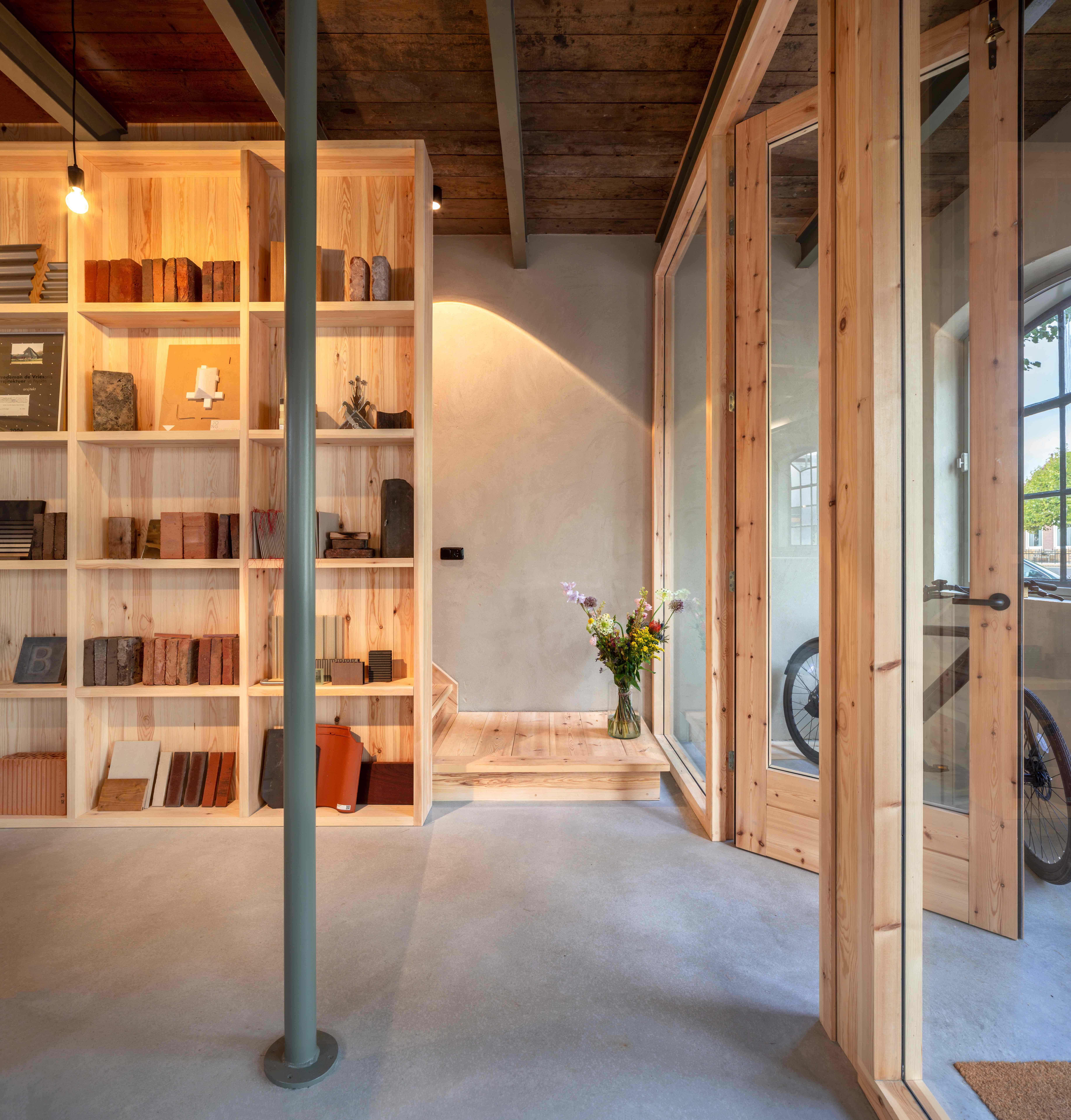De sfeer van de werkplaats is behouden door ook voor nieuwe materialen de imperfectie en de eenvoud te omarmen. De steens muren op de begane grond zijn aan de binnenzijde geïsoleerd en afgewerkt met leemstucwerk. De kleur en ruwheid doen denken aan cement stucwerk zoals het oorspronkelijk ook in deze werkplaats was toegepast.