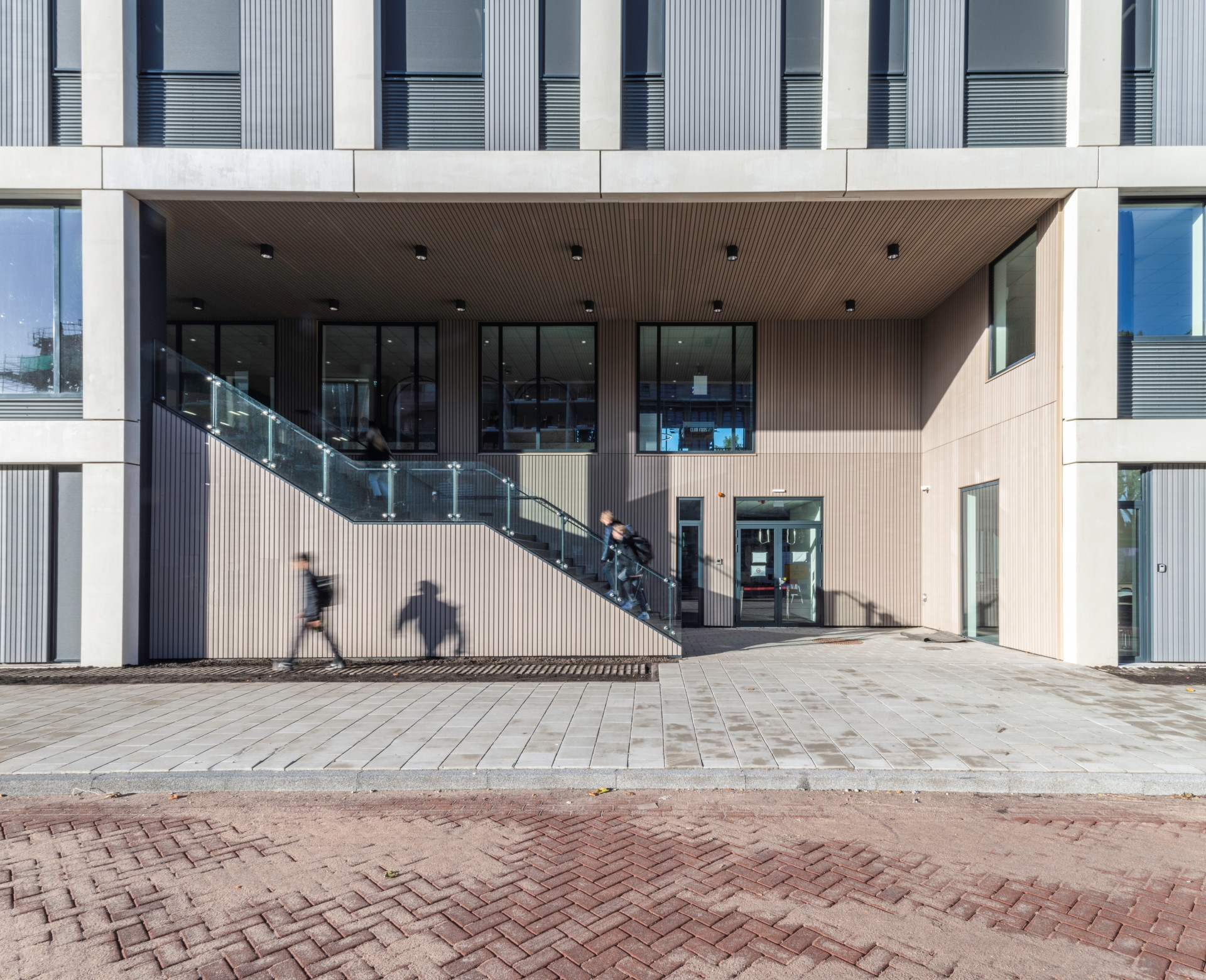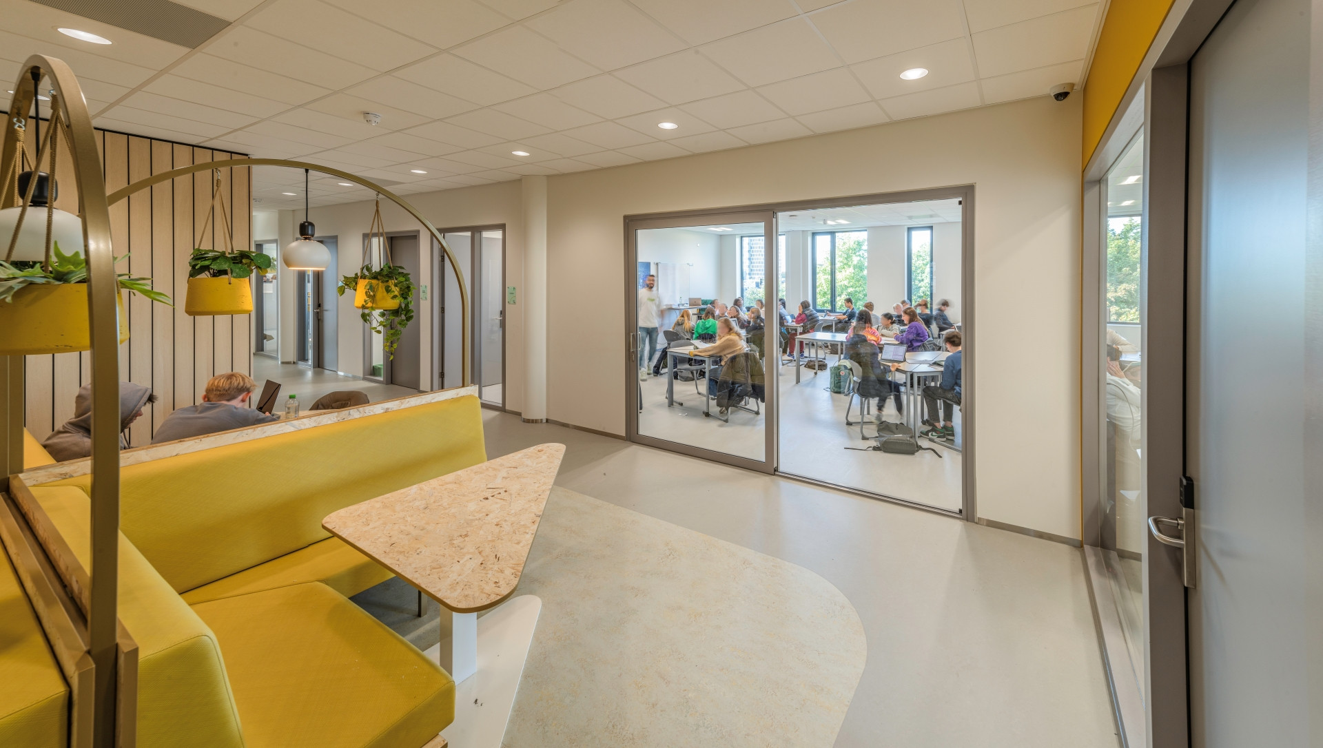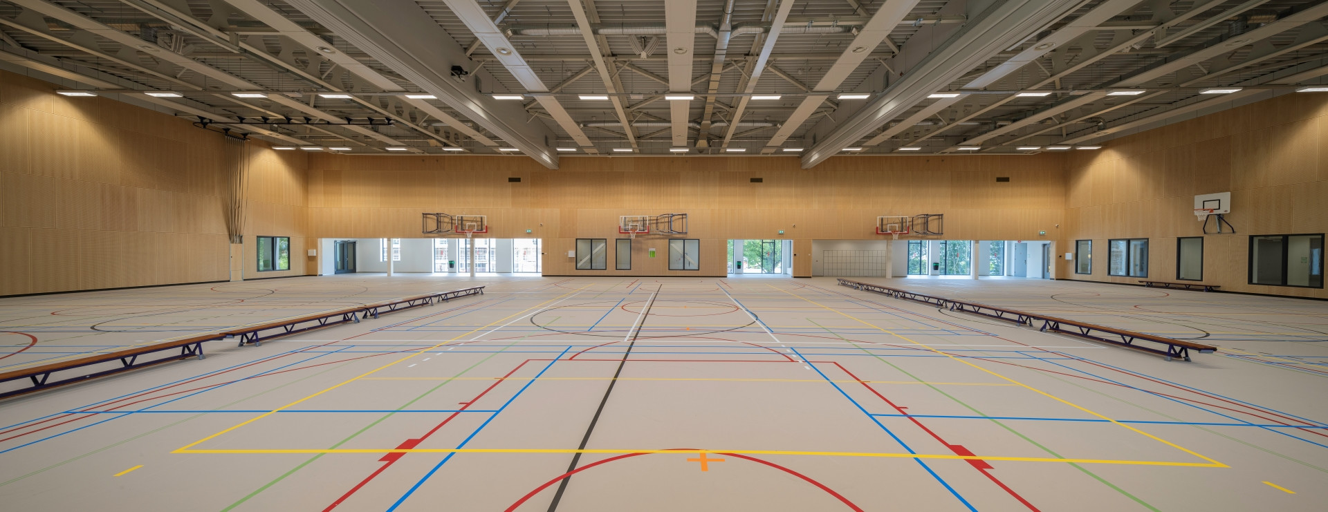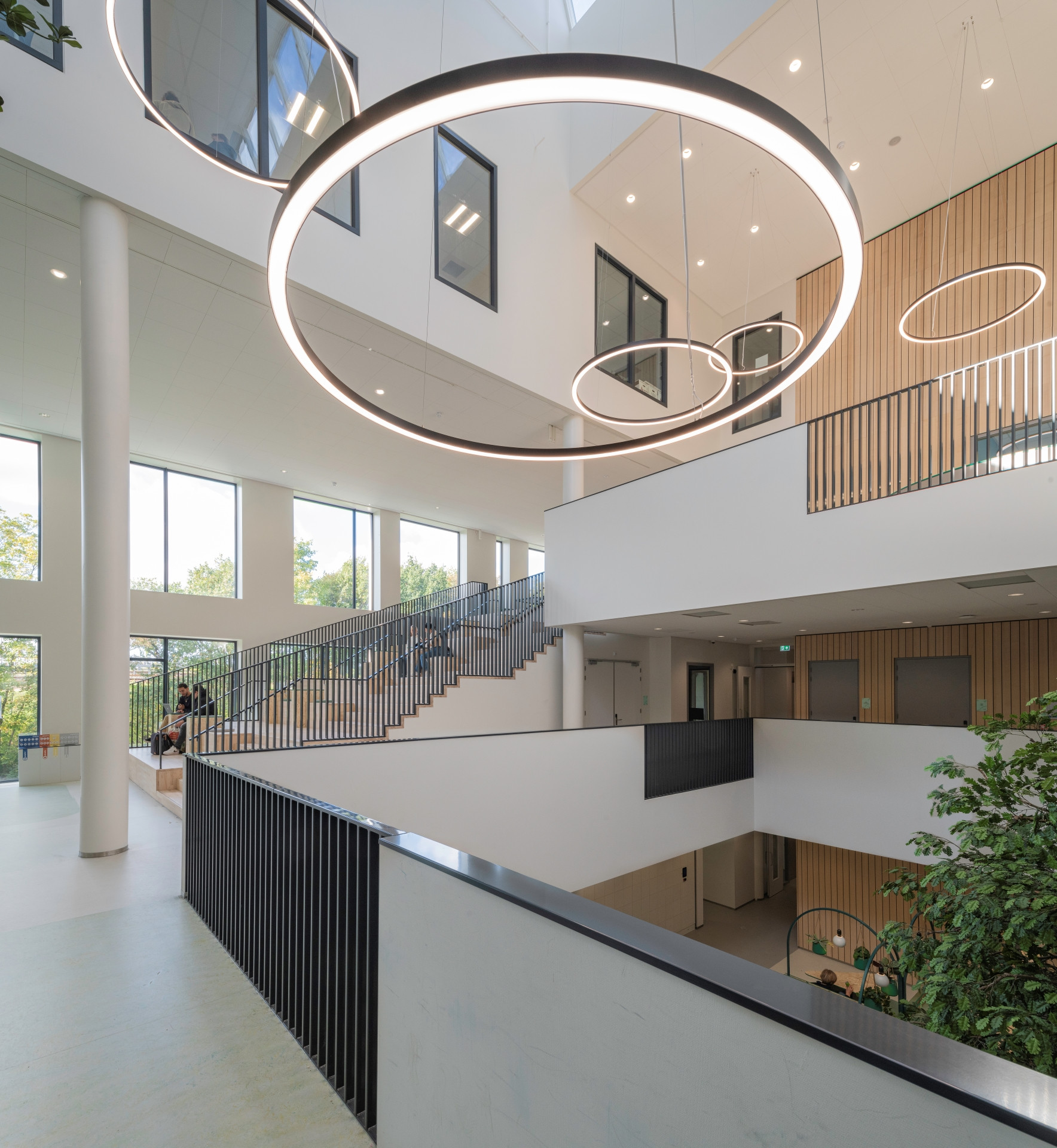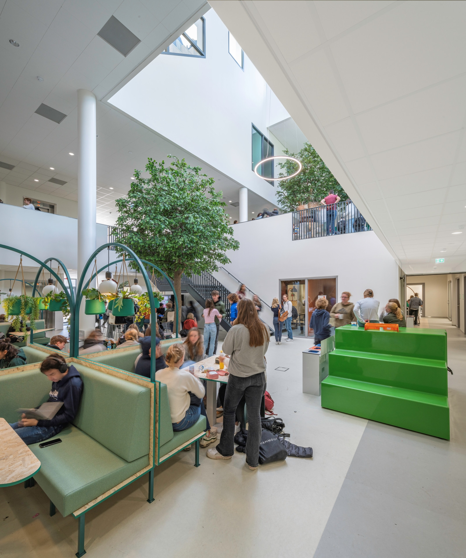 We ontwierpen de nieuwbouw van het Spinoza20first Daltonlyceum met sporthal en jongerencentrum binnen het stedenbouwkundige masterplan van OMA. Omdat de locatie krap was in relatie tot het programma, moesten we voor de school de randen opzoeken en hadden we de maximale bouwhoogte nodig. Via de entree op de eerste verdieping kom je in het hart van de school, met receptie en aula, van waaruit je een visuele verbinding hebt met de sportzaal. De sportvoorziening heeft drie koppelbare zaaldelen en een dojo. Grote bomen in de vides begeleiden de route door het gebouw. De toegepaste materialen passen in een duurzaam en toekomstbestendig interieur.