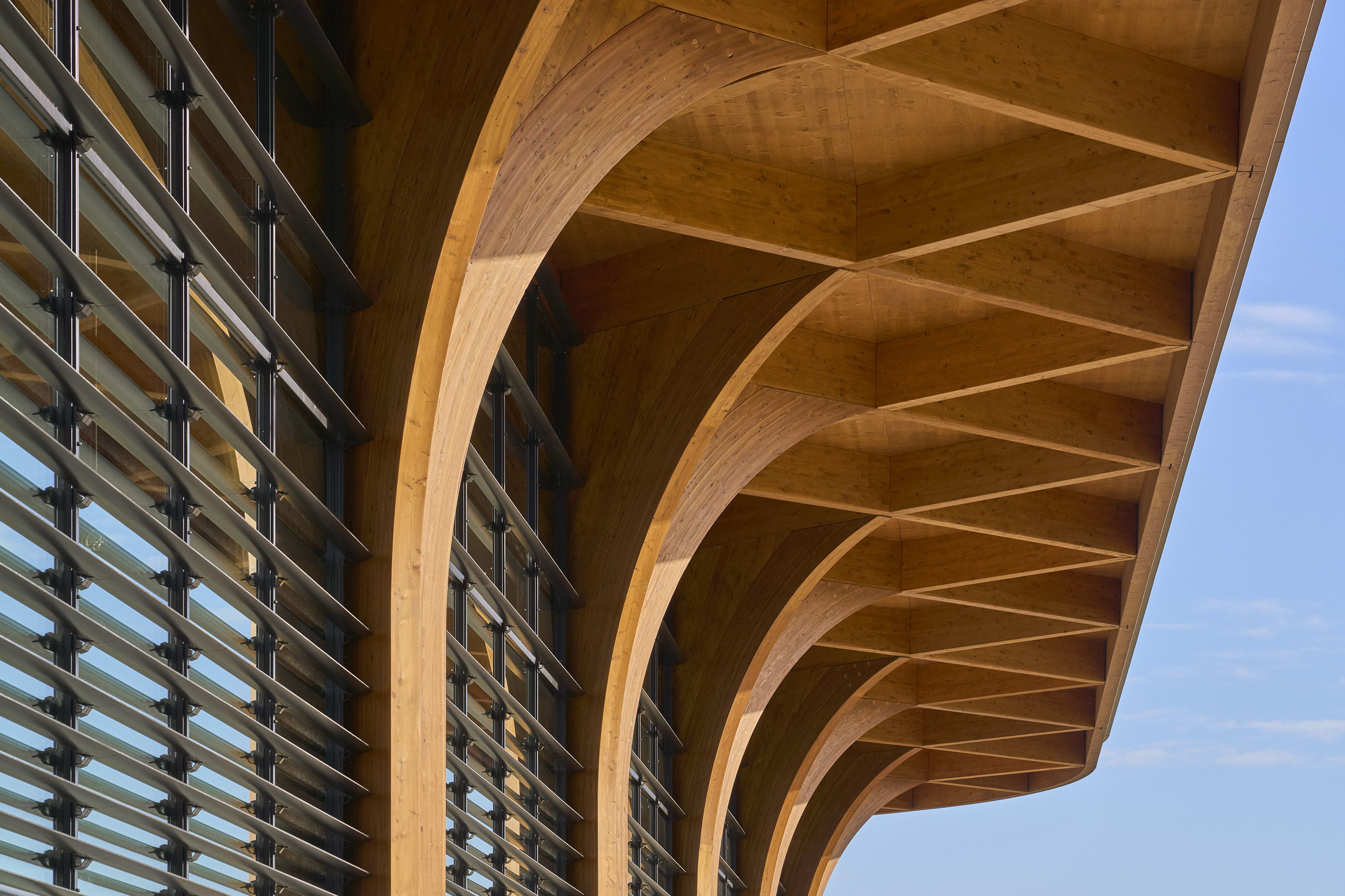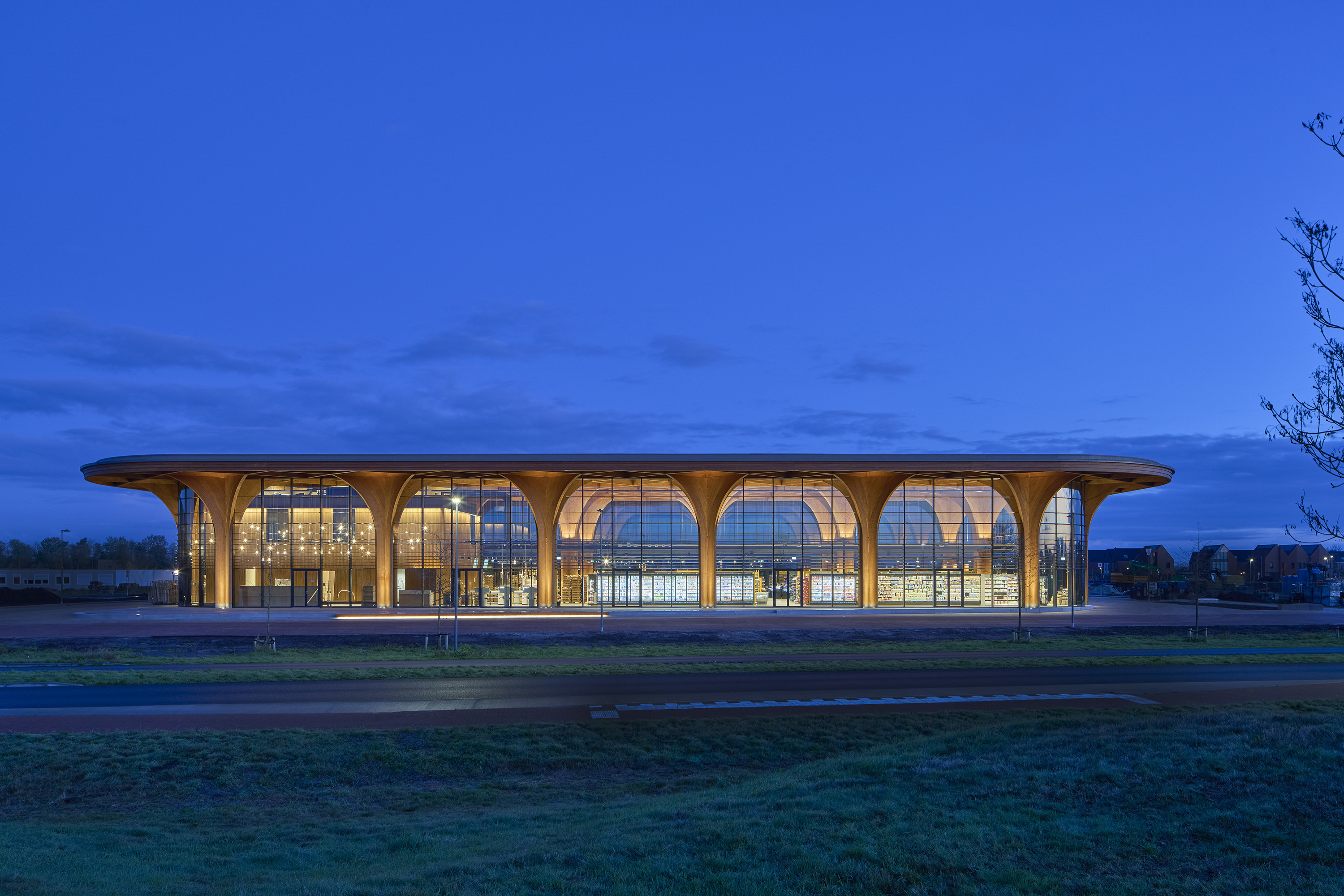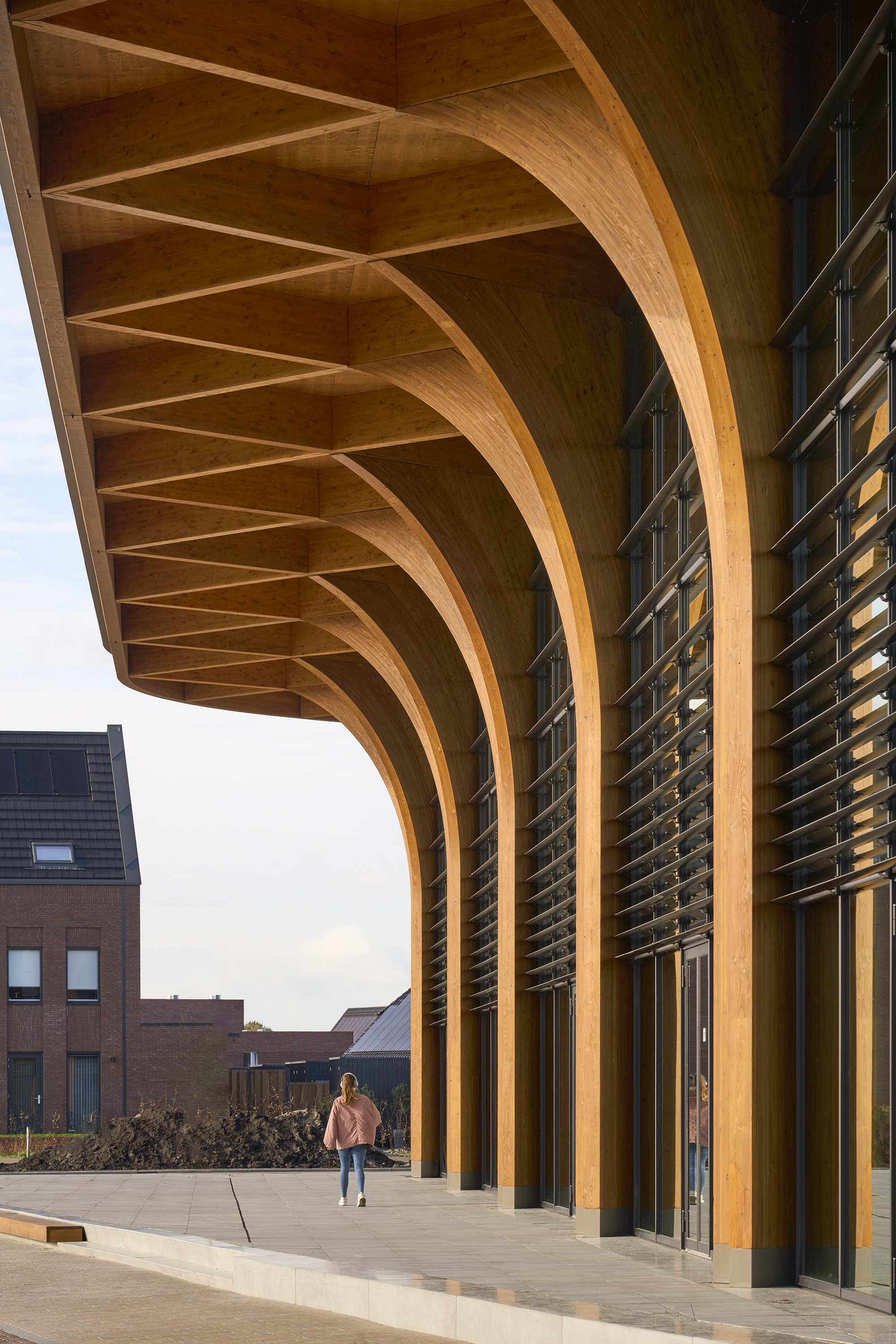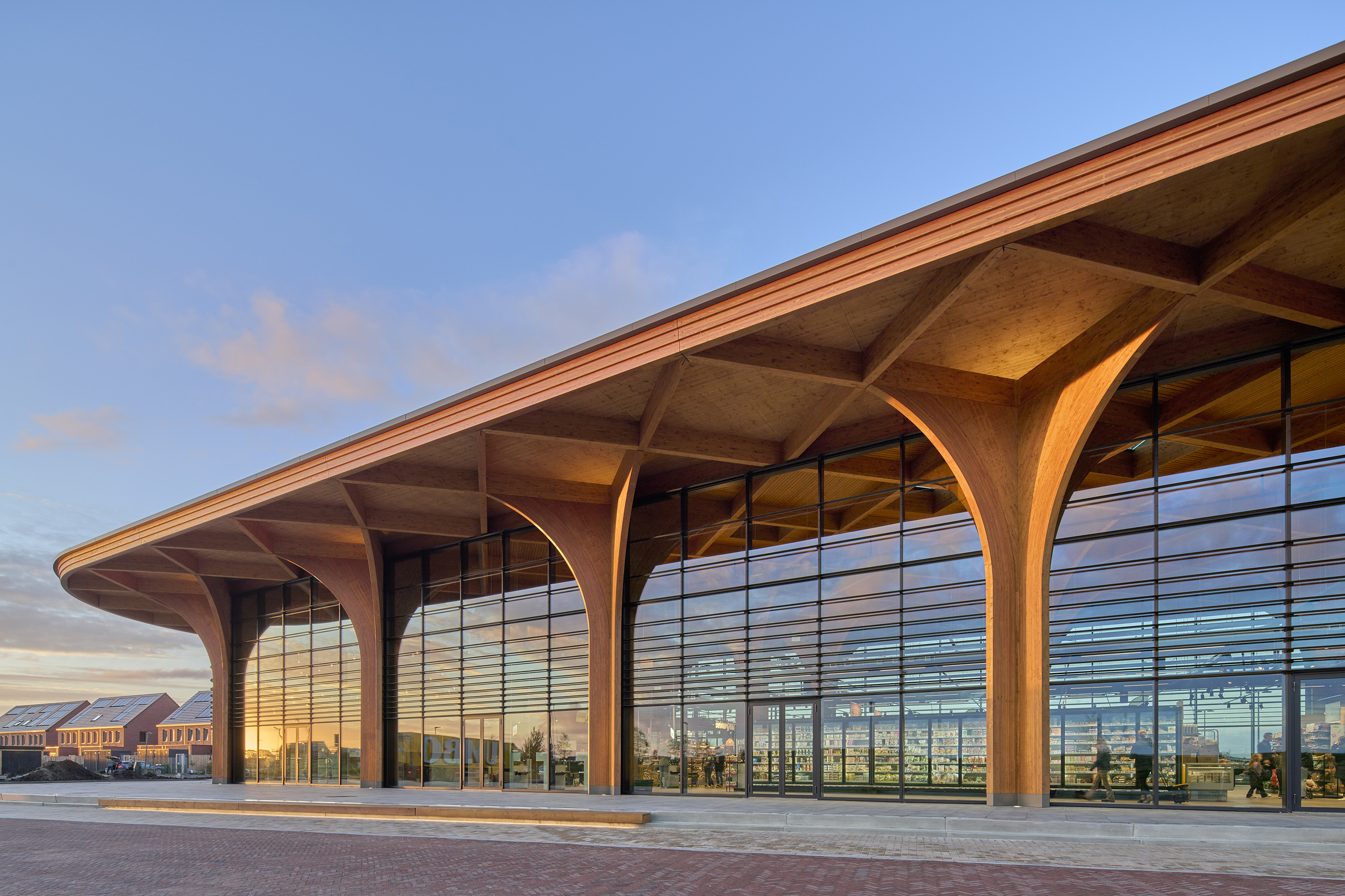 Het ontwerp is een circulaire uitvoering van de klassieke, grote, transparante markthal en heeft een volledig in hout uitgevoerde draagconstructie. De kruisvormige houten kolommen en balken in het dak zorgen voor een kathedraalachtige uitstraling. De grote overspanning en een plafondhoogte van negen meter zorgen voor een licht en ruimtelijk effect. Beeldbepalend is de grote luifel van meer dan vijf meter die als zonwering functioneert en met zijn elegante zuilen en netvormige houten spanten uitreikt naar de groene omgeving. Daarnaast zorgen de kruisvormen voor stabiliteit waardoor er geen extra windverbanden nodig zijn. Het gebruik van hout zorgt tevens voor een positieve klimaatimpact.