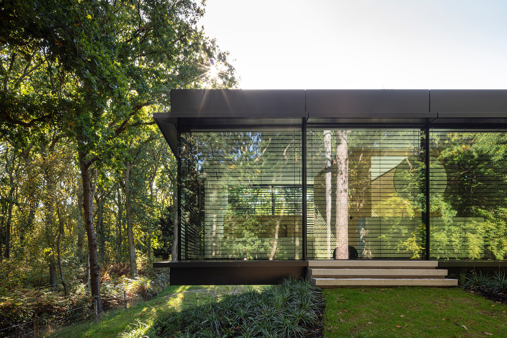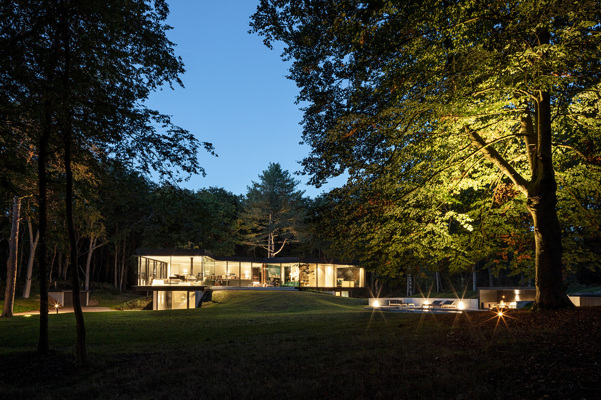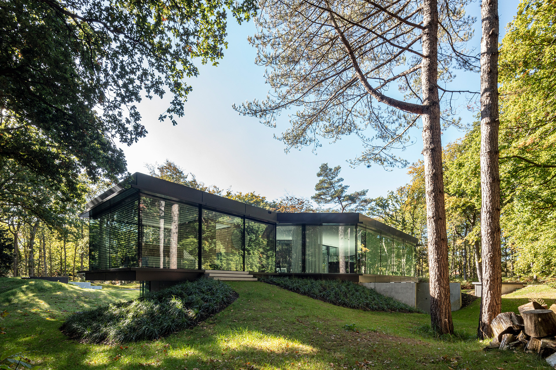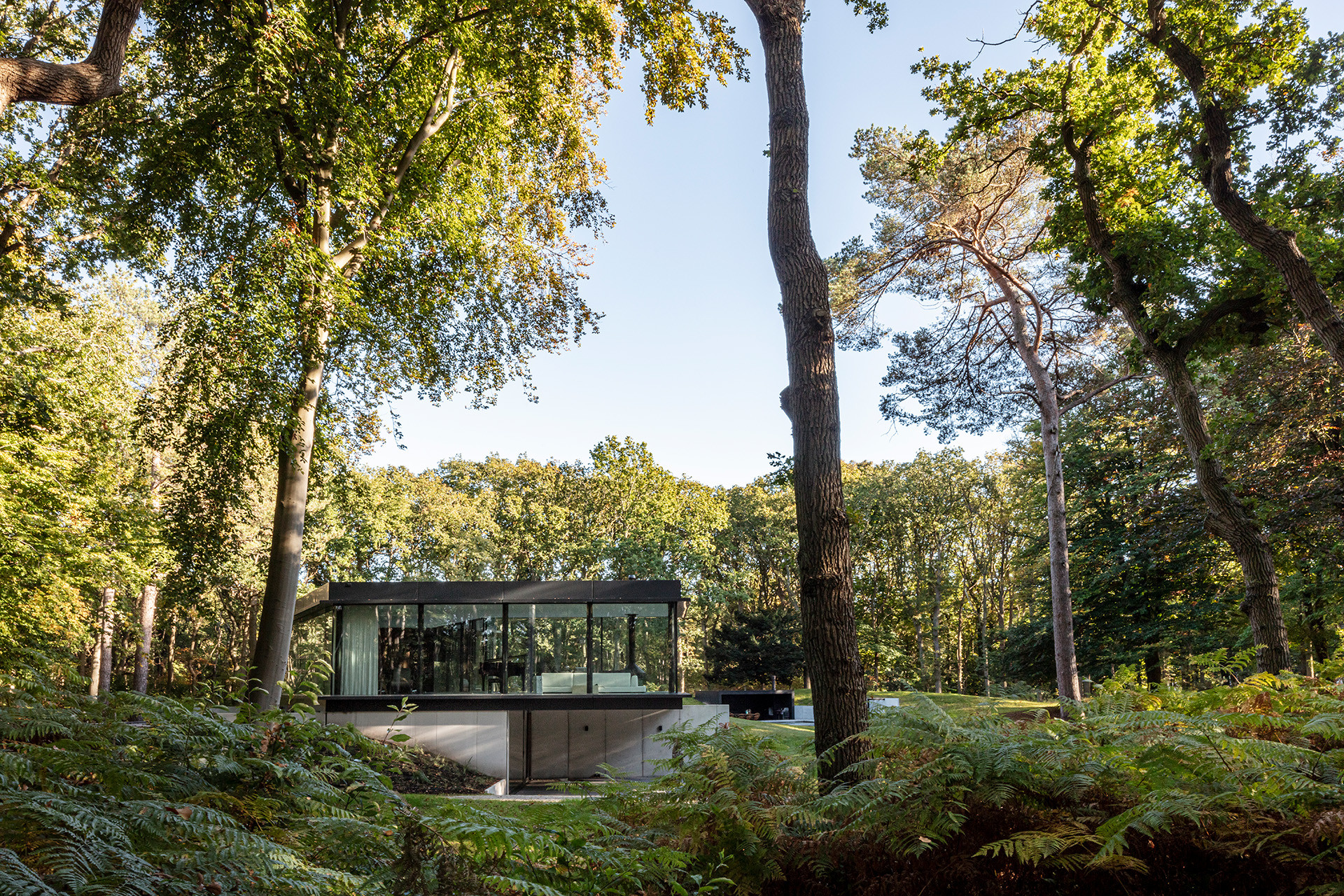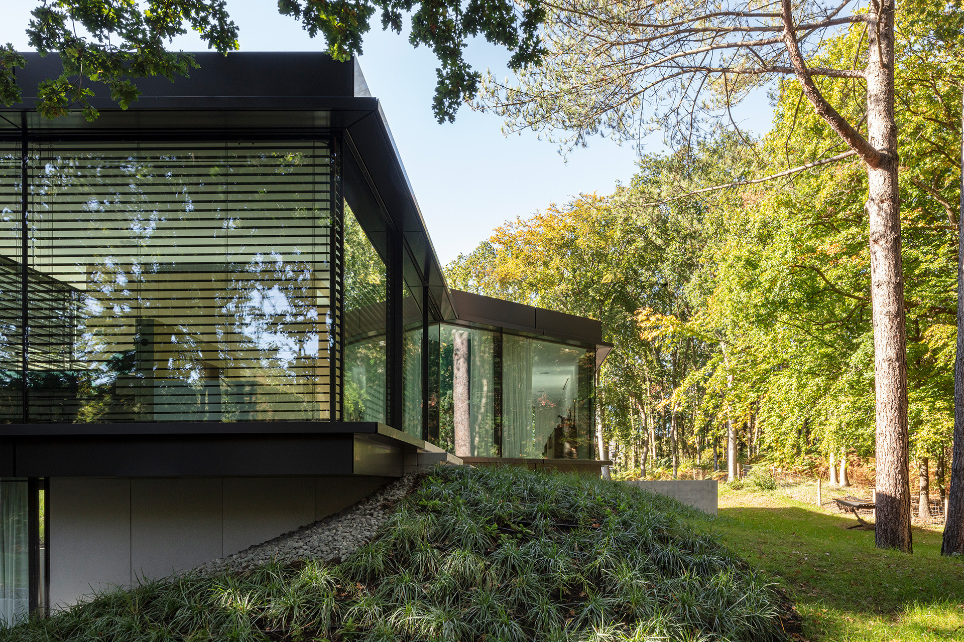 Het woongenot wordt vergroot door de mate van verbondenheid met de omliggende natuur, en wel met zoveel mogelijk respect voor die omringende natuur. Het glazen zwevende volume heeft een geknikte accolade vorm ontstaan om twee grote vliegdennen te behouden en hier omheen te vouwen, zodat deze niet hoefden te worden gekapt. Om woongenot tussen wonen en natuur extra kracht bij te zetten ‘zweeft’ dit deel als het ware boven het maaiveld met aan beide uiteinden een beeindiging in een groot overstek.