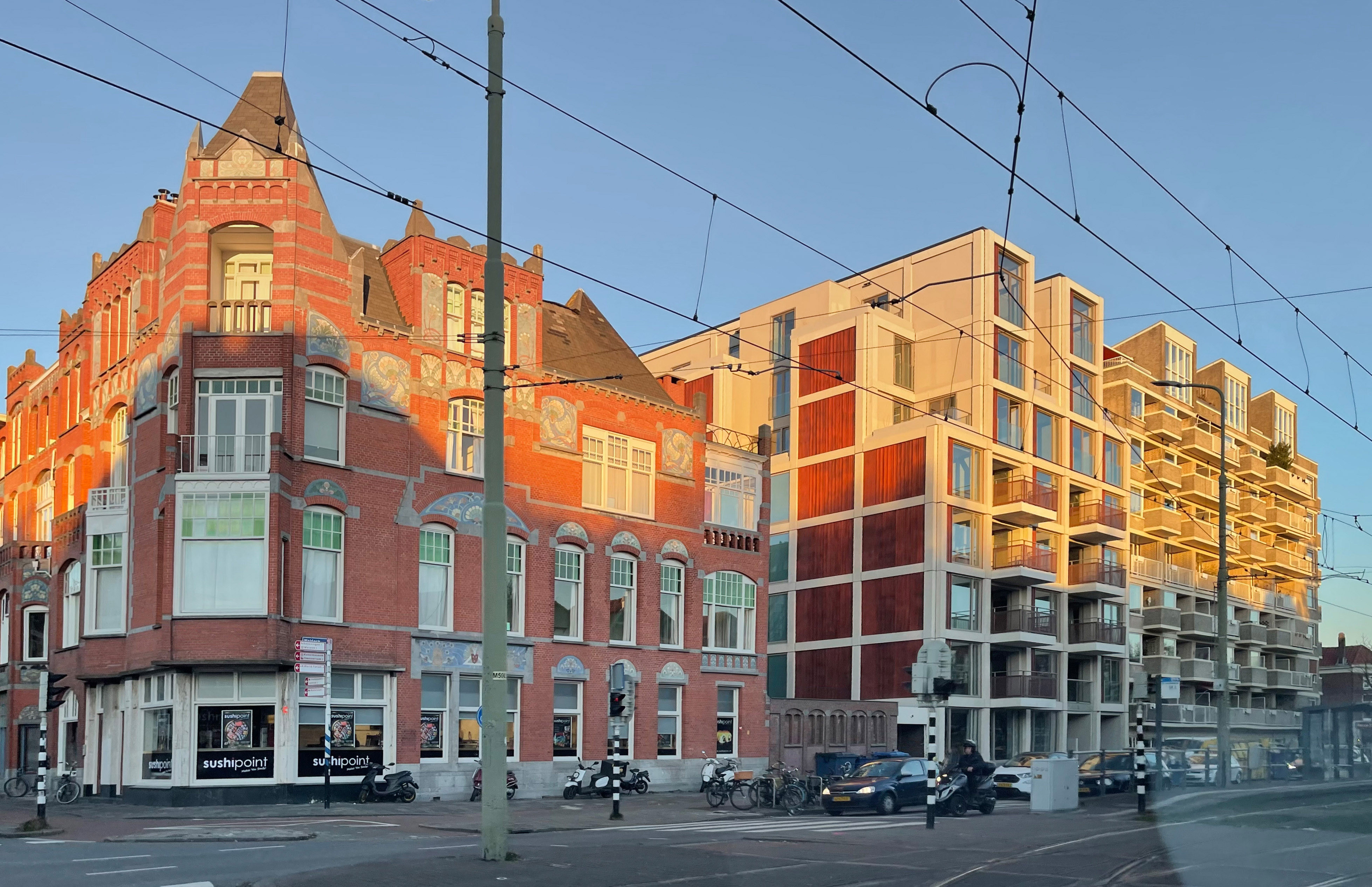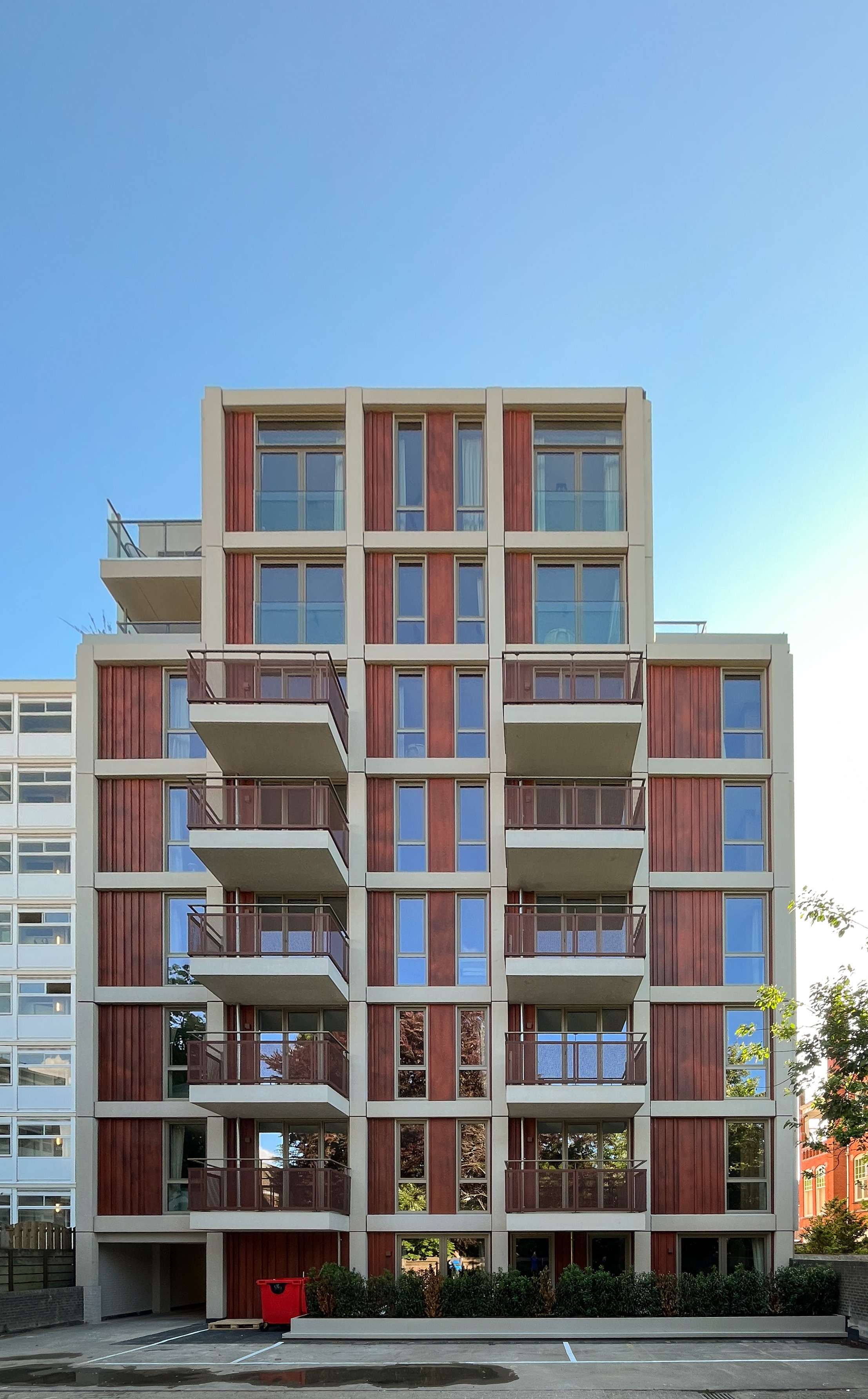 De constructie van het voormalige kantoor is zoveel mogelijk hergebruikt en verder uitgebouwd tot een herkenbare grid-structuur. Om de overgang naar het lagere Art Nouveau buurpand op de hoek te maken zijn aan deze zijde een aantal blokken uit het raster weggelaten. Door op nog meer plaatsen delen van het raster te verwijderen ontstaat er een krachtig silhouet met verwijzingen naar de grote dak-erkers van de serviceflat maar ook naar de kartelrand in het dak aan de andere zijde, dat zich overhoeks in de Laan van Meerdervoort doorzet.