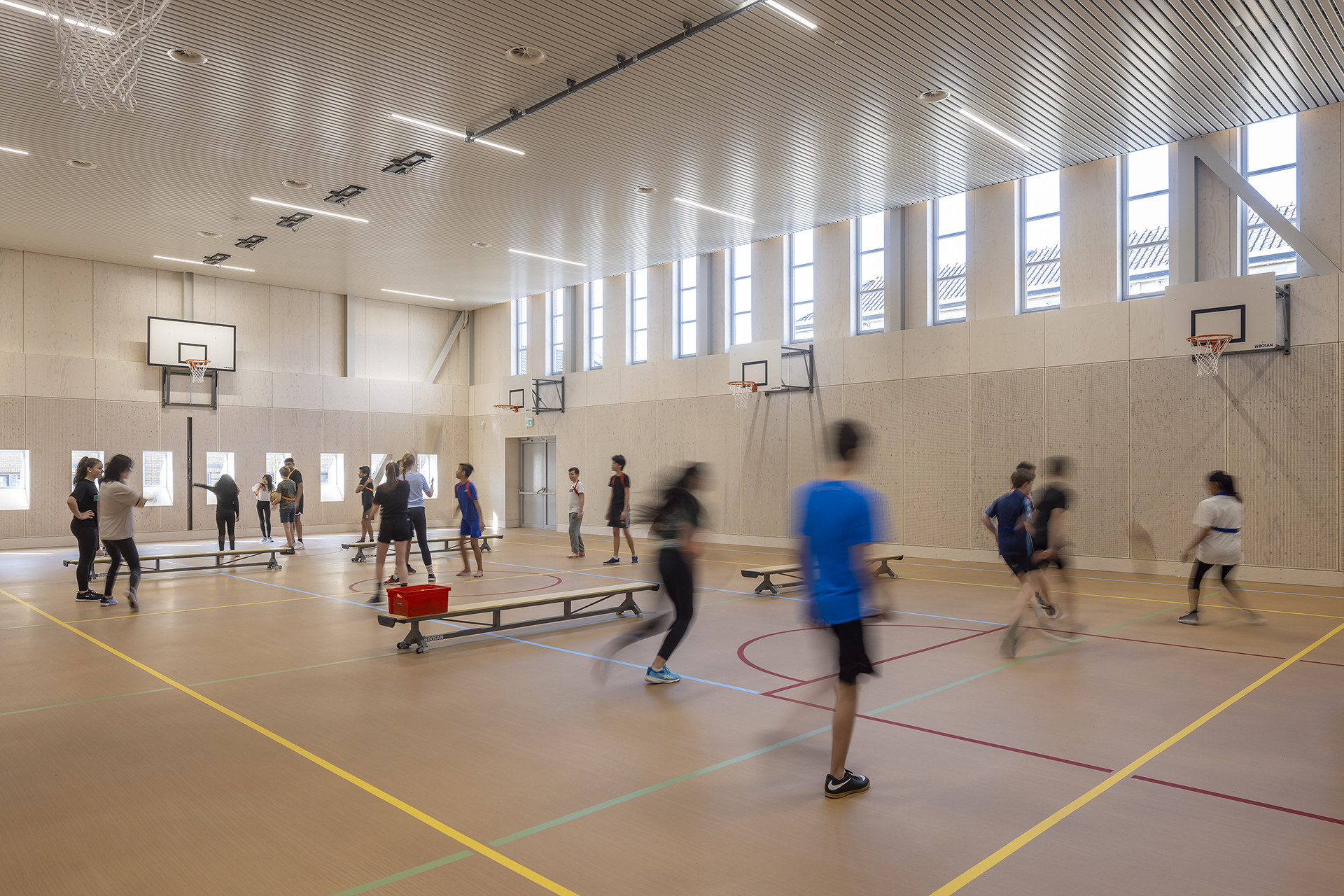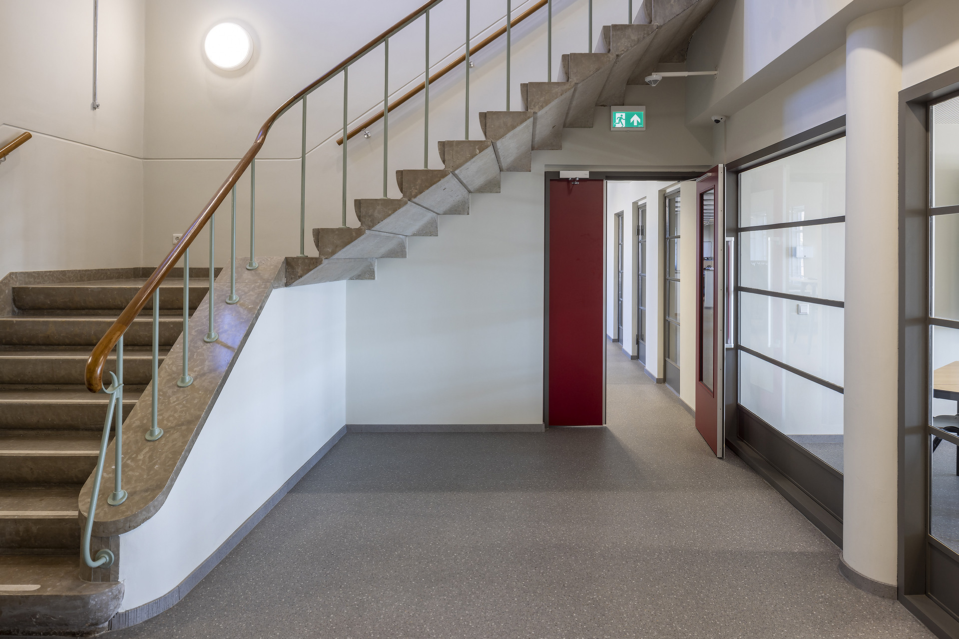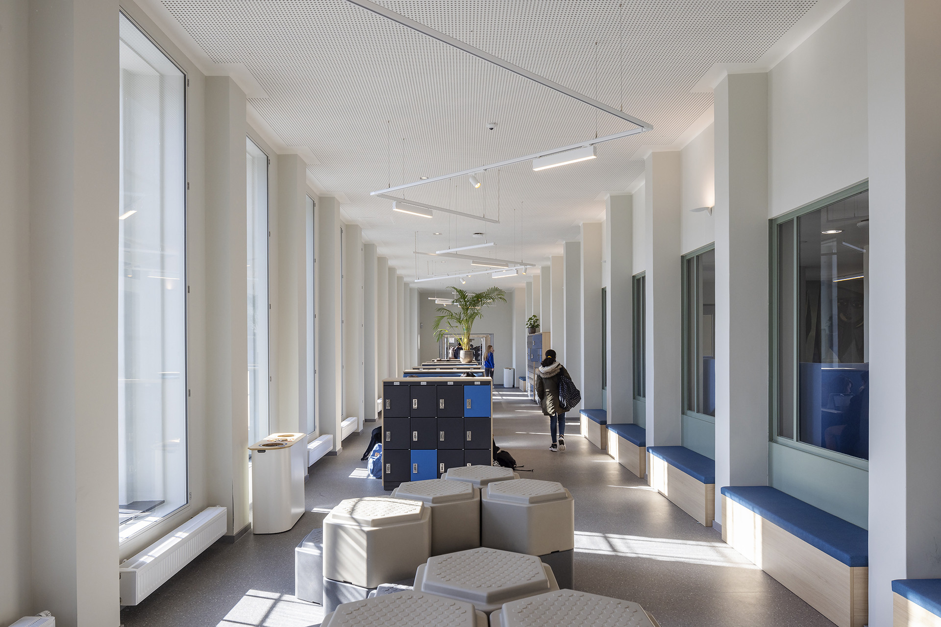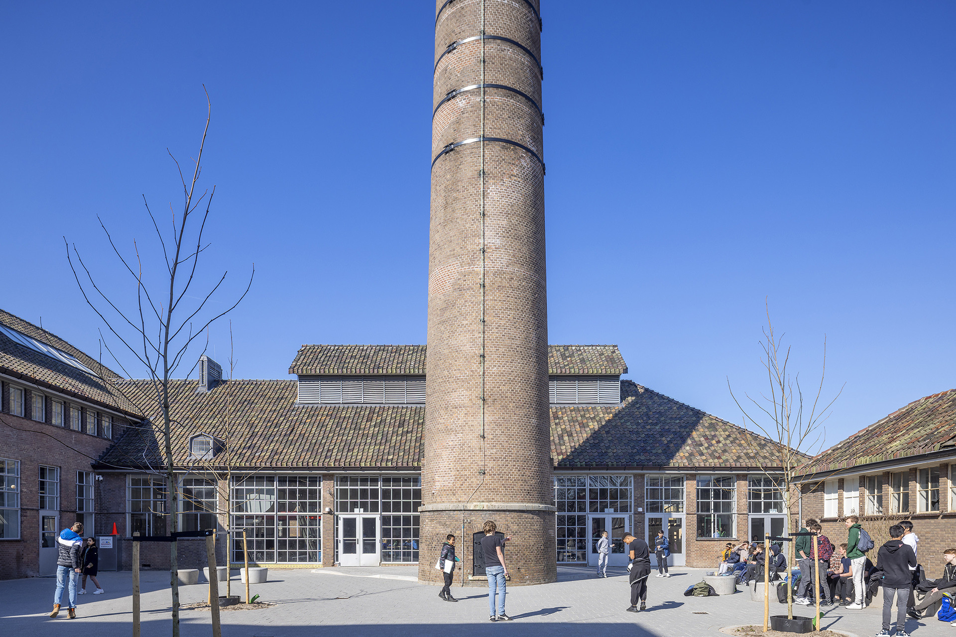 Om het poortgebouw tot school te bestemmen is uitgegaan van de langsdragerstructuur die bij de bouw was gekozen om de wisselende invullingen van het ziekenhuis mogelijk te maken. Op de begane grond zijn ter weerszijden van de poort de twee oorspronkelijke opnamehallen bestemd tot STOA: het entreegebied voor de leerlingen. De monumentale trappenhuizen zijn gehandhaafd en structureren de leerlingenstromen. Op de verdiepingen is de corridor verwijderd om een strook lokalen aan de voorzijde en een studiehal aan de achterzijde mogelijk te maken. De gehele kap is benut om de luchtbehandeling in onder te brengen waarmee de school aan de ‘frisse scholen’ eisen voldoet. Aan de linkerzijde is deels in de zijvleugel gebouwd met op de begane grond de administratie en de kleed en was voorzieningen voor de nieuw tegen het complex aangebouwde gymzaal. Op de verdieping van deze vleugel is een collegezaal onder de kap. De rechter zijvleugel, waar later de ziekenhuiskeuken was ingebouwd, is helemaal heringericht met de theorielokalen van de exacte vakken, de voorzieningen voor biologie, natuurkunde en scheikunde met in de kelder een technieklokaal, verlicht via de oorspronkelijke koekoeken. In de kap is een studio voor kunst en mediaonderwijs. Het voormalig ketelhuis achter de binnenplaats is de nieuwe aula geworden die niet als één grote ruimte maar als een samenstel van hoge voormalige stook en installatieruimten is vormgegeven. De stomp van de industrieschoorsteen staat midden op de binnenplaats en herinnert aan de energievoorziening van het ziekenhuis die al drie transities had ondergaan, van kolen naar olie naar gas, voordat de stadsverwarming verscheen. Het gymnasium is begin 2022 door leerlingen en staf enthousiast in gebruik genomen.