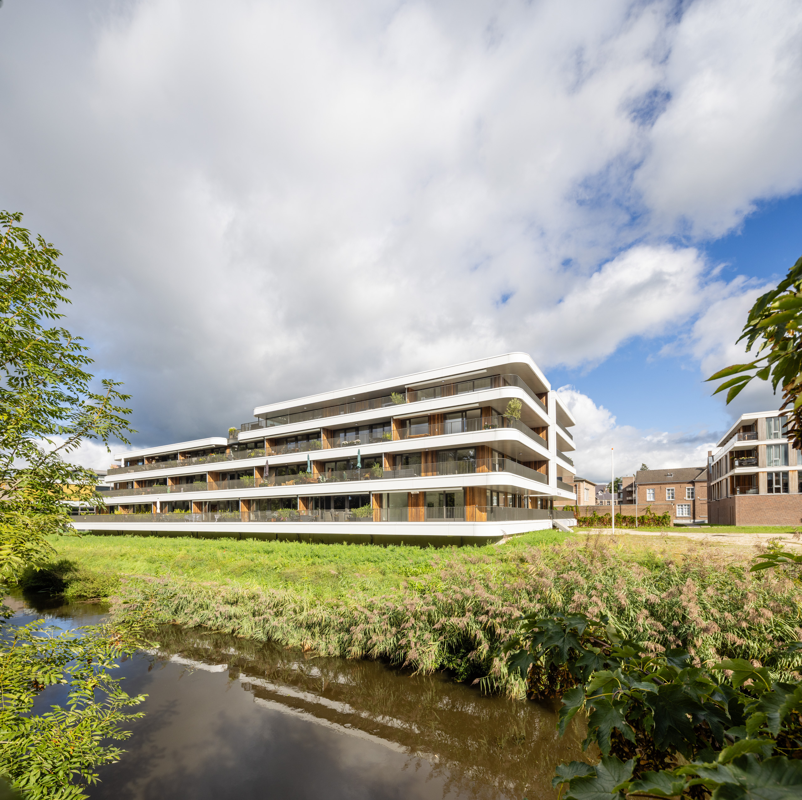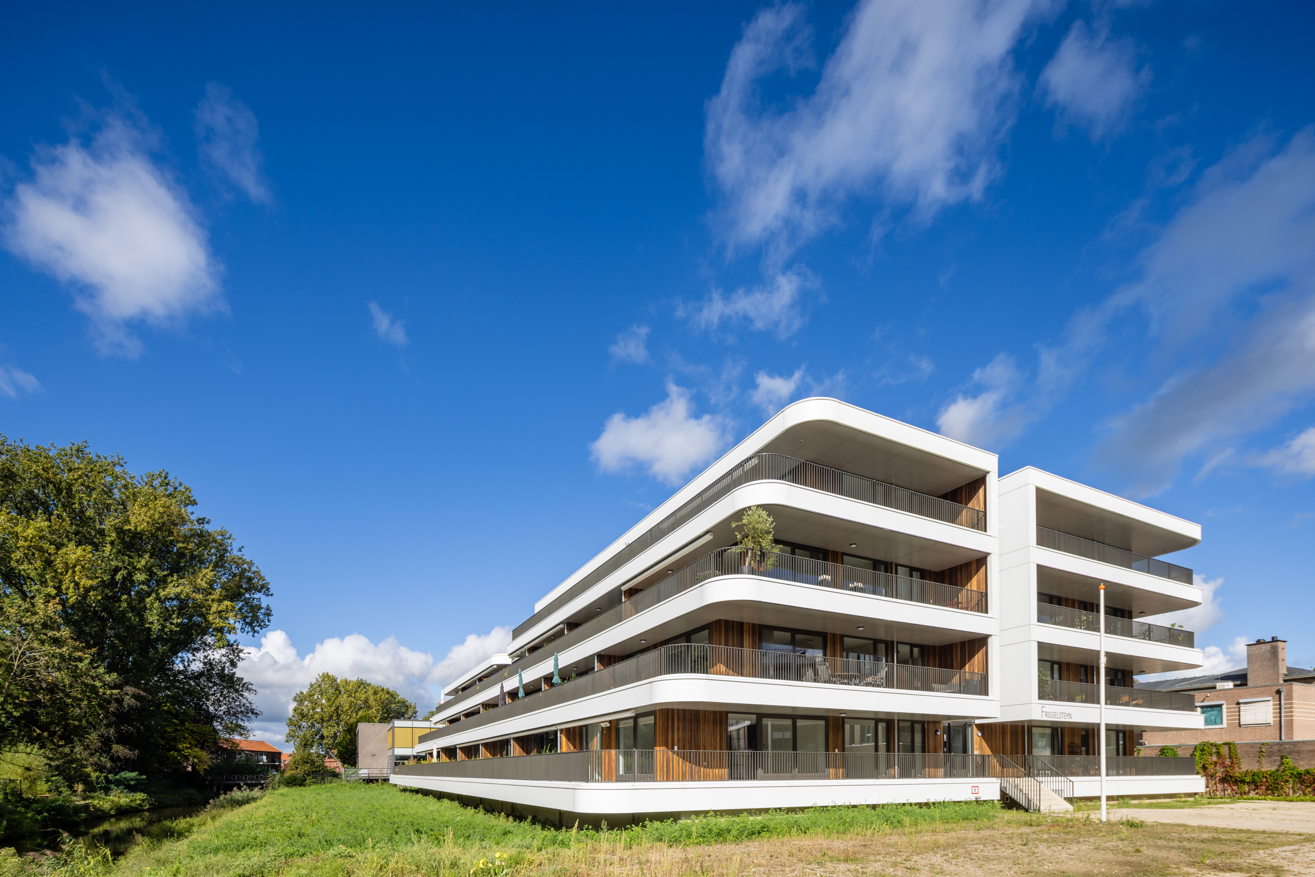 We hebben op de plek van het voormalige postkantoor, naast deze locatie, eerder al een gebouw ontworpen. De architectonische keuzes aan de achterzijde van dat gebouw hebben we meegenomen. Dit om zo een coherente sfeer in het nieuwe centrumgebied te bewerkstelligen. De woningbrede getrapte terrassen aan de zijde van De Aa geven alle hier gelegen appartementen een riante half-overdekte buitenruimte. Tegelijkertijd zorgen ze voor sterke horizontale belijningen. Door de uitvoering daarvan in wit aluminium krijgt het gebouw een heel eigen hedendaags karakter krijgt. Verder zijn de gevels geheel bekleed met verticale padoekdelen, welke het gebouw juist een warme uitstraling geeft. Het gebouw is op een sokkel (halfverdiept parkeersouterrain) gezet, waardoor het als het ware iets gaat zweven boven het maaiveld. Wanneer het waterschap klaar is met verbreden van de rivierloop zullen de balkons aan deze zijde boven een ruig begroeid landschap hangen. Bij lage waterstanden (98% van het jaar) kunnen passanten daar langs de rivier wandelen. Waarbij de bewoners door het hoogteverschil toch hun privacy blijven ervaren.