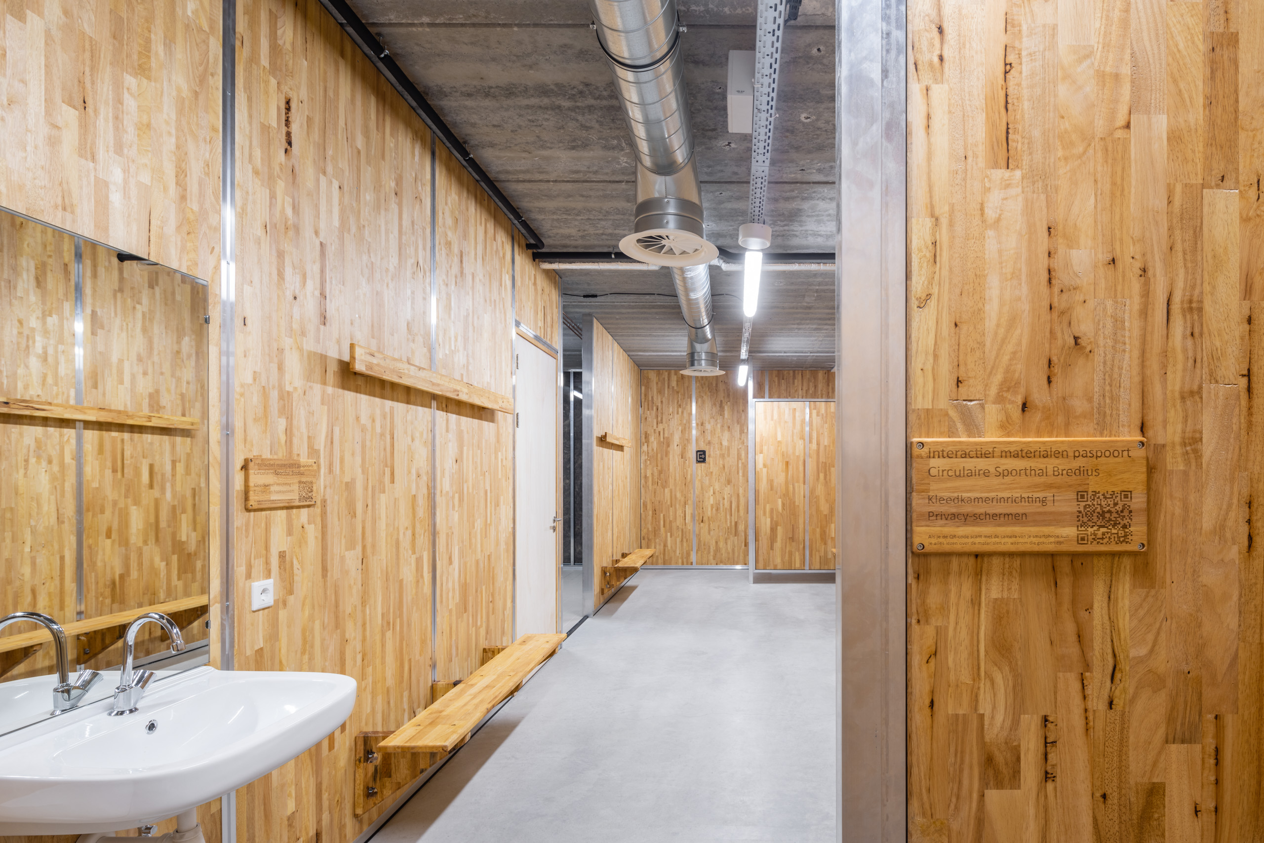 Circulair ontwerpen - Circulair betekent in de markt vooral lineair verlengen. Dat wil zeggen dat fabrikanten wel demontage-voorzieningen toevoegen aan hun product, maar het product zelf blijft in zijn samenstelling onveranderd. Bij Sporthal Bredius keken wij anders naar circulair, namelijk vanuit de visie om de oorspronkelijke kwaliteiten van de grondstoffen of het materiaal voor de toekomst te behouden en niet alleen maar afval te voorkomen. Demontage-voorzieningen geven deze garantie niet; producten degraderen nu eenmaal in de tijd en aan het einde van de cycli is dan uiteindelijk nog steeds sprake van afval. Het circulaire ontwerptraject vergde veel pionierswerk dat van meet af aan integraal, dus ook esthetisch, is meegenomen in het ontwerpproces. Voor Sporthal Bredius zijn we tot de volgende belangrijke kernpunten gekomen:
