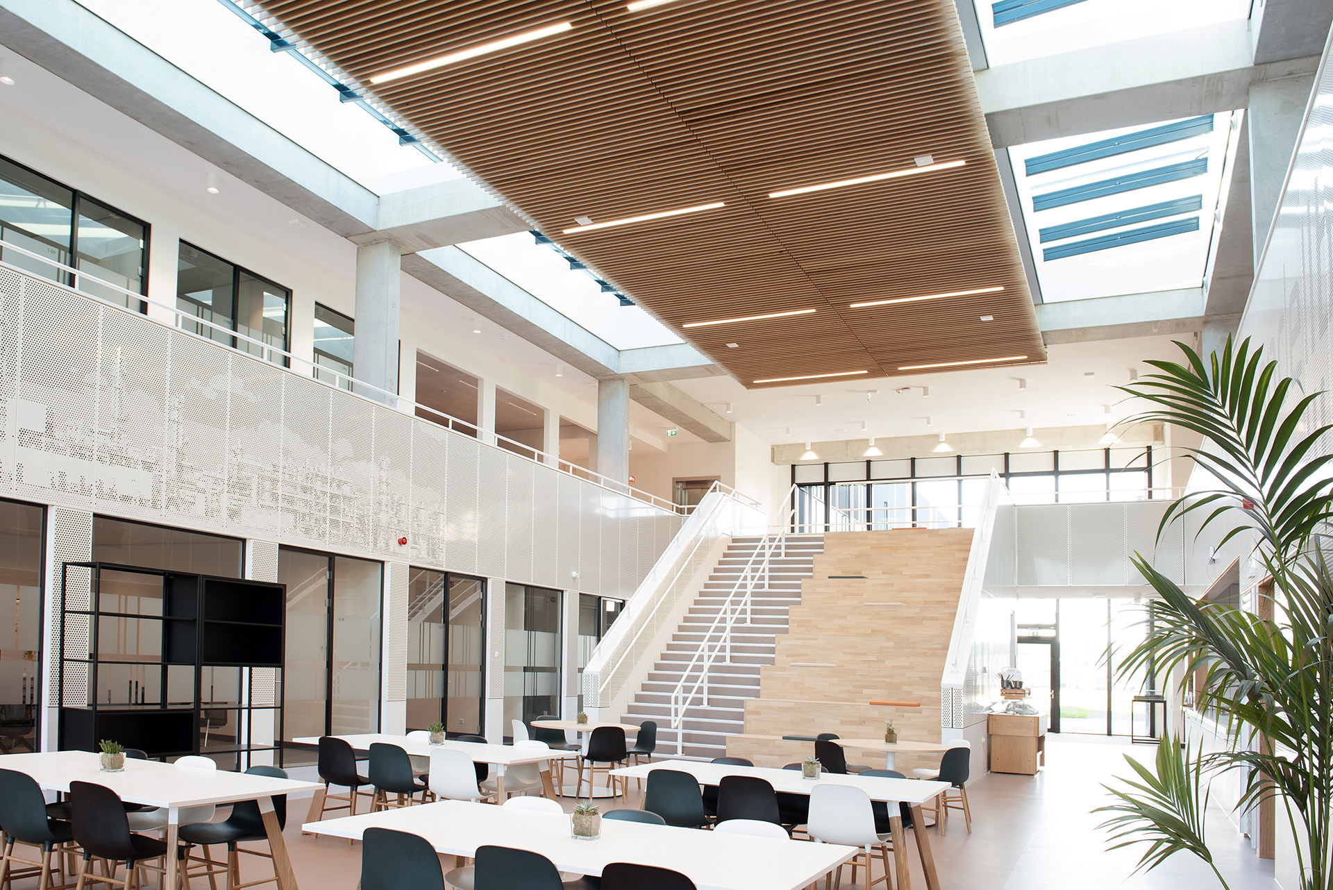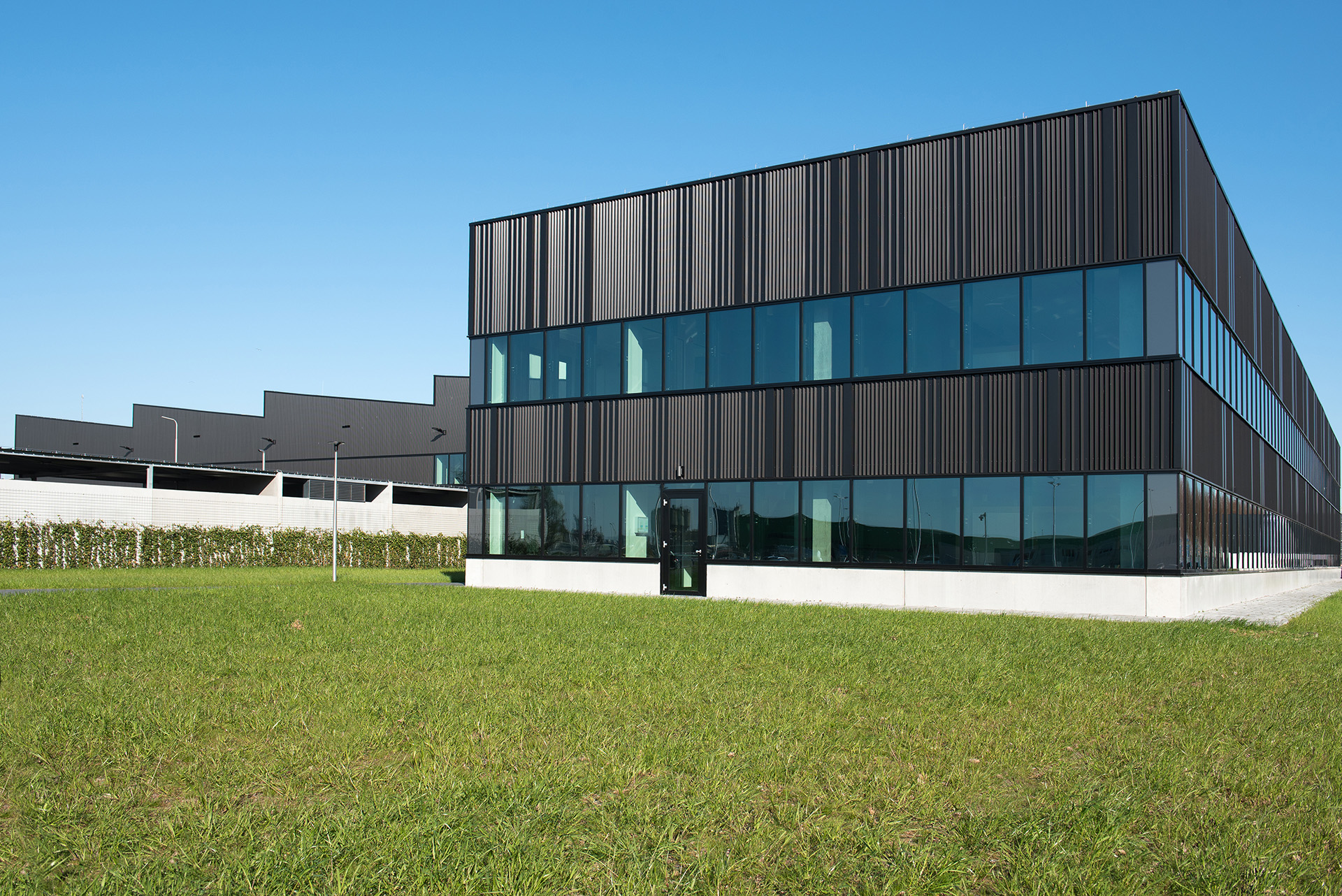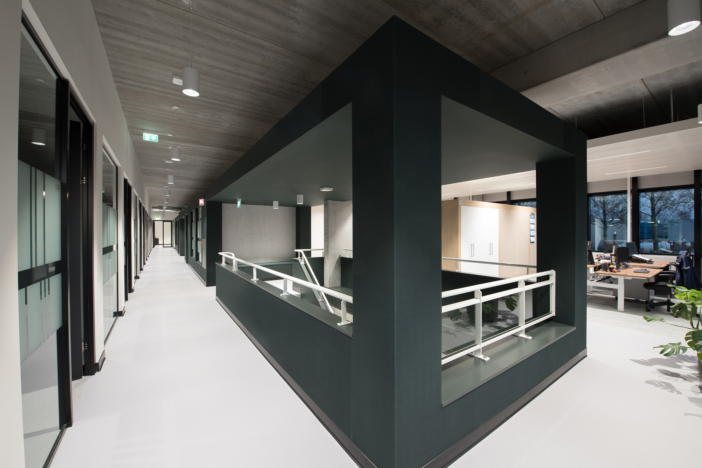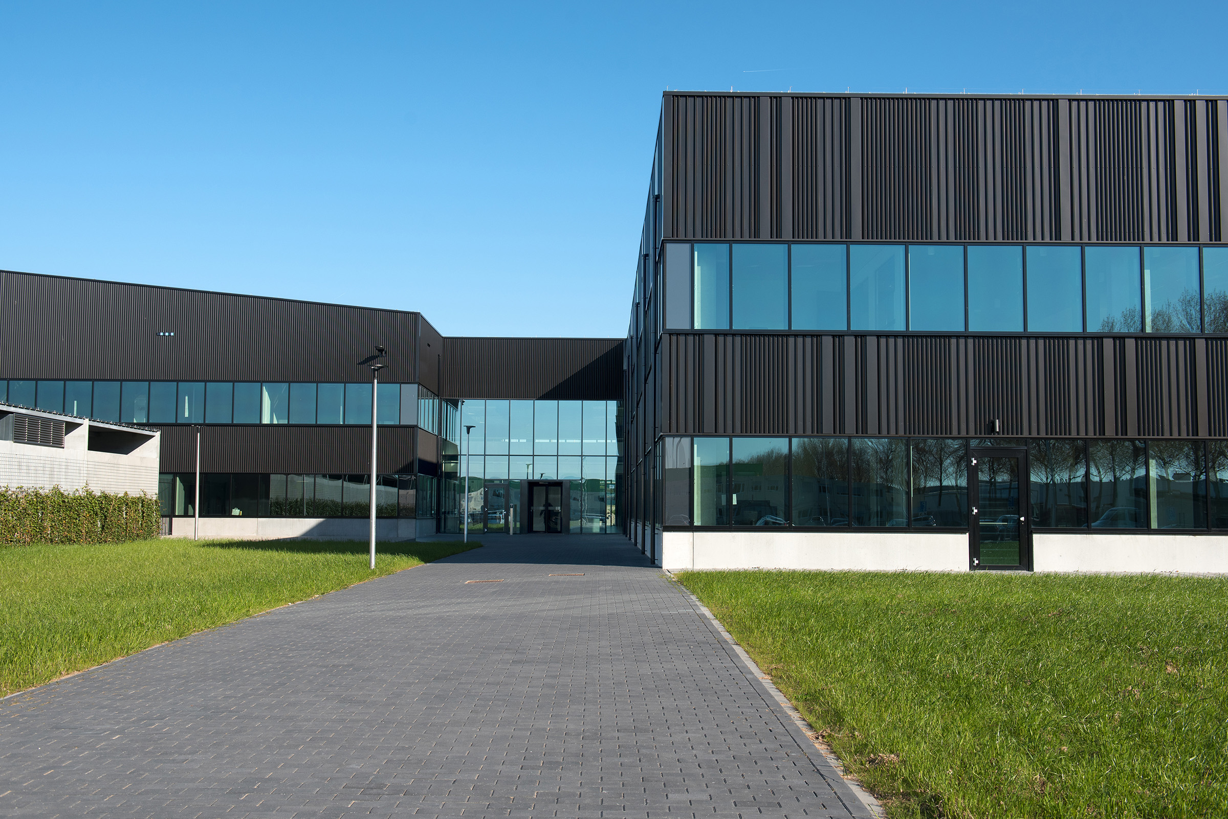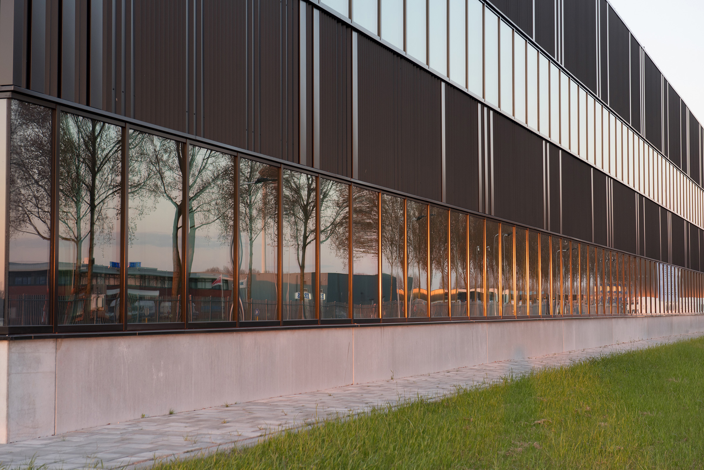 Voor Royal HaskoningDHV was dit een multidisciplinair totaalproject, onze services bedroegen het totaalpakket voor het ontwerp en realisatie van het gebouw, terrein, en het gehele vaste interieur. Qua architectuur wilden we een stoer gebouw creëren dat trots zijn plaats inneemt in de haven van Rotterdam. Zo heeft het gebouw materialen en een vormgeving die goed passen bij de industriële omgeving. Dat, gecombineerd met een warm interieur, door natuurlijke materialen als hout, gebruik van recyclede PET-vilt en overvloedig daglicht, maakt het gebouw tot een prettige verblijfplaats en in combinatie met de groene terreininrichting (onder meer open (gras)tegels op de parkeerplaats, Wadi en biodiversiteit in aanplanting) een bijzondere verschijning in het industriële Botlekgebied. De gevel is strak en goed gedetailleerd en uitgevoerd in donkergekleurde staalplaten. Door de combinatie van verschillende profielen, geplaatst in een verspringend ritme, ontstaat een subtiele dieptewerking. De gevel heeft hiermee een symbolische knipoog naar de gebruiker van het gebouw. In het verspringende ritme van de gevel kunnen oplettende personen namelijk het logo van de gebruiker herkennen, dat de inspiratie vormde tot het ontwerp van de gevelaanzichten. Om het gebouw stevig op de ondergrond neer te kunnen zetten, is rondom een strakke, geïsoleerde prefab betonnen plint aangebracht. Behalve dat die plint een esthetisch effect aan het ontwerp geeft, heeft hij ook praktisch nut als bescherming, er wordt op het terrein namelijk veel rondgereden met vorkheftrucks en karretjes.Het atrium is de centrale ontmoetingsplek en herbergt een restaurant en meeting rooms aan beide zijden. Daglicht stroomt er naar binnen via de grote raampartijen aan de oost- en de westkant en via grote, te verduisteren, daklichten. Het atrium is rondom voorzien van een rondgang met ontmoetingsruimtes voor het personeel. De verbindingstrap naar boven is uitgevoerd als tribune waar het personeel kan zitten tijdens bijeenkomsten of gewoon voor een kopje koffie. Daarnaast zorgen de rondgang en de grote tribune ervoor dat iedereen tijdens bijeenkomsten kan volgen wat gezegd wordt en kan meekijken op grote schermen in het atrium. De bekleding van de rondgang van het atrium is uitgevoerd in geperforeerde staalplaat met akoestische backing. In deze platen zijn door middel van de perforaties verschillende afbeeldingen gerelateerd aan de werkprocessen van het bedrijf, alsmede de productielocatie zelf te zien.