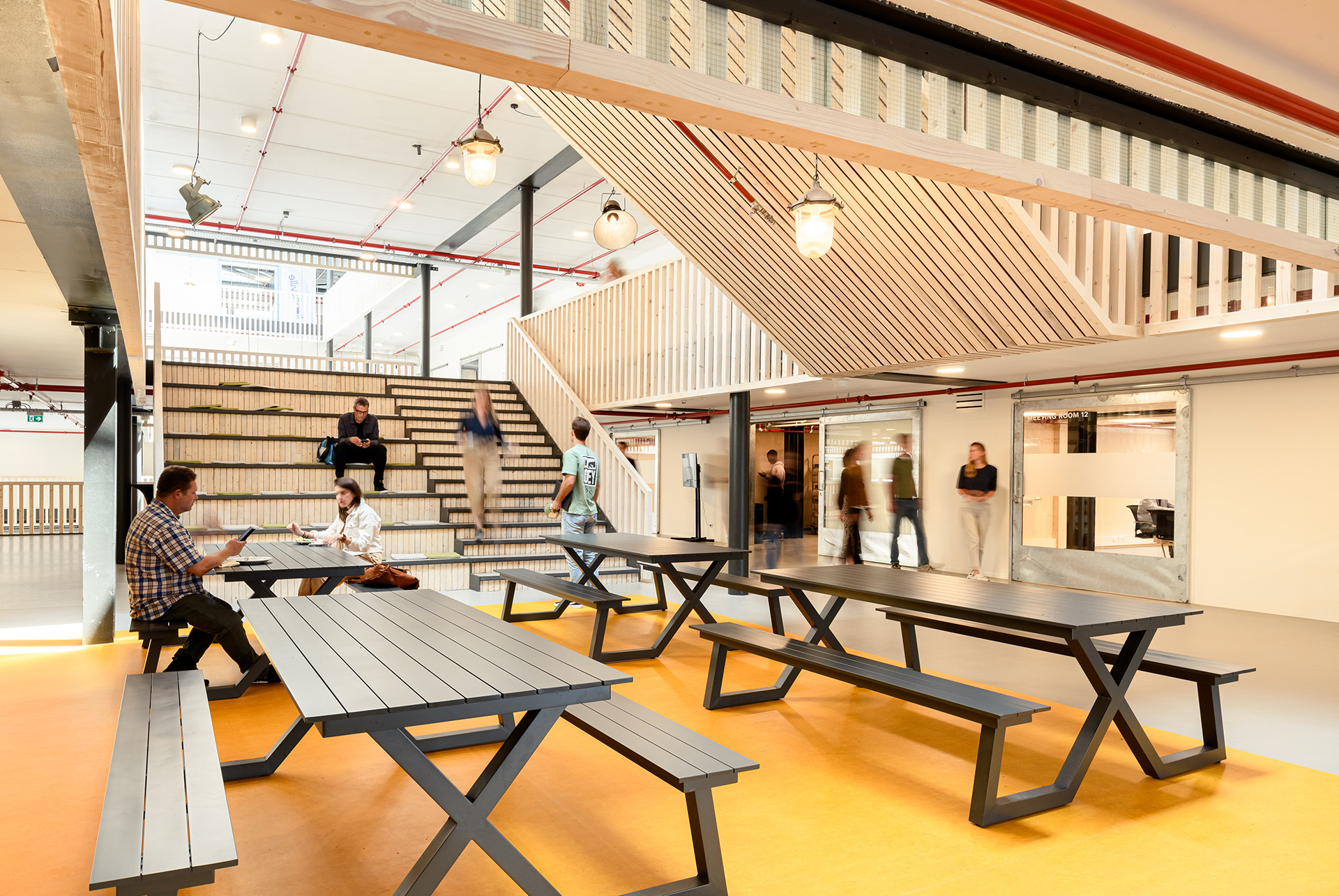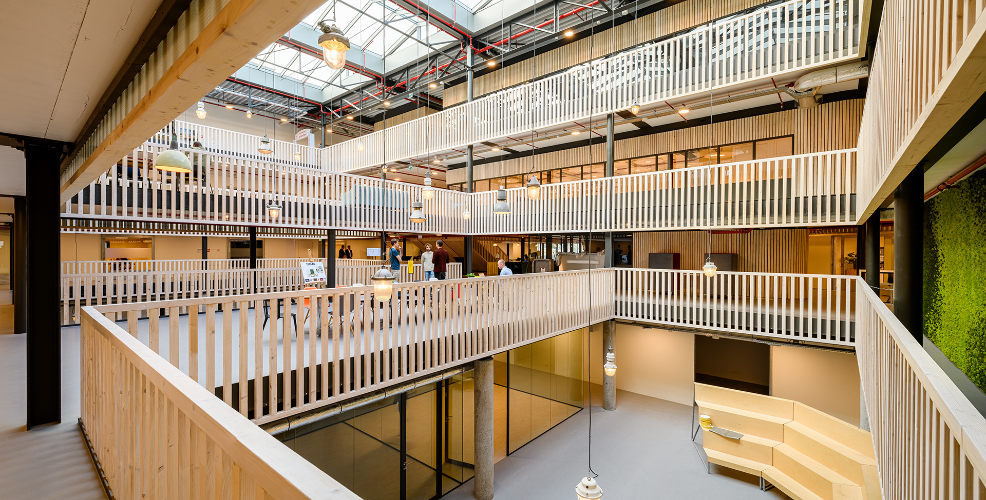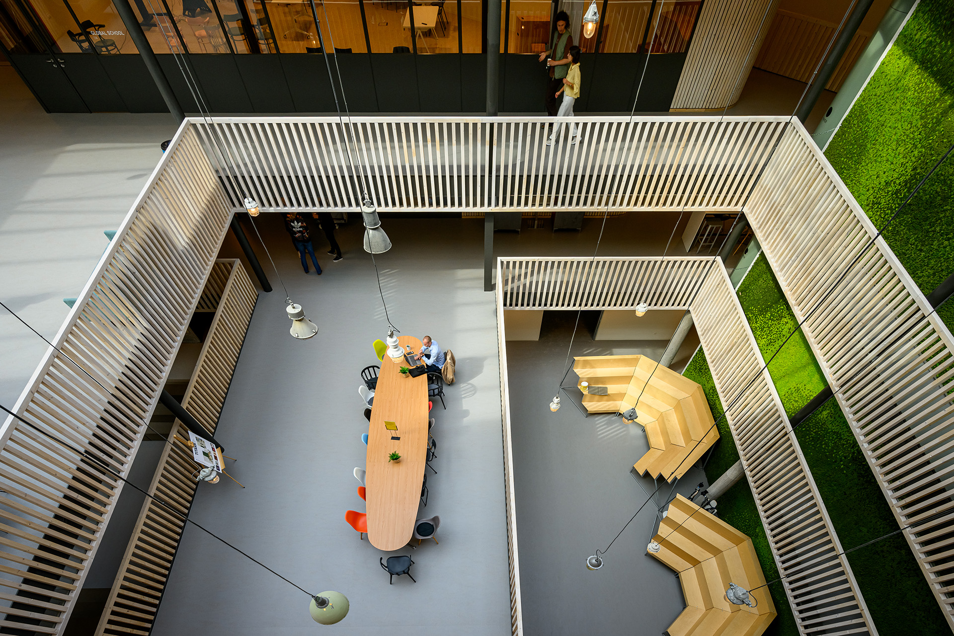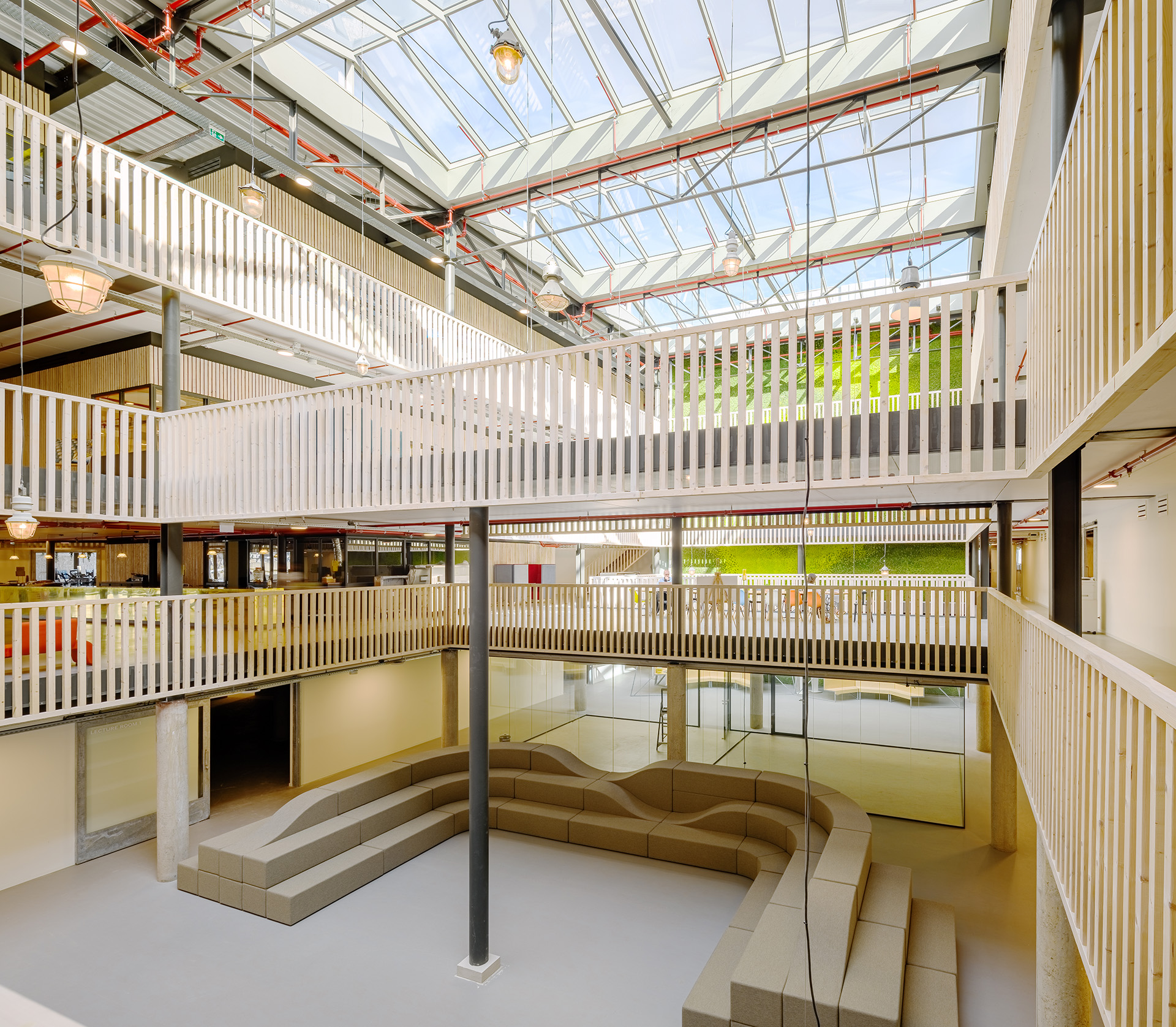 Doordat het gebouw ooit is ontworpen als opslag bezat het een groot vloeroppervlak, grote open ruimtes en relatief weinig geveloppervlak. Meestal is dit een nadeel, maar hier is het opgepakt als kans om grote vides te maken en de overmaat in te zetten als vliegwiel voor ontmoetingen. Het hart van het gebouw wordt gekarakteriseerd door een spel van vides, brede publieke bruggen en daglicht, wat door de nieuwe daklichten tot in de kelder van het gebouw reikt. Zelfs op een sombere dag voelt het hier licht en ruimtelijk. Het ontwerp en de inrichting zijn afgestemd op de gebruikers: er zijn veel publieke ruimtes, allerlei verschillende laagdrempelige kantoren, en in de kelder ruimte voor ‘makers’.