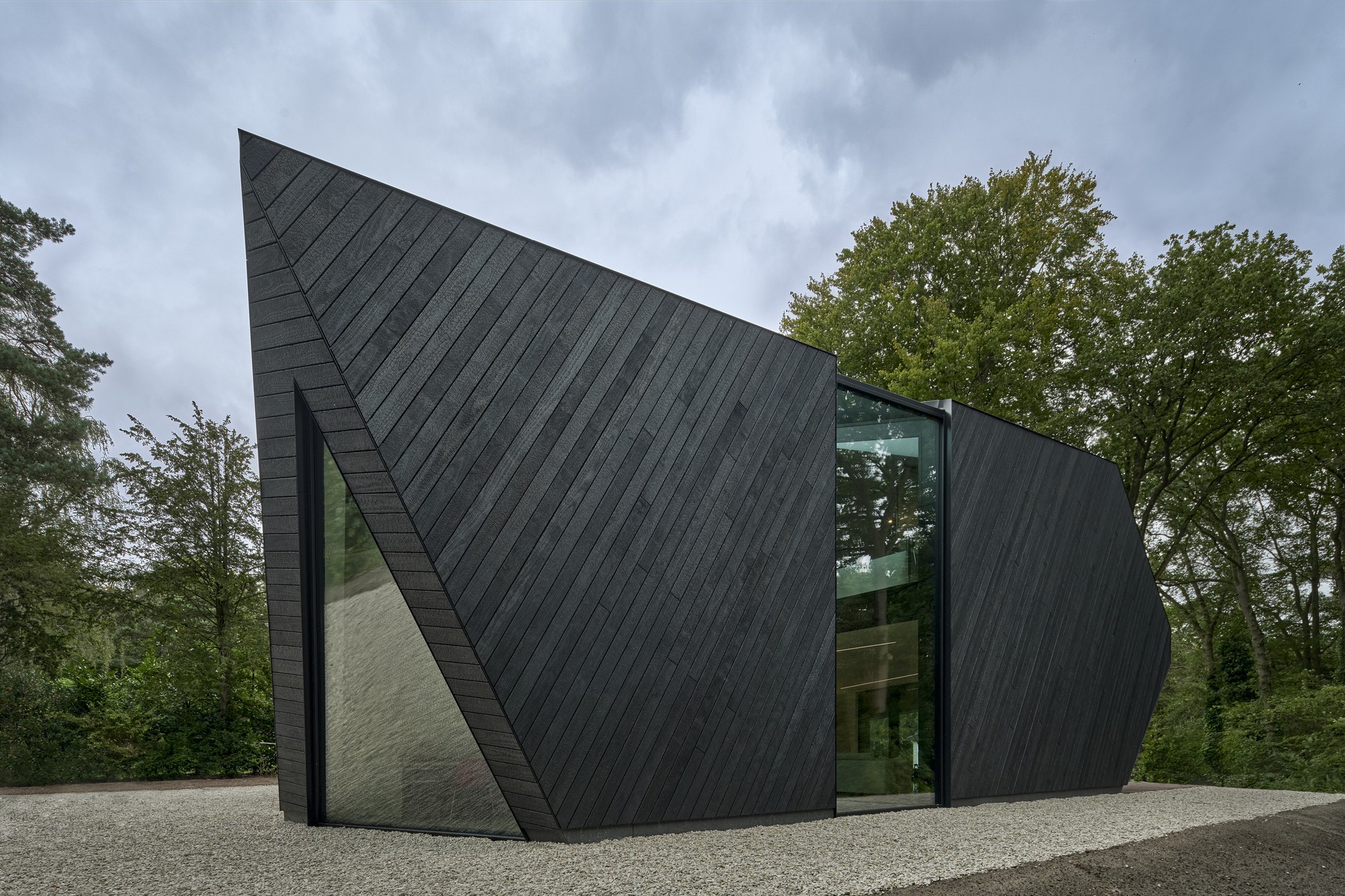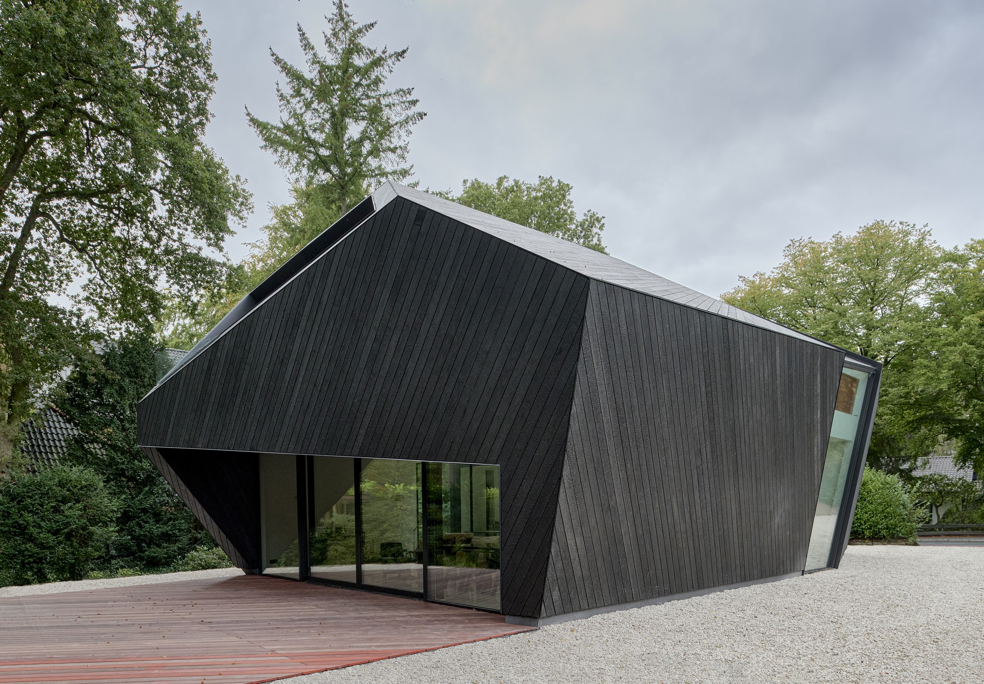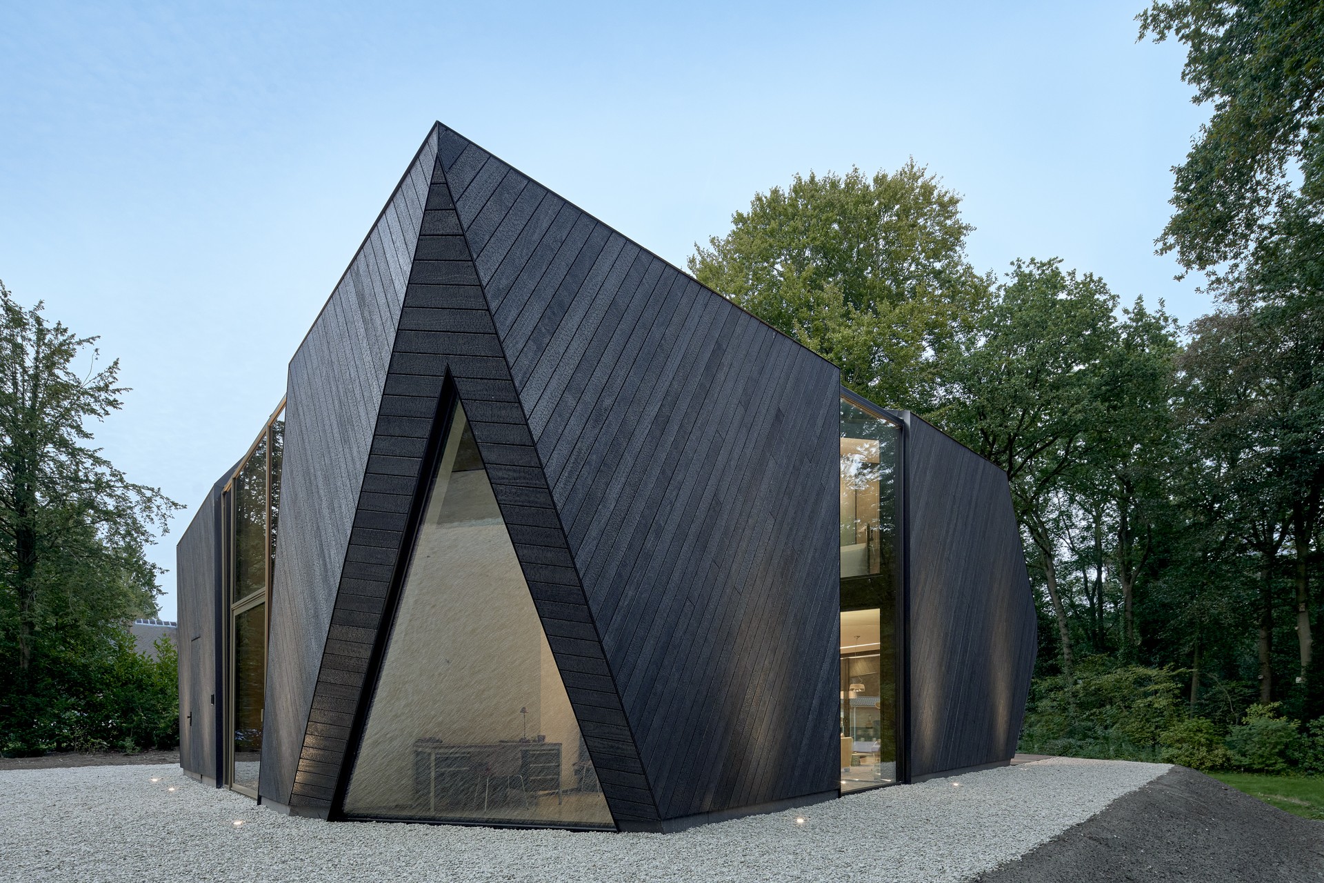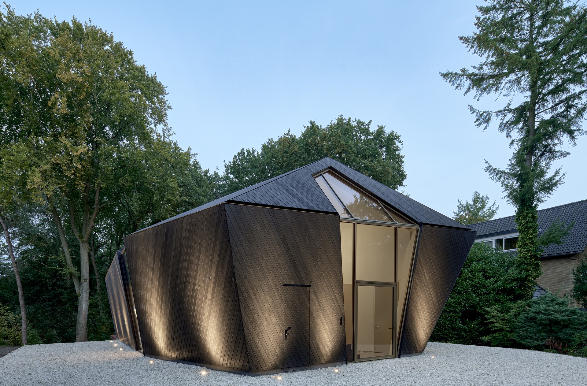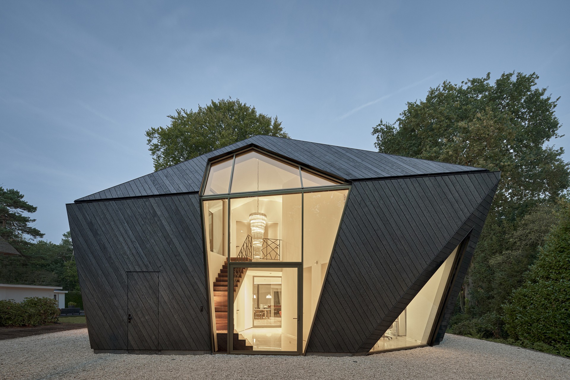 Aan de rand van het bos in Hilversum staat Diamond House, een villa die wat vormgeving betreft doet denken aan de edelsteen waarnaar het vernoemd is. Wat de materialisatie betreft is het echter hout dat de boventoon voert. De complexe vorm is tot in de kleinste details in 3D uitgeëngineerd en vervolgens in prefab houtskeletbouw opgebouwd. De burnt wood gevelbekleding is met hetzelfde gevoel voor precisie in het werk op maat gezaagd en bevestigd. Een onconventionele stalen hulpconstructie voorziet het pand van de benodigde stabiliteit en ondersteuning.