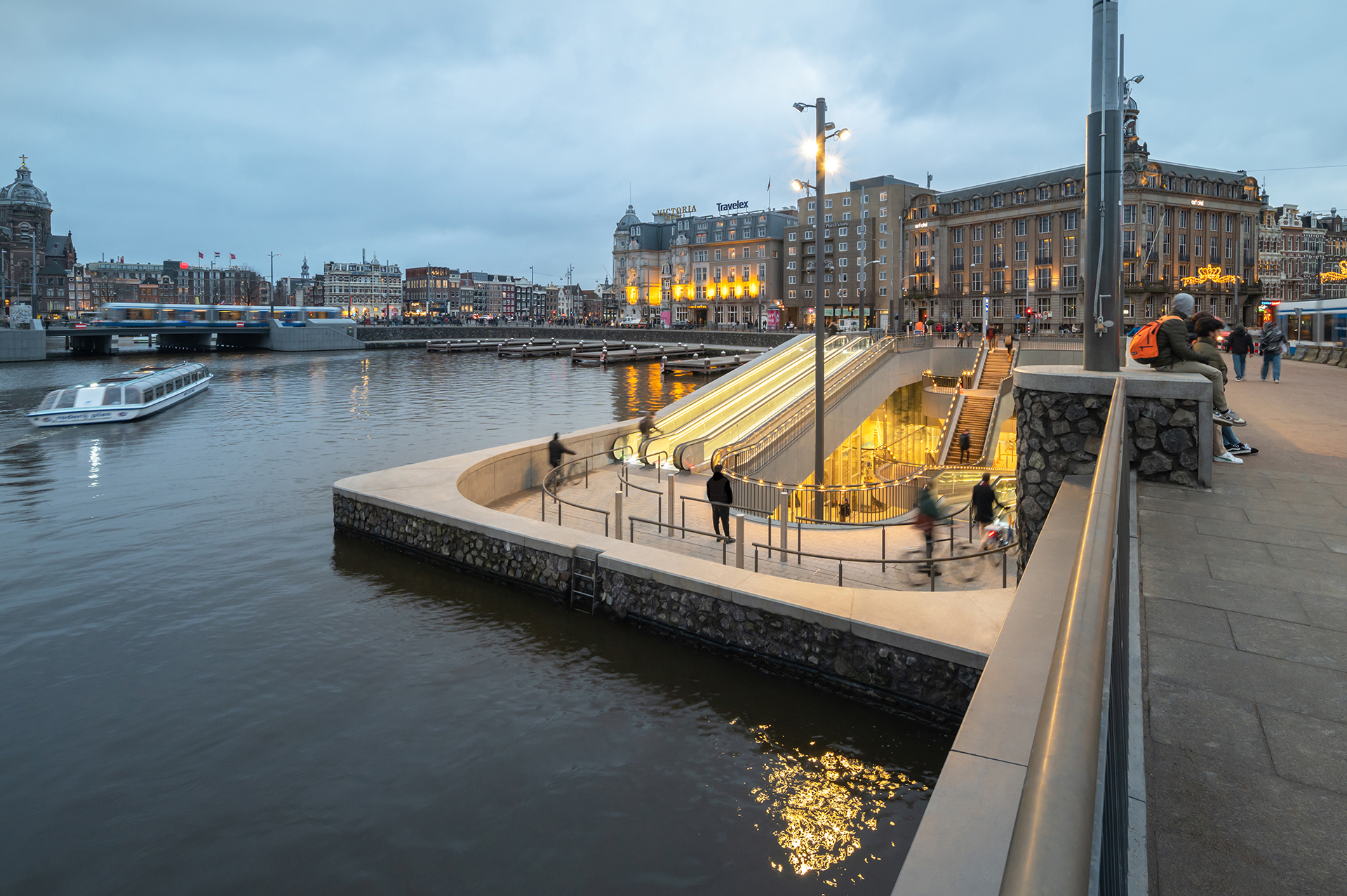 De onderwaterfietsenstalling bij het Stationsplein in Amsterdam, een sleutelcomponent van het project De Entree, transformeert de openbare ruimte door een functionele infrastructuur naadloos te integreren met de stedelijke leefomgeving. Deze stalling, ontworpen als een uitbreiding van de openbare ruimte, biedt niet alleen een significante bijdrage aan de stedelijke ruimte en verrijkt de waterbeleving, maar fungeert ook als een cruciale schakel in het mobiliteitsnetwerk van de stad, verbonden met het Centraal Station.