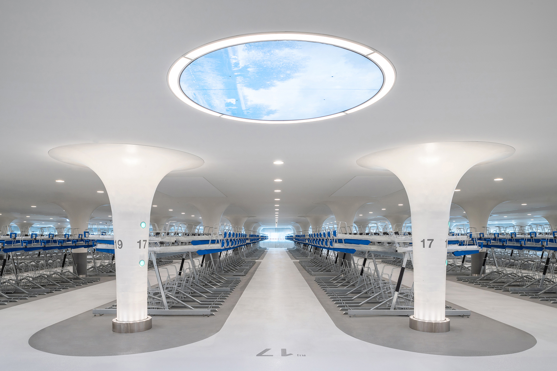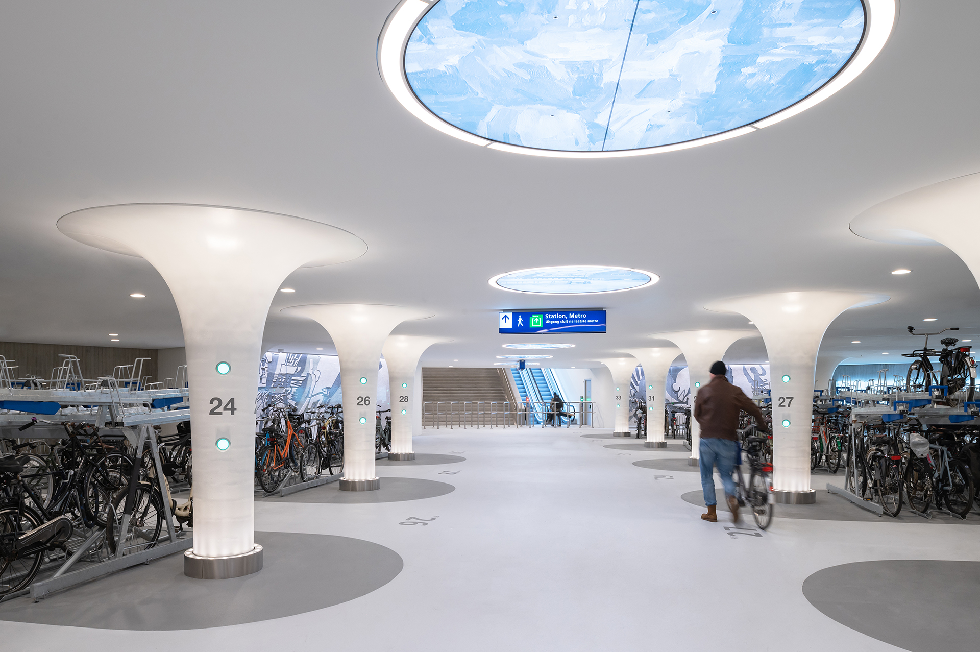 Gelegen voor Amsterdam Centraal Station, onthult de 'Fietsenstalling Stationsplein' zich als een architectonisch juweel onder water, huisvestend tot 7.000 fietsen. Dit project is meer dan een infrastructuur; het is een zorgvuldig gecreëerde ervaring die de essentie van Amsterdam - water - viert en tegelijkertijd het stedelijk weefsel naadloos uitbreidt.