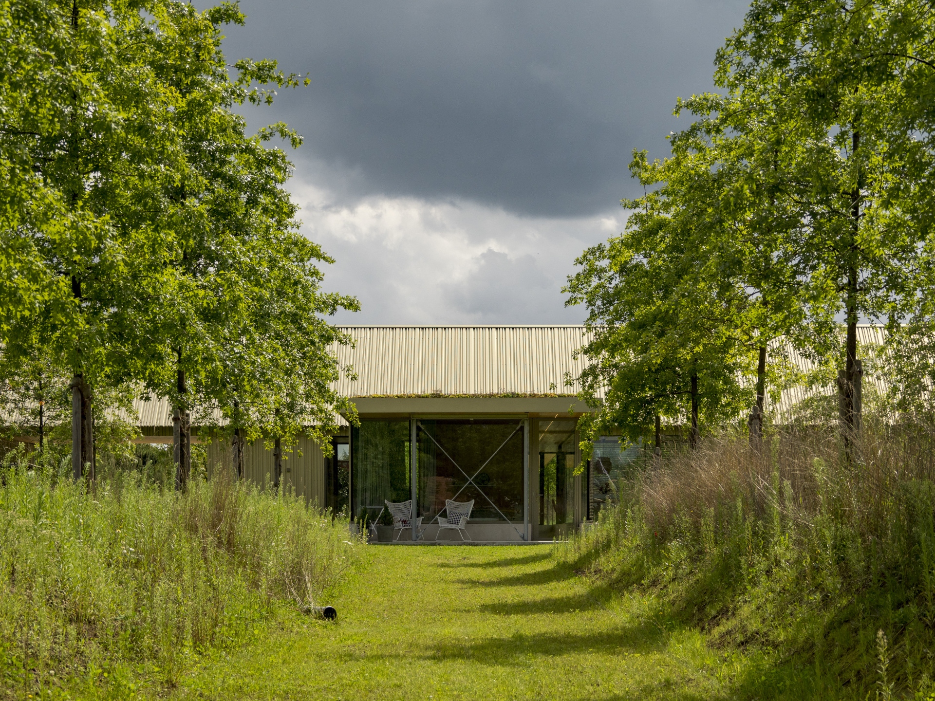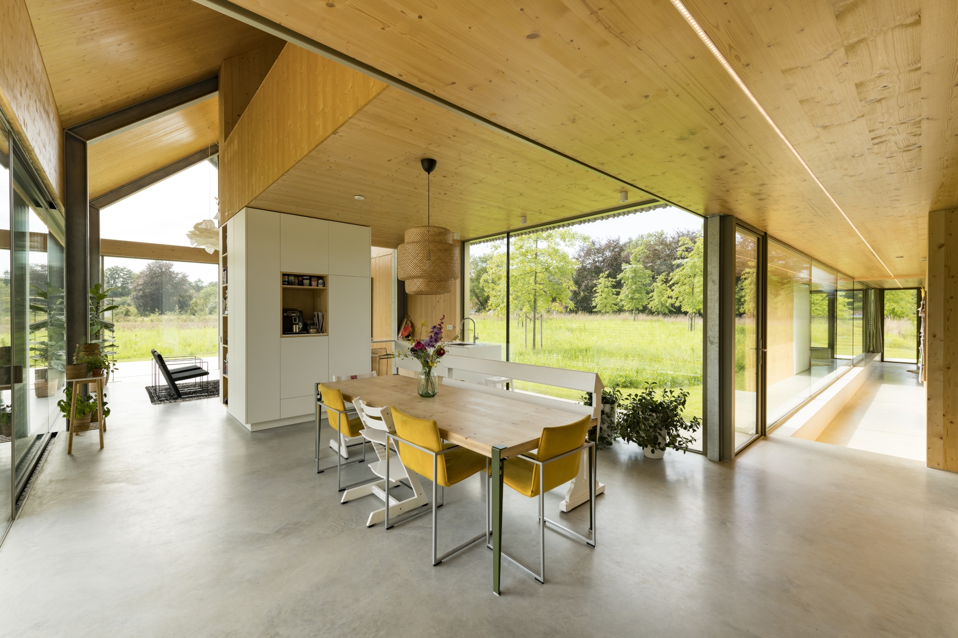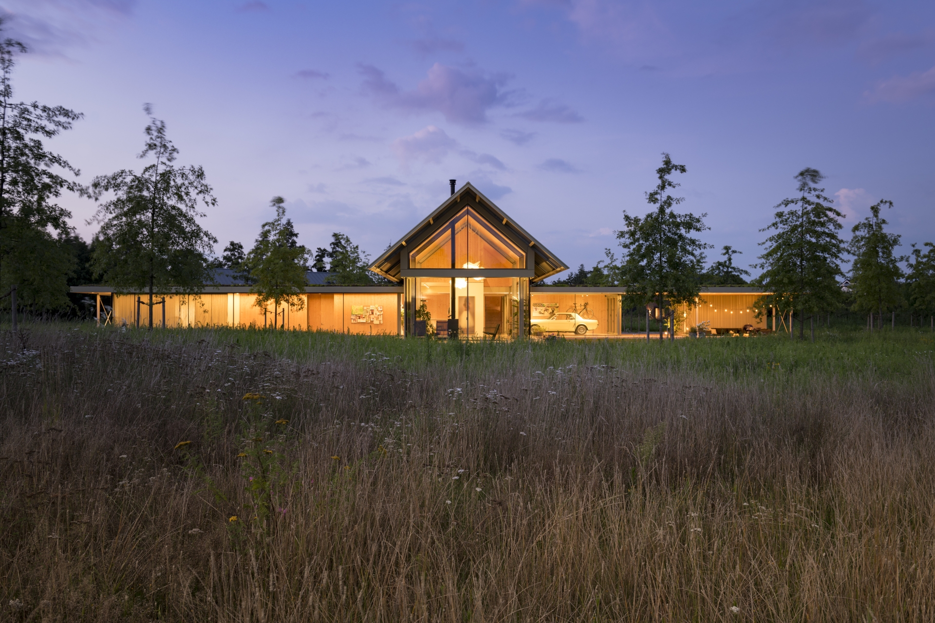 Buiten. “Binnen de vier ‘armen’ van de woning ontstaan straks buitenruimtes met ieder een eigen sfeer: van schaduwrijk bos aan de noordkant tot een wilde kruidenbeplanting met veel zon aan de zuidkant. Deze kwartieren zijn ingericht met hulp van tuinarchitect Esselink uit De Heurne. Uiteindelijk moet de woning, mede door zijn kleur, geringe hoogte, groendaken en deels verzonken niveau, helemaal opgaan in de groene omgeving. Inmiddels hebben we vier seizoenen meegemaakt in onze nieuwe woning en kunnen we zeggen dat we nog steeds helemaal blij zijn met het ontwerp. We beleven de seizoenen intens dankzij het vele glas. In de winter zoeken we meer de knusse zitkuil op, in de zomer gaan de deuren open en zitten we veel buiten. Ons doel van een niet-alledaagse woning die helemaal bij ons past en omgeven wordt door groen, is bereikt!”