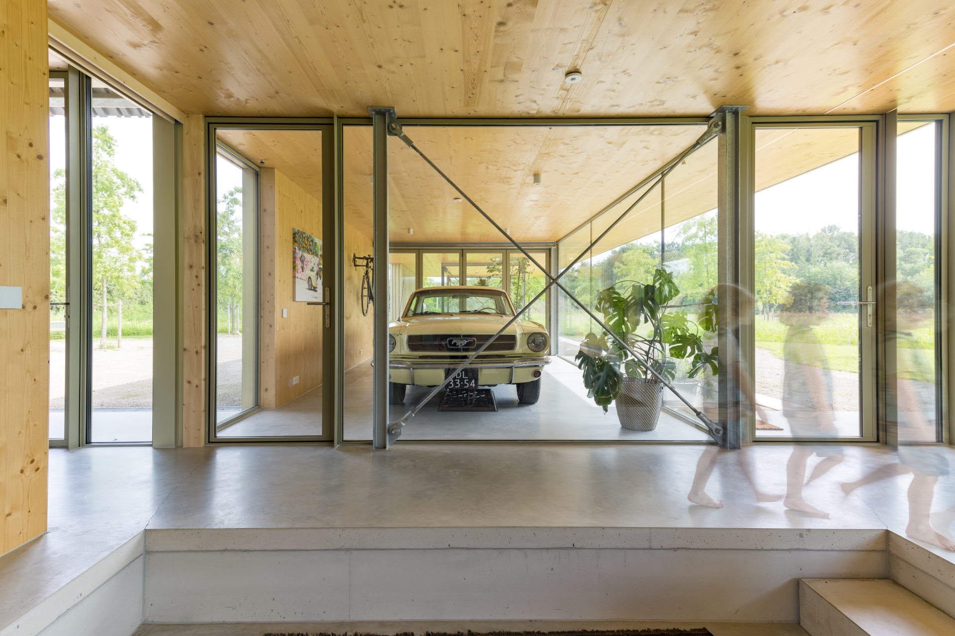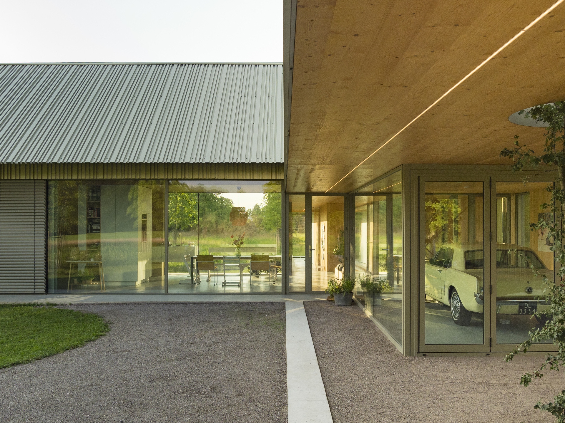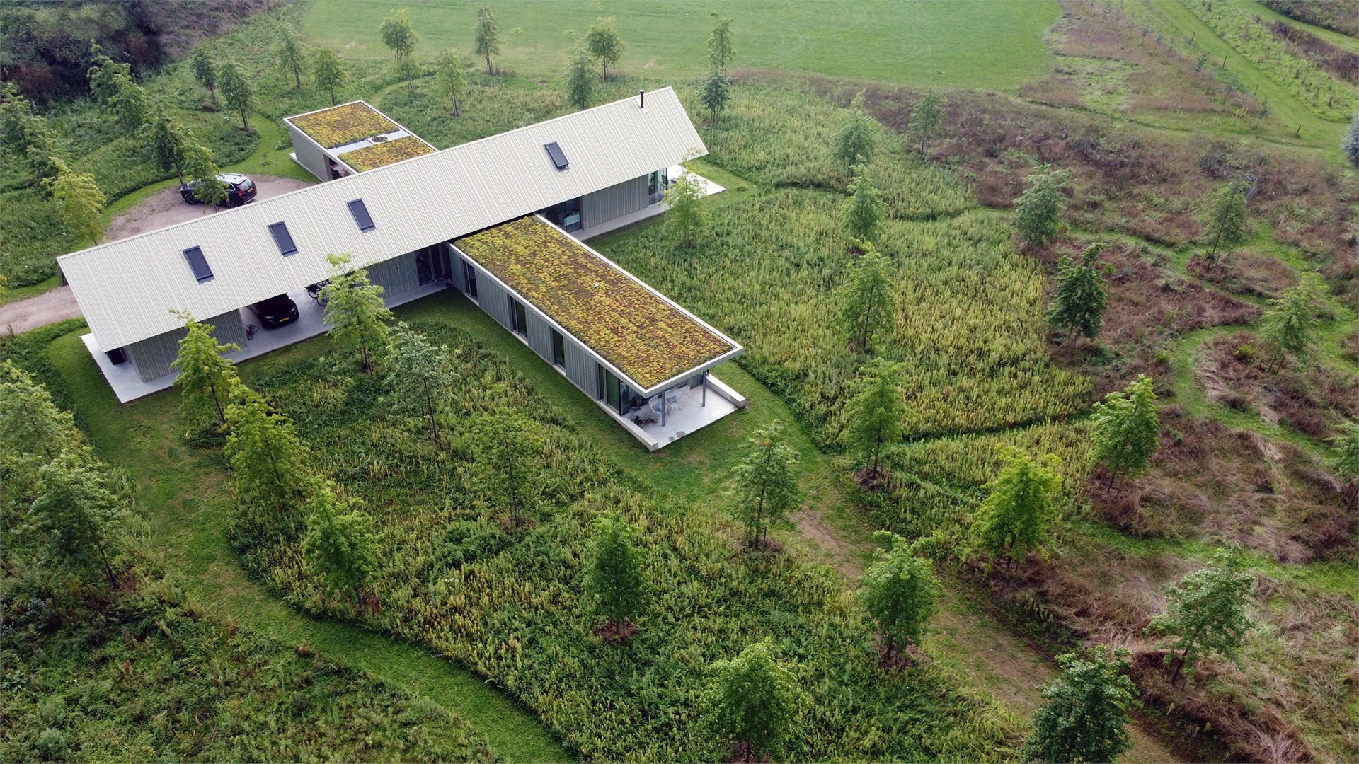 De kruisvormige nieuwbouwwoning is er één vol contrasten, van binnen volledig van hout (CLT) en van buiten sculpturaal met een stalen bekleding. Het huis biedt zijn bewoners een rustplek om zich terug te trekken maar tegelijk volop te genieten van het omringende groen. In de toekomst zal het langzaam worden opgenomen in het nieuw aangeplante bos.