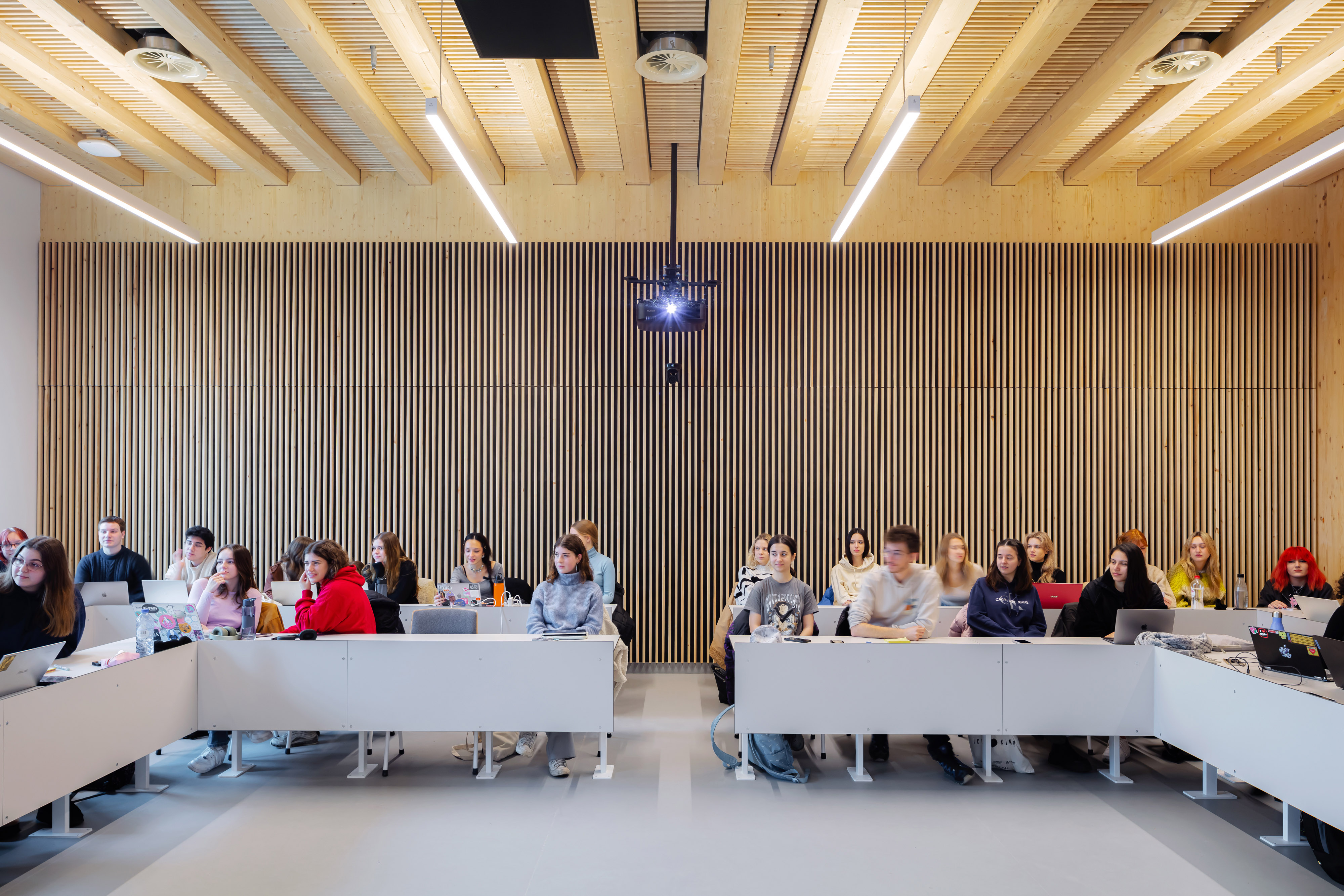 Marga Klompé Building is het eerste collegegebouw in Europa dat volledig is opgetrokken uit massief hout. De architectuur is een eerbetoon aan het monumentale Cobbenhagengebouw op de campus, en biedt een nieuwe stimulerende onderwijsomgeving voor de studenten en docenten.