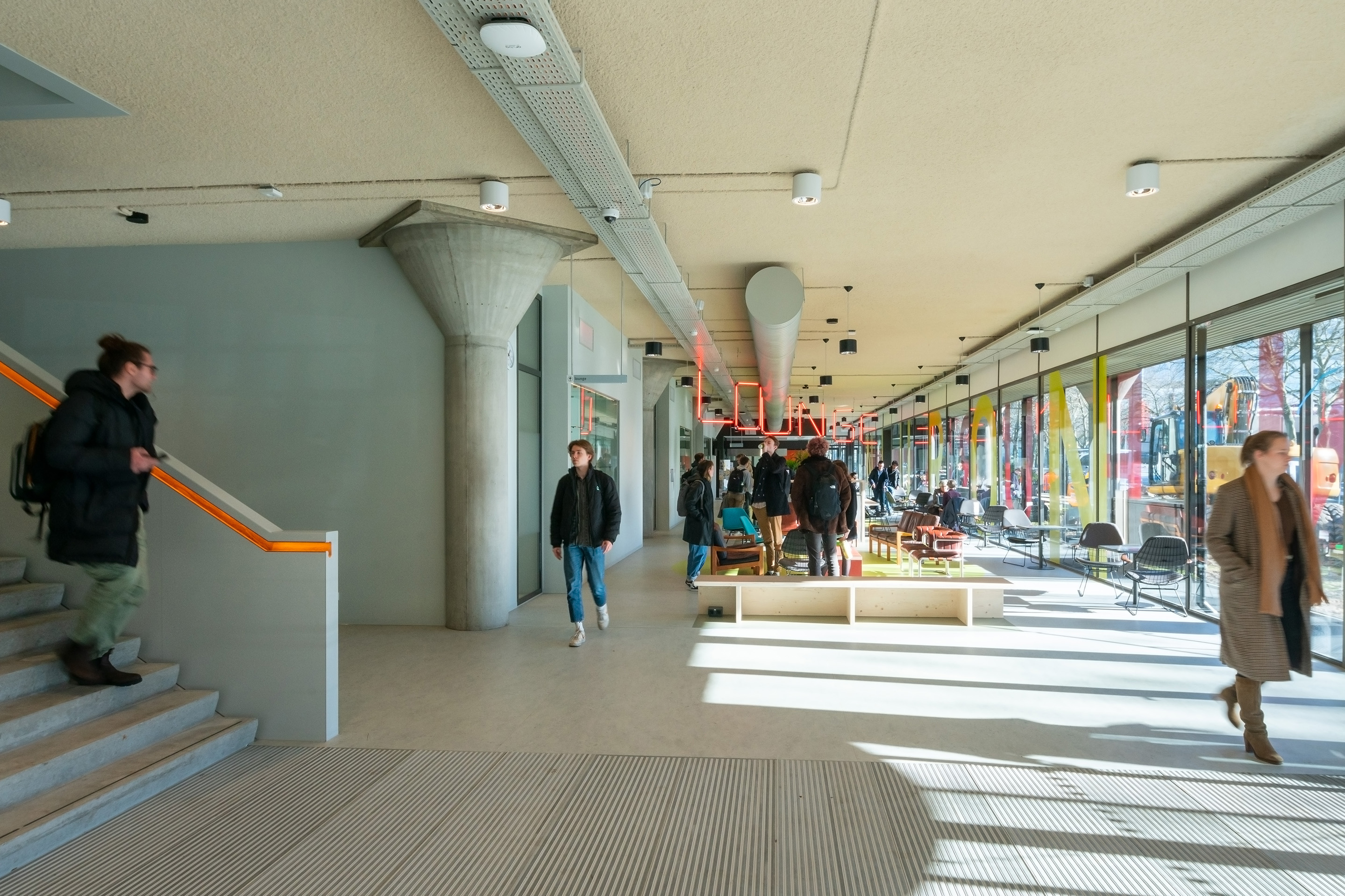 Kenmerkend voor de architectuur van het oude Laplace is de ‘gespierde’ betonnen tafelconstructie met herkenbare trompetkolomstructuur op de begane grond en de ‘fragiele’ patio-structuur, een ranke verdieping met glas en staal. In de oorspronkelijke situatie was de begane grond erg donker. Bijzonder is de innovatieve dubbele gevel met brede luchtspouw op de begane grond, bedoeld voor luchtverversing en vochtbeheersing in de oorspronkelijke computerruimte. De begane grond is grotendeels intact gebleven en is ingericht met onderwijszalen en een ontmoetingsgebied met koffiepunt. Om meer daglicht op de begane grond te bren¬gen zijn verschillende ingre¬pen gedaan, zoals het herge¬bruiken van het staal van de patio’s. Team V heeft het kenmerkende maatsysteem van de patioconstructie be¬houden. Tegelijkertijd zijn de dakramen efficiënter benut, waardoor meer daglicht de begane grond bereikt.