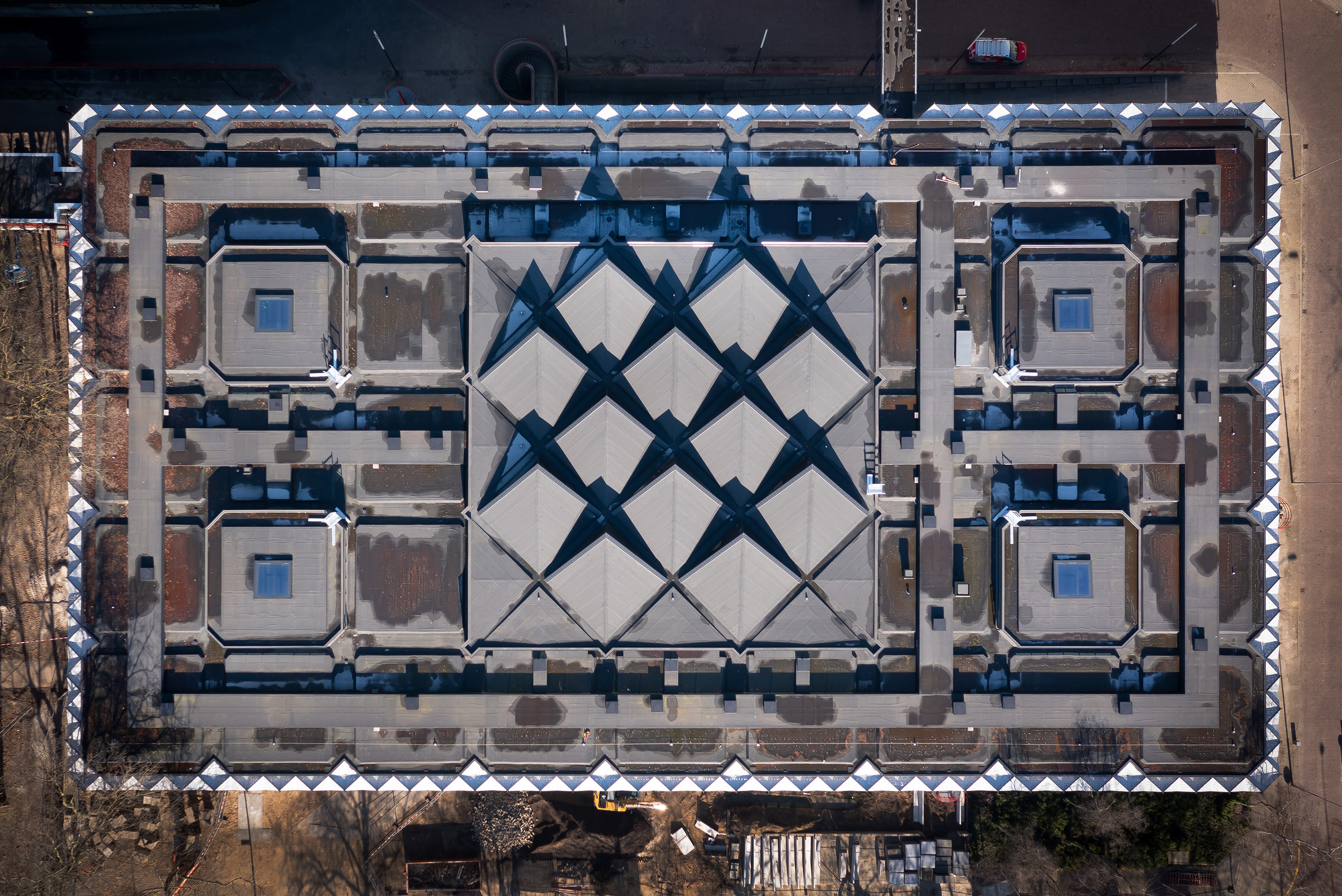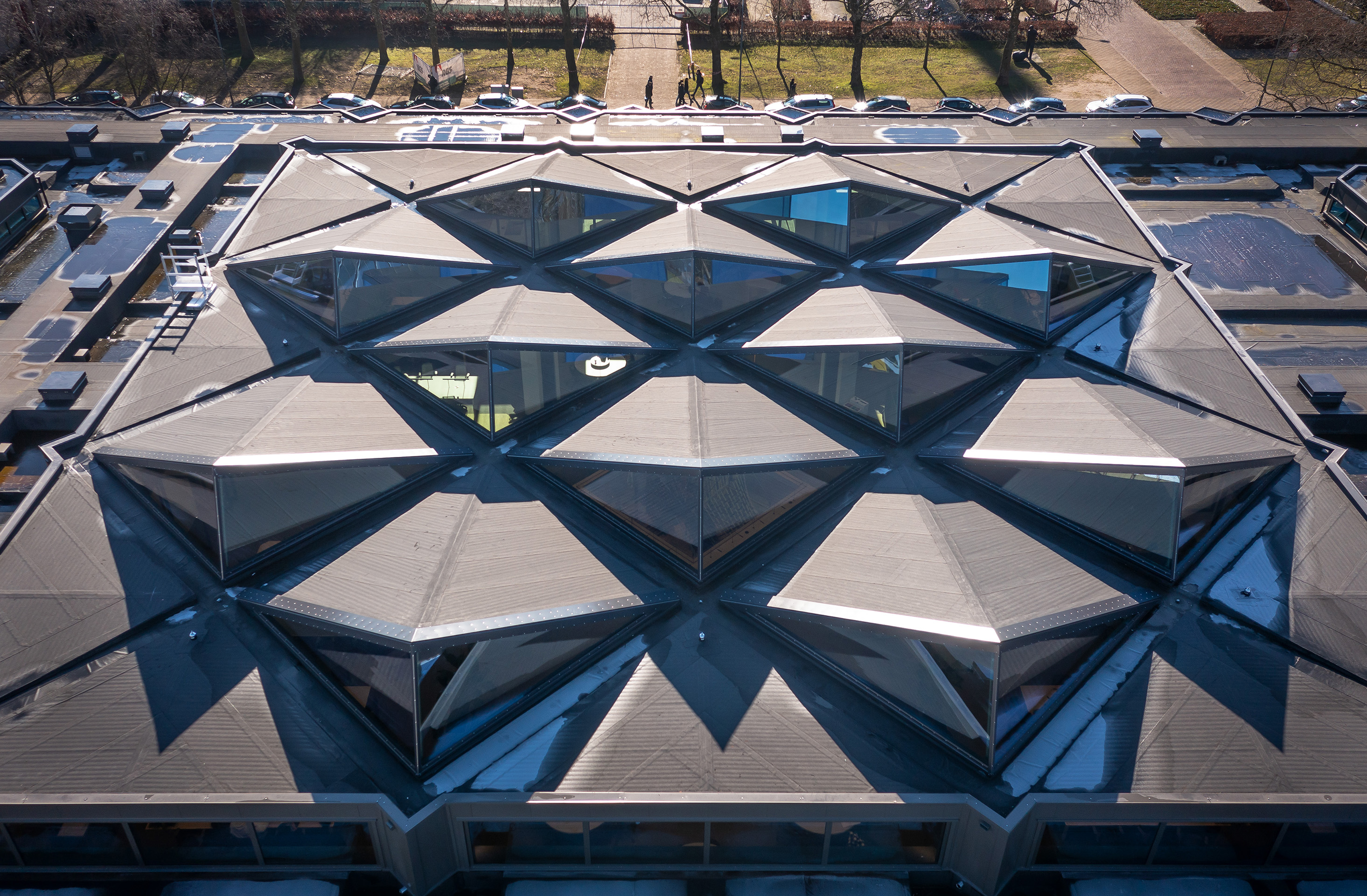 De vier middelste pa¬tio’s zijn overkapt met een groot CLT dakconstructie met daklichten, die boven het dakniveau uitsteekt. De houten kapconstructie heeft twaalf dakelementen, als een soort piramidedak. De vier buitenste patio’s zijn behouden en ver¬beterd. Een royale, representatieve ruimte midden in het gebouw is ontstaan, die met een vide wordt verbonden met het ontmoetingsgebied op de begane grond en brengt licht en ruimtelijkheid in het hart van het gebouw.