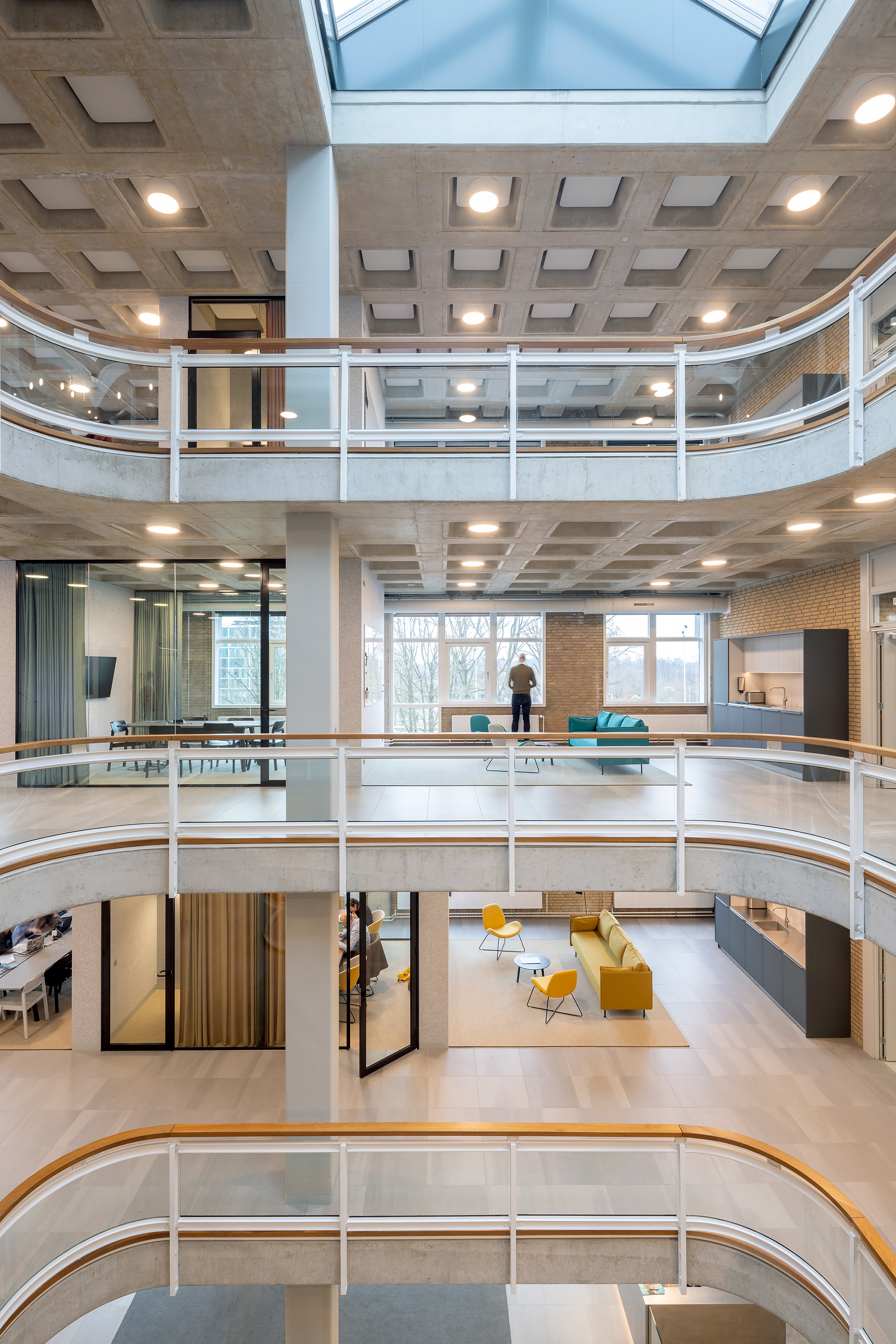 Vanuit het maatsysteem en de waardering voor de esthetische kwaliteit van de constructie gaan nieuwe toevoegingen, als de overkapping van de binnentuin en de nieuwe entreeluifel, op eigentijdse wijze een relatie aan met het bestaande. Nieuwe toevoegingen onder de bestaande cassettevloer, zoals de ankerpunten, zijn zorgvuldig uitgelijnd en worden als herkenbare nieuwe toevoegingen vrij gehouden van de bestaande structuur.