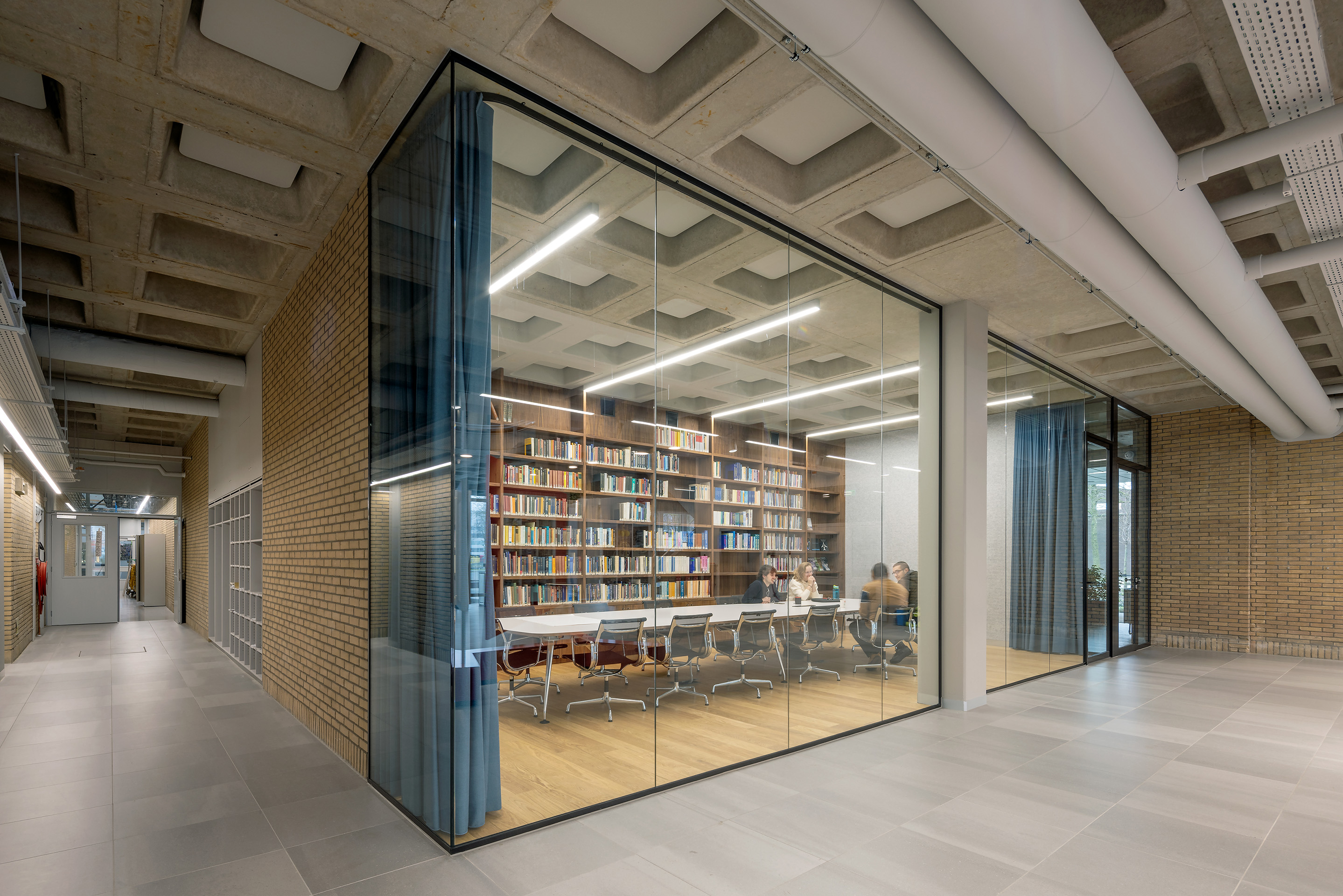 Ook het materiaalgebruik van nieuwe elementen vindt aansluiting bij het eerlijke palet van het bestaande gebouw. Zo wordt de balie, met een link naar de hoogwaardige instrumentmakerij, aan de buitenzijde afgewerkt met richtingloos geborsteld roestvrijstaal. En worden de ontmoetingsruimtes in het atrium en de entreehal voorzien van eiken parket om het huiselijke en openbare karakter van deze functies te versterken. Om het bestaande gebouw een meer voornaam en warm uiterlijk te geven worden de kastenwanden en tafels op de ankerpunten en in de bibliotheek in notenhout uitgevoerd.