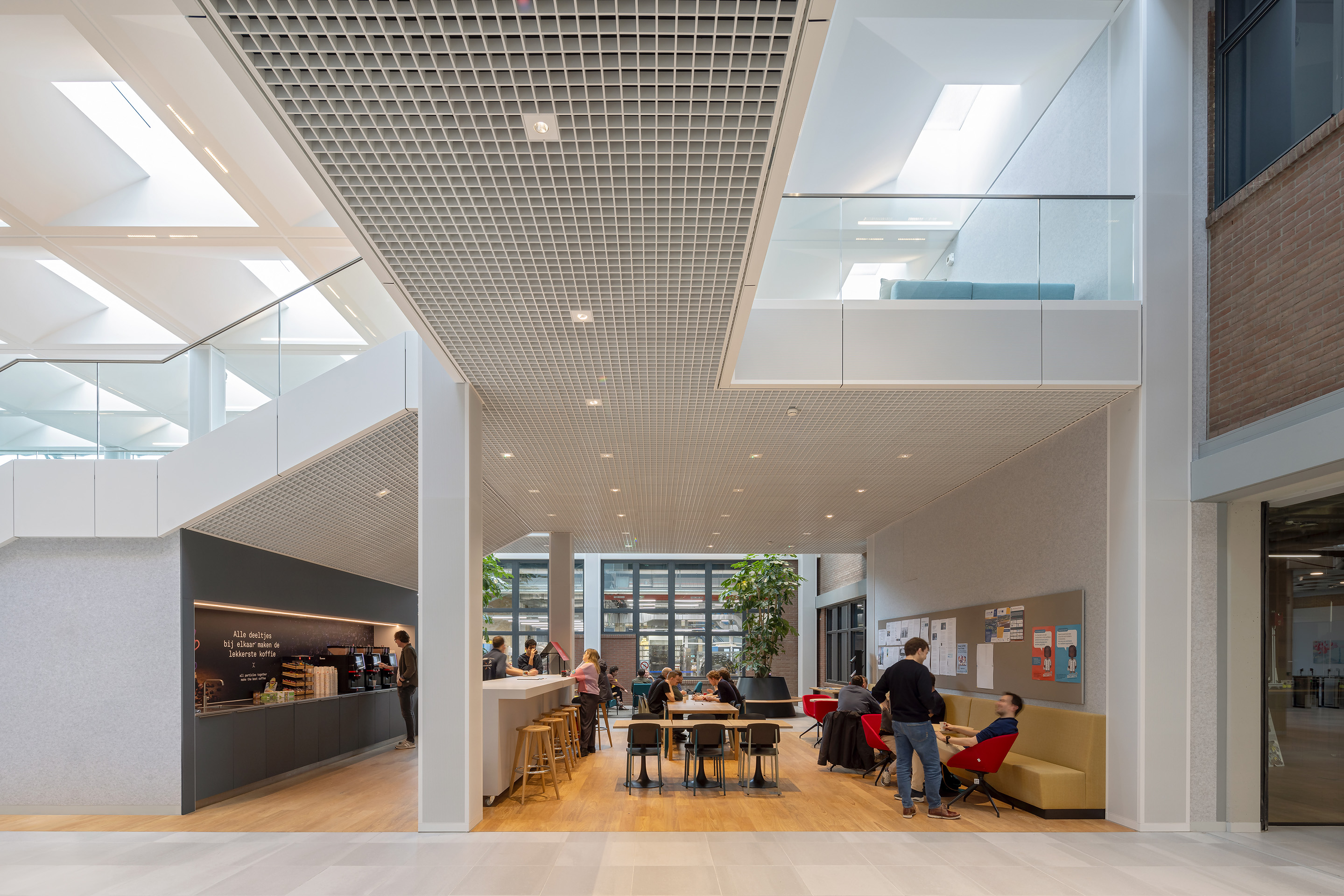 Aanvullend aan de neutrale basis wordt met de stoffering kleur in het gebouw gebracht. Het kleurenpalet is eveneens afgestemd op metalen die in de werkplaats gebruikt worden.