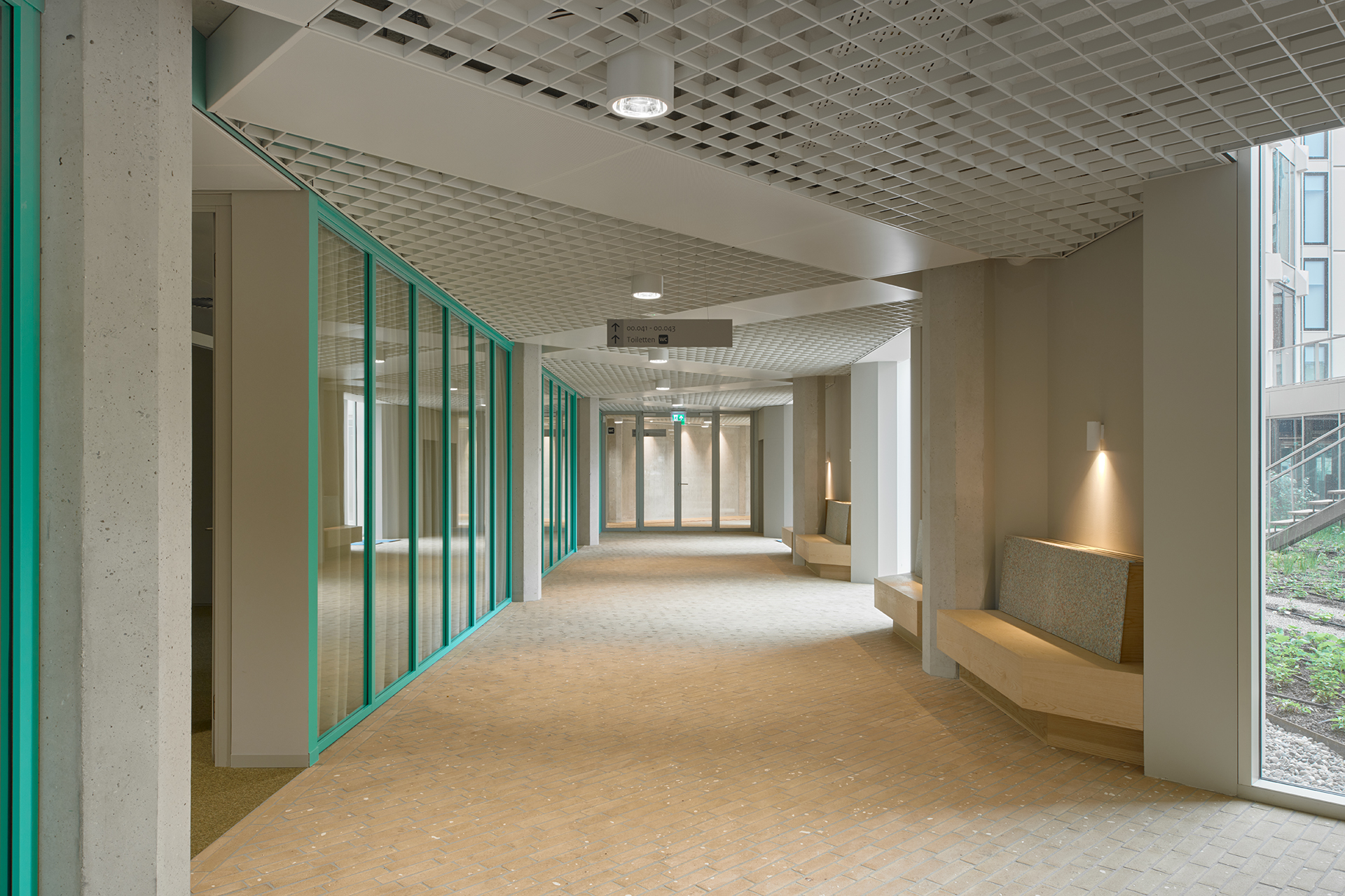 binnen vouwt. Met deze effectieve ingreep wijzigt het gebouw wezenlijk. Waar het gebouw zich door de bestaande inspringende nissen naar binnen keerde, richt het gebouw zich met de erkers juist naar buiten. Zo transformeert het gebouw van een gesloten pand naar een open, uitnodigend gebouw dat contact maakt met de omgeving. De borstweringen en het bestaande verlaagde plafond verwijderen we om nog meer daglicht binnen te halen. Hierdoor neemt ook de vrije hoogte en daarbij de kwaliteit van de kantoorvloer toe. Om het karakter van de betonnen wanden en kolommen te versterken zijn ze geschuurd en volledig in het zicht gelaten. Kleur wordt gebruikt aan het einde van zichtassen en om belangrijke objecten zoals entreebalie en hoofdtrap aan te geven, zodat gebruikers op natuurlijke wijze door het pand kunnen navigeren.