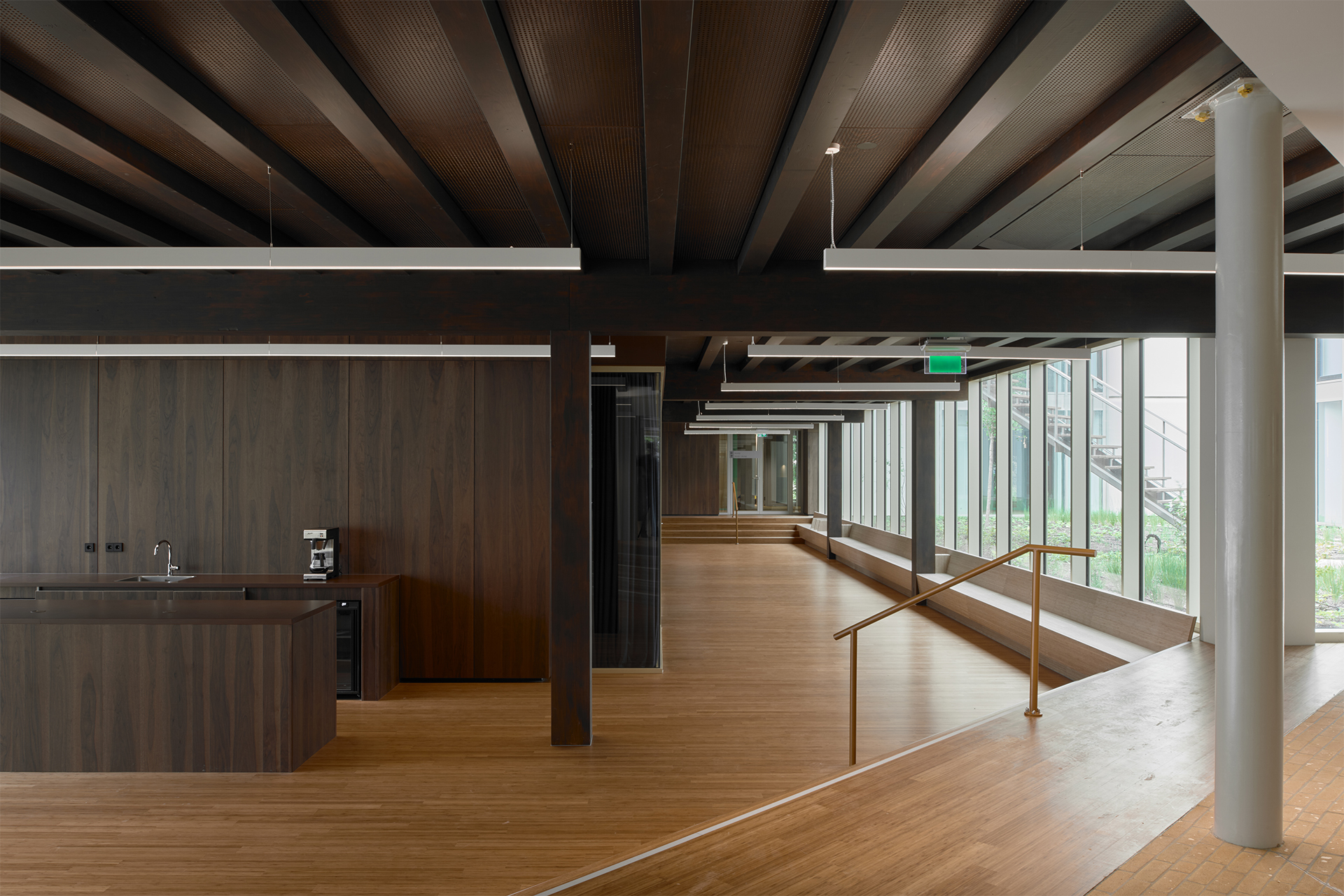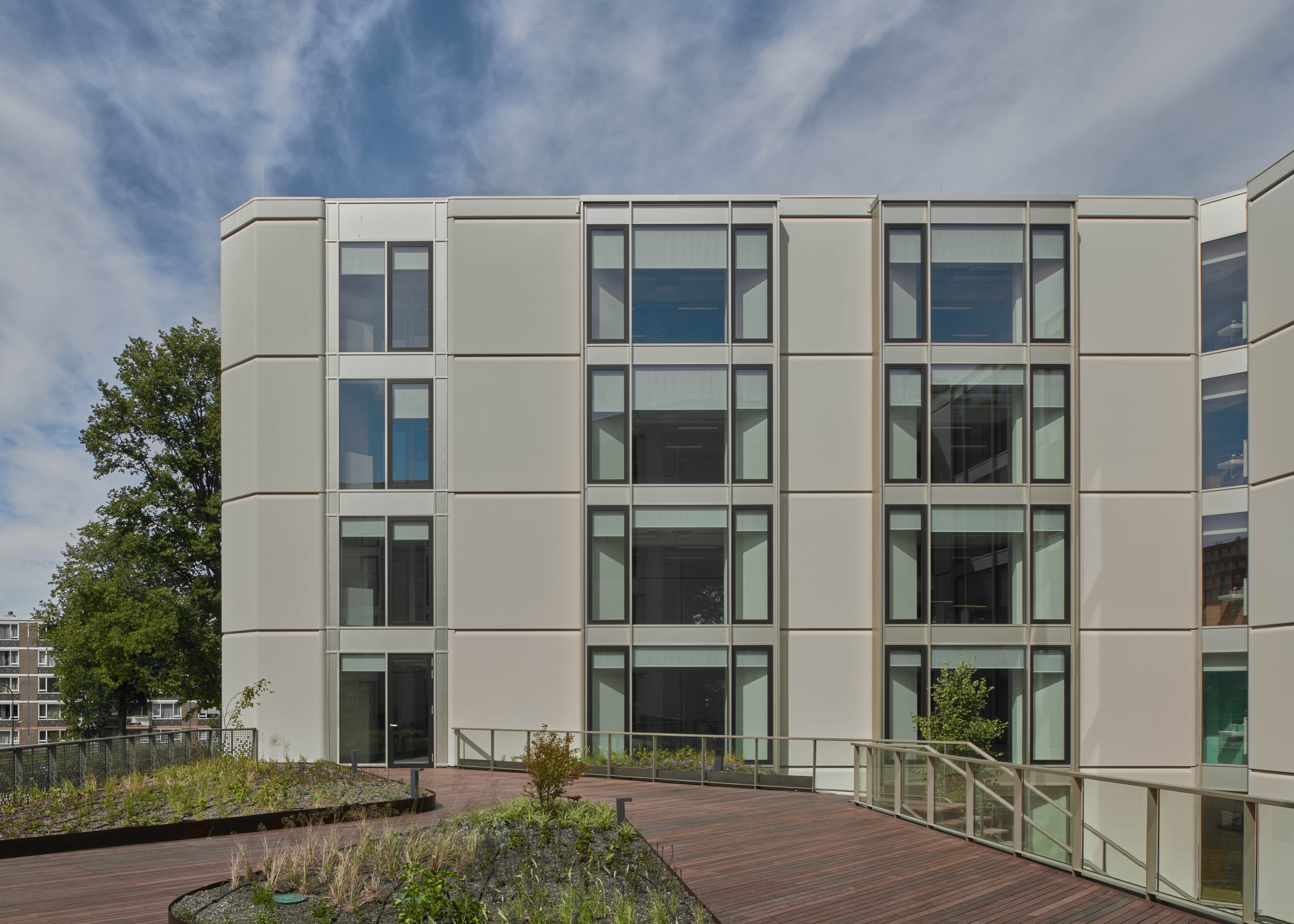 constructieve uitgangspunten van het huidige gebouw. Hiermee sparen we een nieuwe fundering uit, doorgaans één van de meest milieuvervuilende elementen van een gebouw. De aanbouw is circulair, demontabel én remontabel ontworpen. Om karakter toe te voegen en een duidelijk onderscheid te maken tussen het bestaande gebouw en de aanbouw, zijn zowel de vloeren, wanden als constructie van de aanbouw uitgevoerd in hout.
