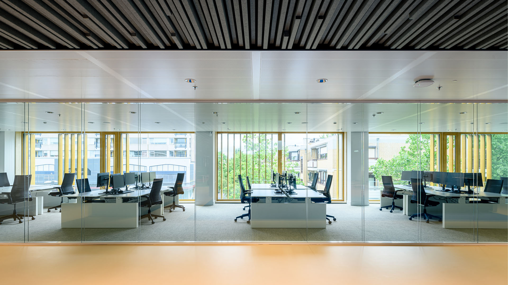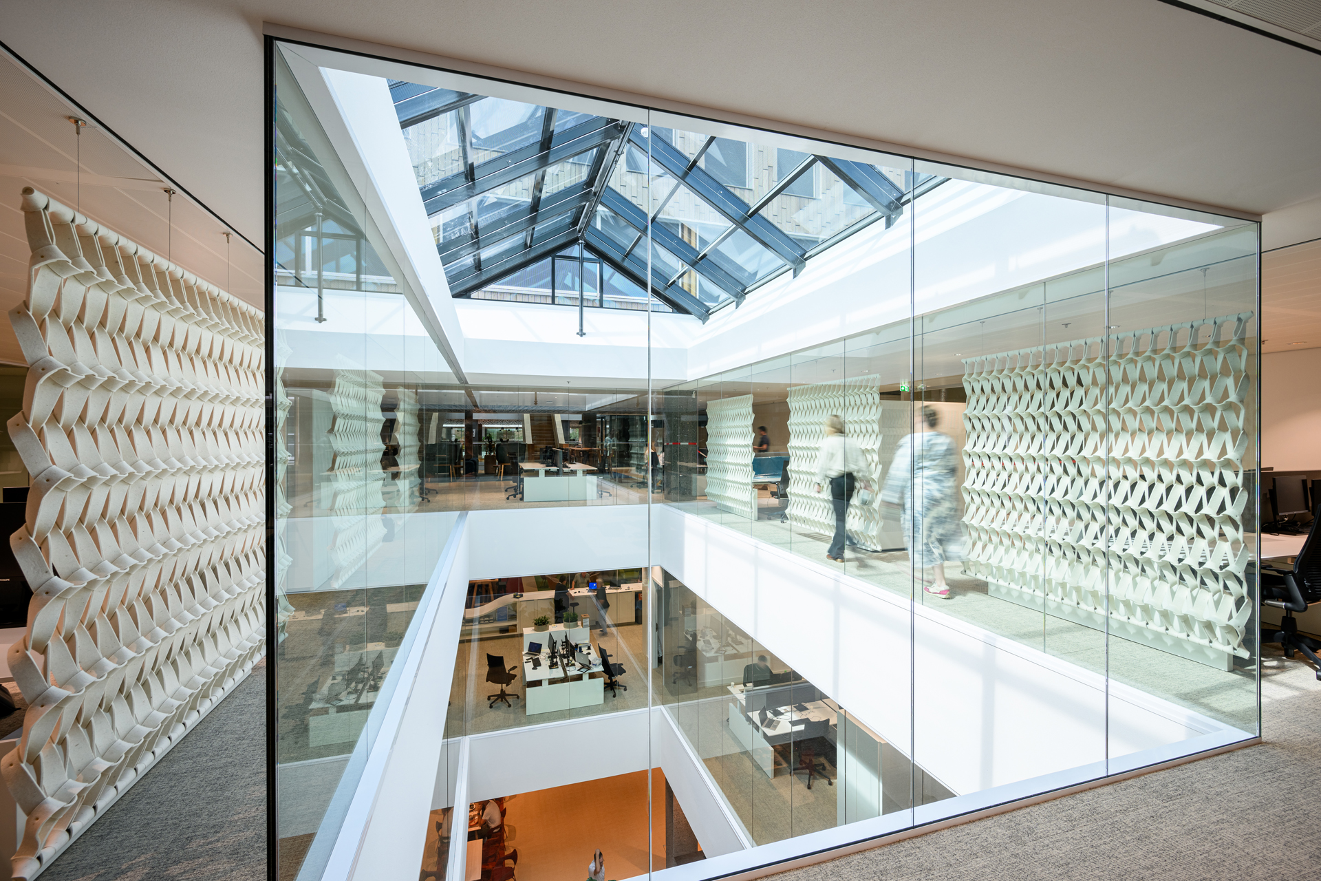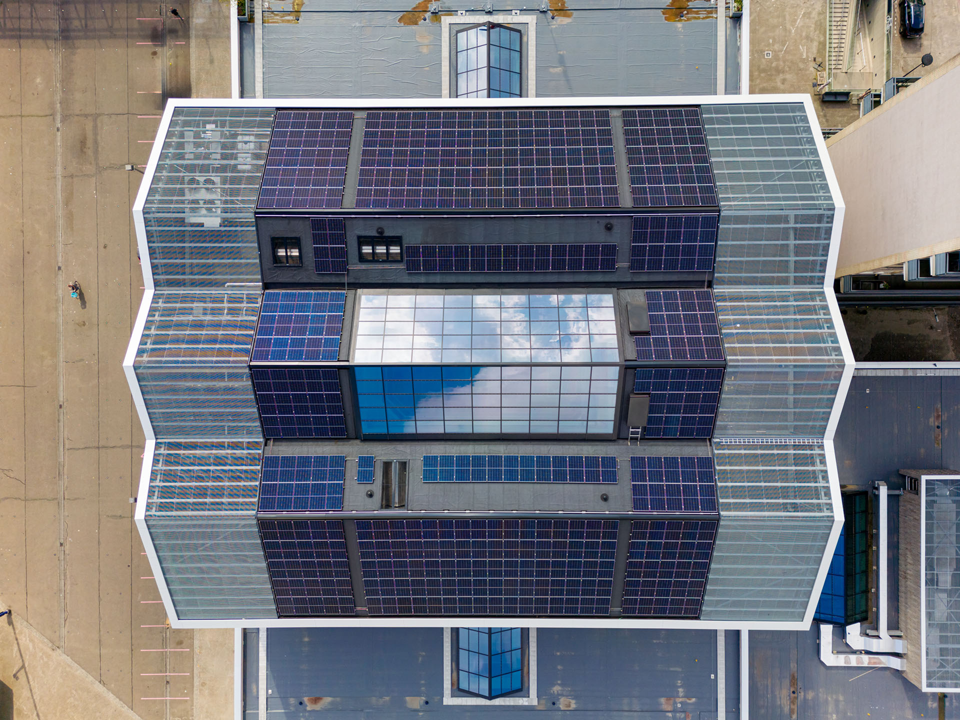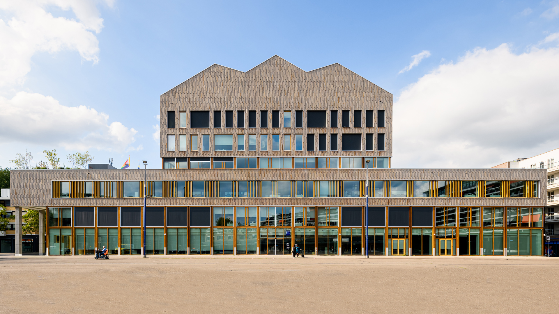 De 90.000 geschroefde latten, van verschillende dikte, geven het gebouw een ruwe schorsachtige structuur en een unieke identiteit. In contrast daarmee zijn de houten kozijnen en vliesgevels blank gelakt. De transformatie is zo uitgevoerd dat alles later weer volledig te demonteren is: kitten en purren was verboden. Het gebouw heeft een kap gekregen om de installaties te integreren en de PV-panelen in een ideale hoek te kunnen plaatsen. Door het toevoegen van die houten kroon transformeert de oude monoliet in een eigentijds huis van de stad. Het nadenken over circulariteit heeft hier geresulteerd in een tot de verbeelding sprekende iconische architectuur.