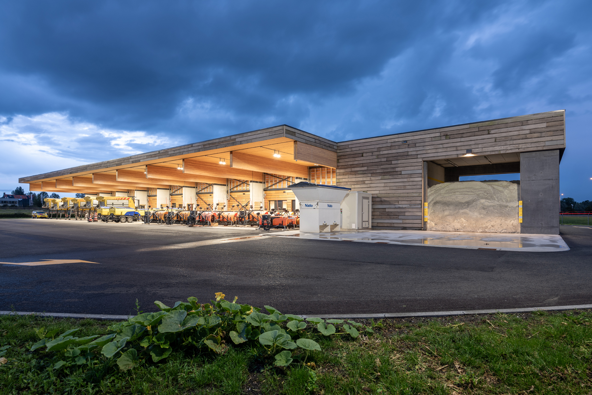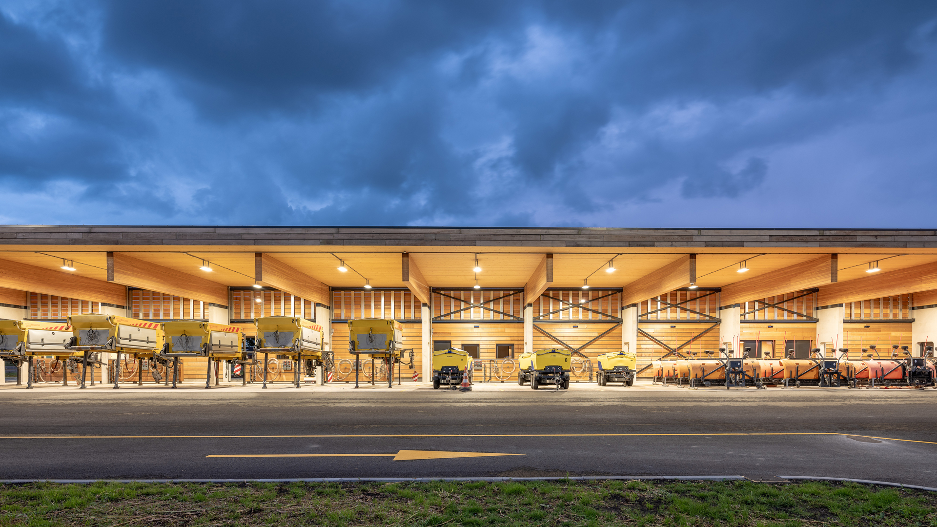 De ‘kolomloze’ stalling aan de noordzijde kraagt tien meter uit en is hierdoor flexibel indeelbaar. Het materieel wil namelijk nog wel eens veranderen van aantal en afmeting. Door geen kolommen aan de voorkant van de stalling toe te passen, is de stalling bovendien beter en overzichtelijker in gebruik en is er geen aanrijdgevaar voor kolommen.