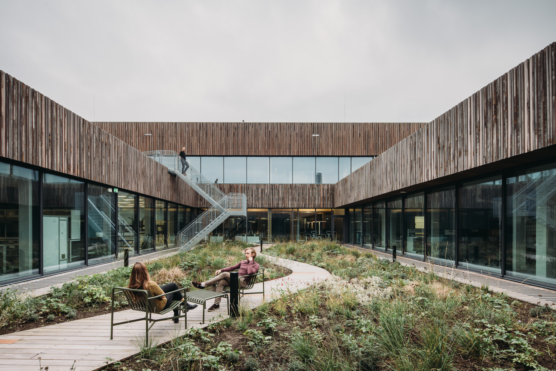 Het laboratorium van Aquon in Houten biedt geavanceerde faciliteiten in een inspirerende, circulaire werkomgeving die samenwerking en innovatie stimuleert. Het houten middengebied vormt het hart van het gebouw en wordt gecombineerd met een beton-staalconstructie voor het laboratorium. Hergebruikte houten meerpalen benadrukken de duurzame visie.