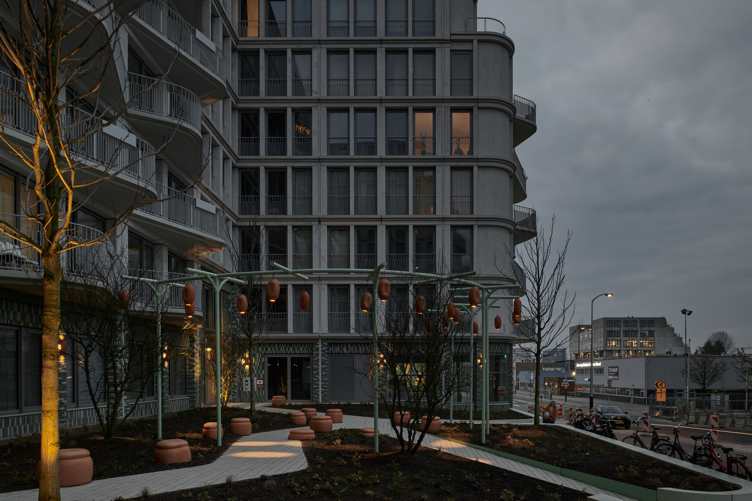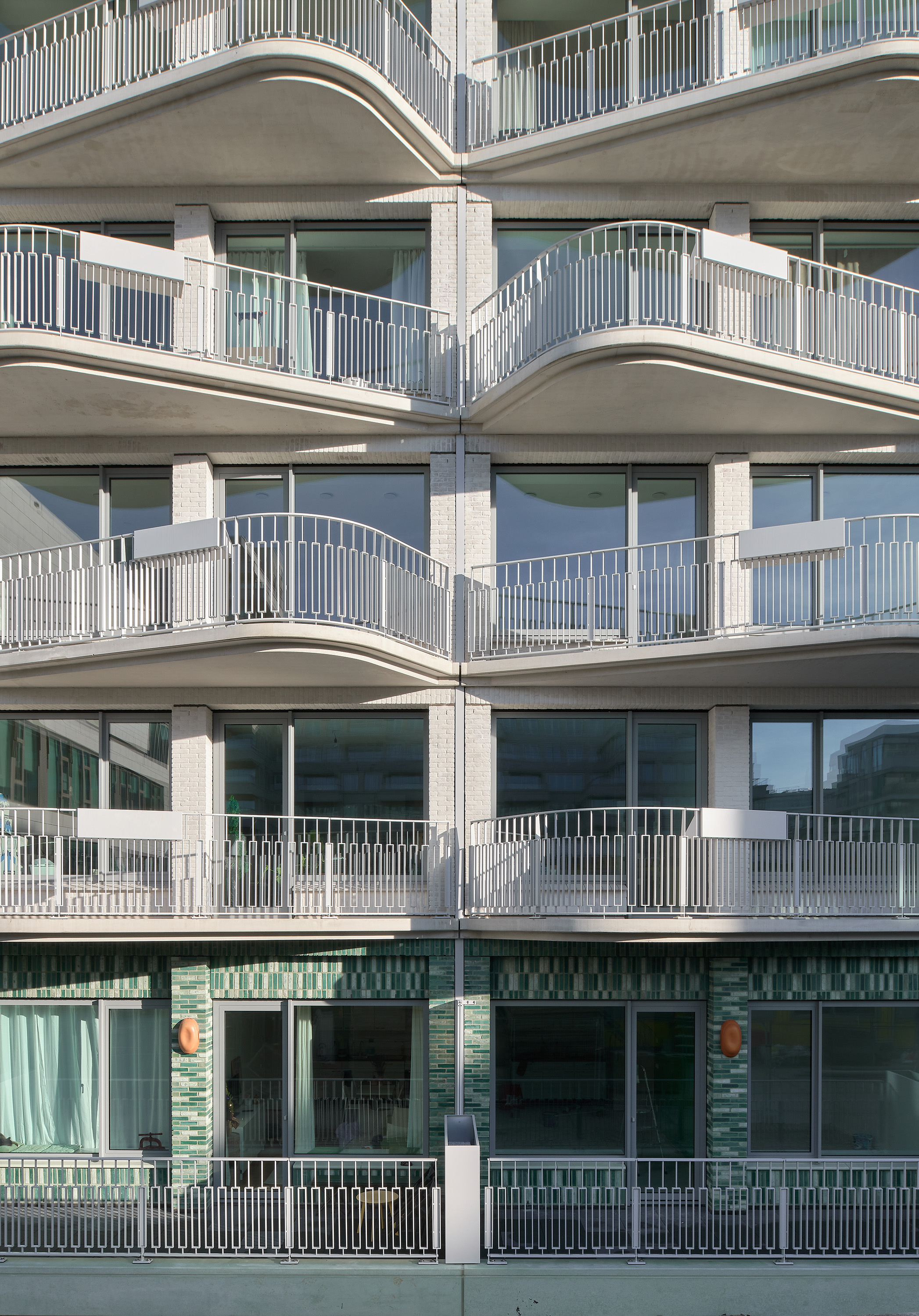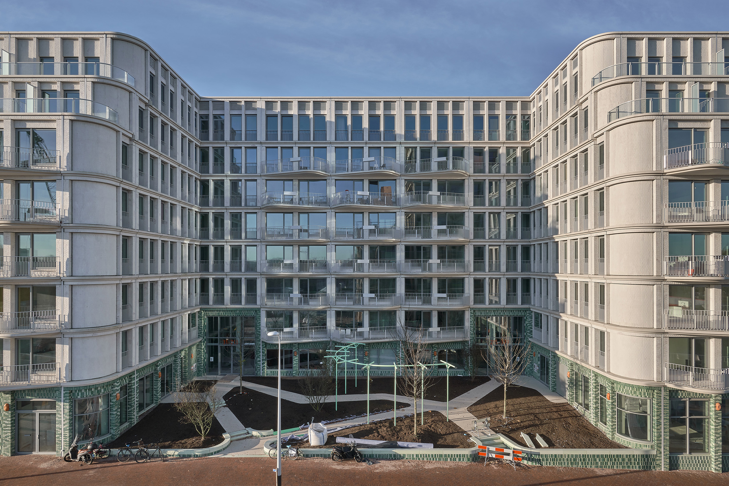 Het idee was om een dusdanig slimme en efficiënte systematiek voor de bouw te bedenken zodat er geld over zou zijn voor afwerking en inrichting. De opzet is simpel: van modules van prefab beton is een U-vorm gemaakt met twee spiegelbeeldige helften. In de ‘oksels’ zijn er twee symmetrische en royale hoofdentrees die met een voortuin aan de Docklandsweg liggen. Zowel de gevels, de balkons als het casco konden uit prefab elementen worden opgebouwd. De begane grond is versierd met langwerpige zeegroene tegels met glanzend glazuur van Tichelaar en om kosten te besparen is een derde van de bakstenen gecementeerd.