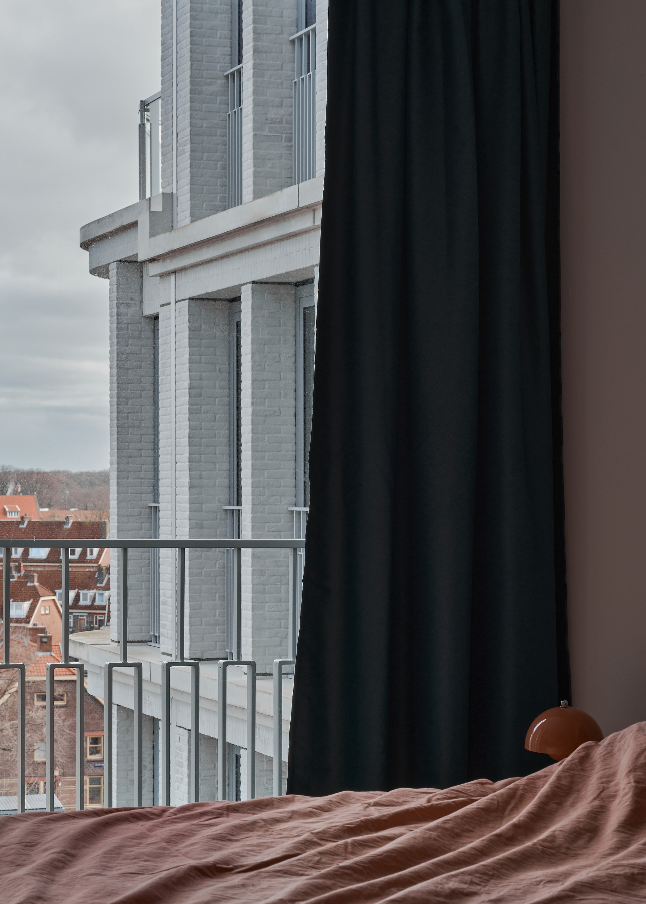 De August is een van de weinige sociale woningblokken op de wijk Overhoeks, dat in totaal 26 woonblokken bevat. Belangrijke uitgangspunten voor De August waren: identiteit van Amsterdam-Noord, verbinding met de Van der Pek-buurt, betaalbaarheid, thuis voelen en verzachten. Terwijl de Van der Pek-buurt de komende jaren gerenoveerd wordt, krijgen veel bewoners tijdelijk vervangende woningen in De August. Als tegenhanger van de rigide stedenbouwkundige structuur van Overhoeks is het gebouwontwerp ‘verzacht’ met afgeronde hoeken, pastelkleuren en tastbare materialen. Team V ontwierp vooral een betaalbaar en slim gebouw. Door slim om te gaan met het budget, wilde Team V juist graag geld investeren in de plint, waarmee de focus op het thuiskomen gelegd kon worden. Het gebouw is opgebouwd in twee delen: van een bijzonder tapijt van groen landschap en een kunstzinnige plint naar een prefab bouwsysteem voor de woningen. Om het bouwsysteem te verbijzonderen, is een type driehoekig balkon ontworpen dat per verdieping wordt gespiegeld. Aan ieder balkon is een metalen bak bevestigd voor planten of om als ‘balkonbar’ te gebruiken. De pièce de resistance zijn de lampen en de zitmeubels ontworpen door kunstenaar Kiki van Eijk in de voortuin. De ‘poefjes’ in de tuin zijn van roodbruin steengoed, ieder afzonderlijk met de hand gemaakt. Er hangen wandlampen aan de gevel en hanglampen aan de pergola. Bewoner Nicole: “Het uitzicht is geweldig. Ik heb een ruime, heerlijke woning, het gebouw is apart en speels en ik ken al veel mensen in de buurt. Ik zou nergens anders willen wonen in Amsterdam, dat meen ik echt.”