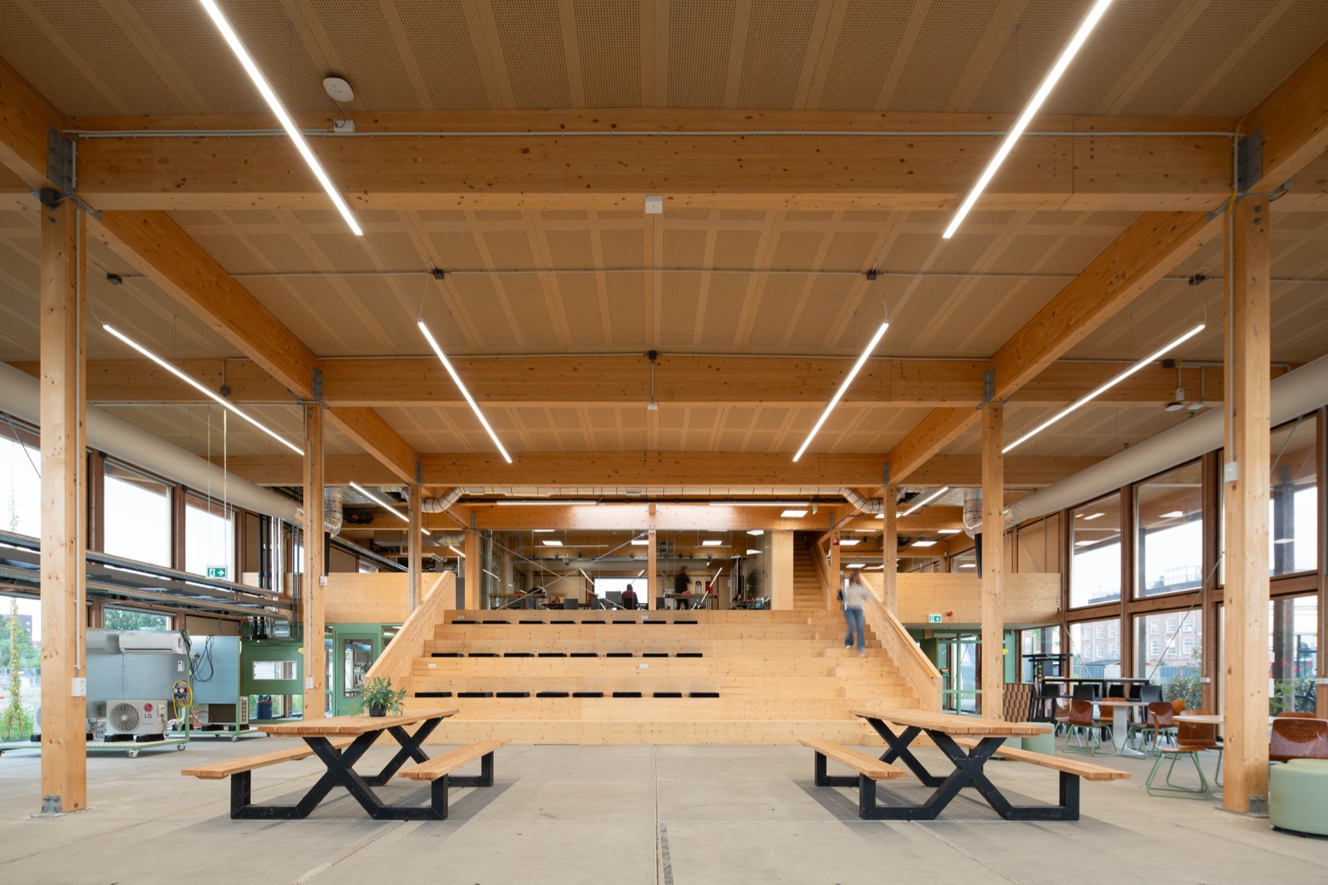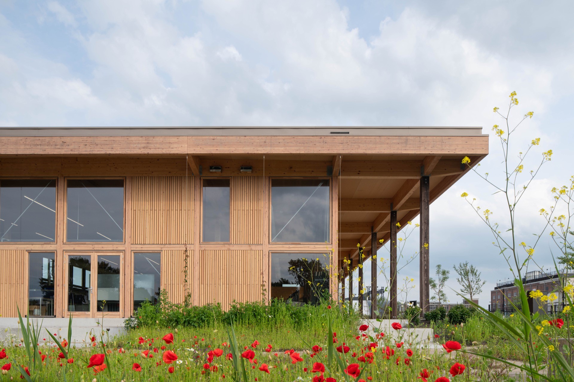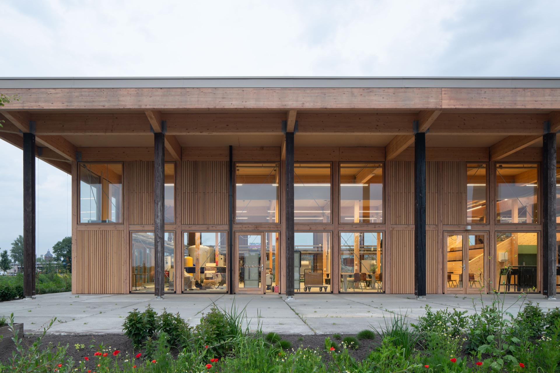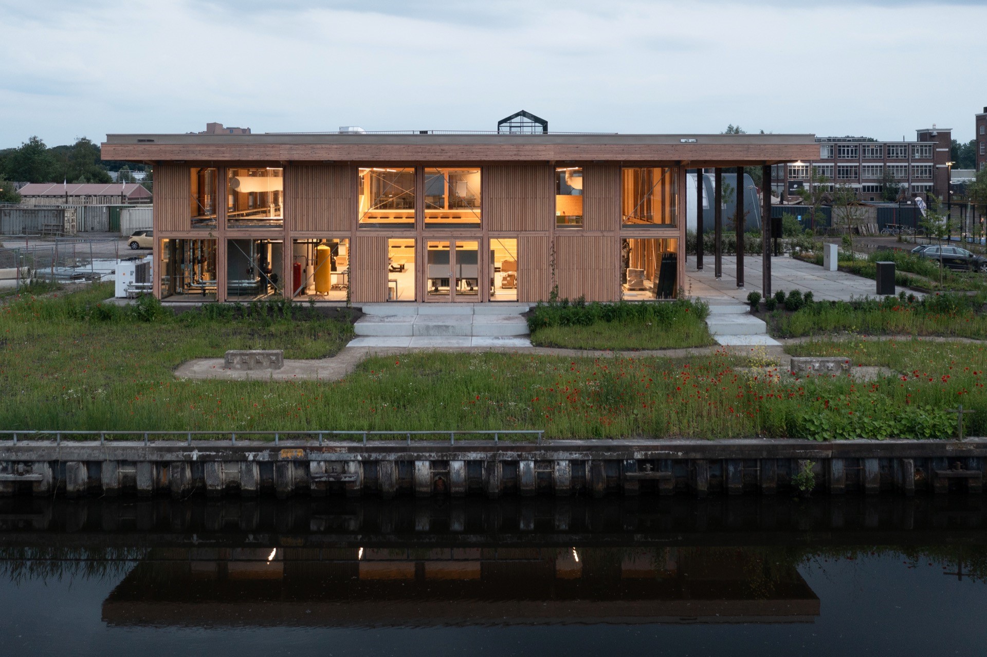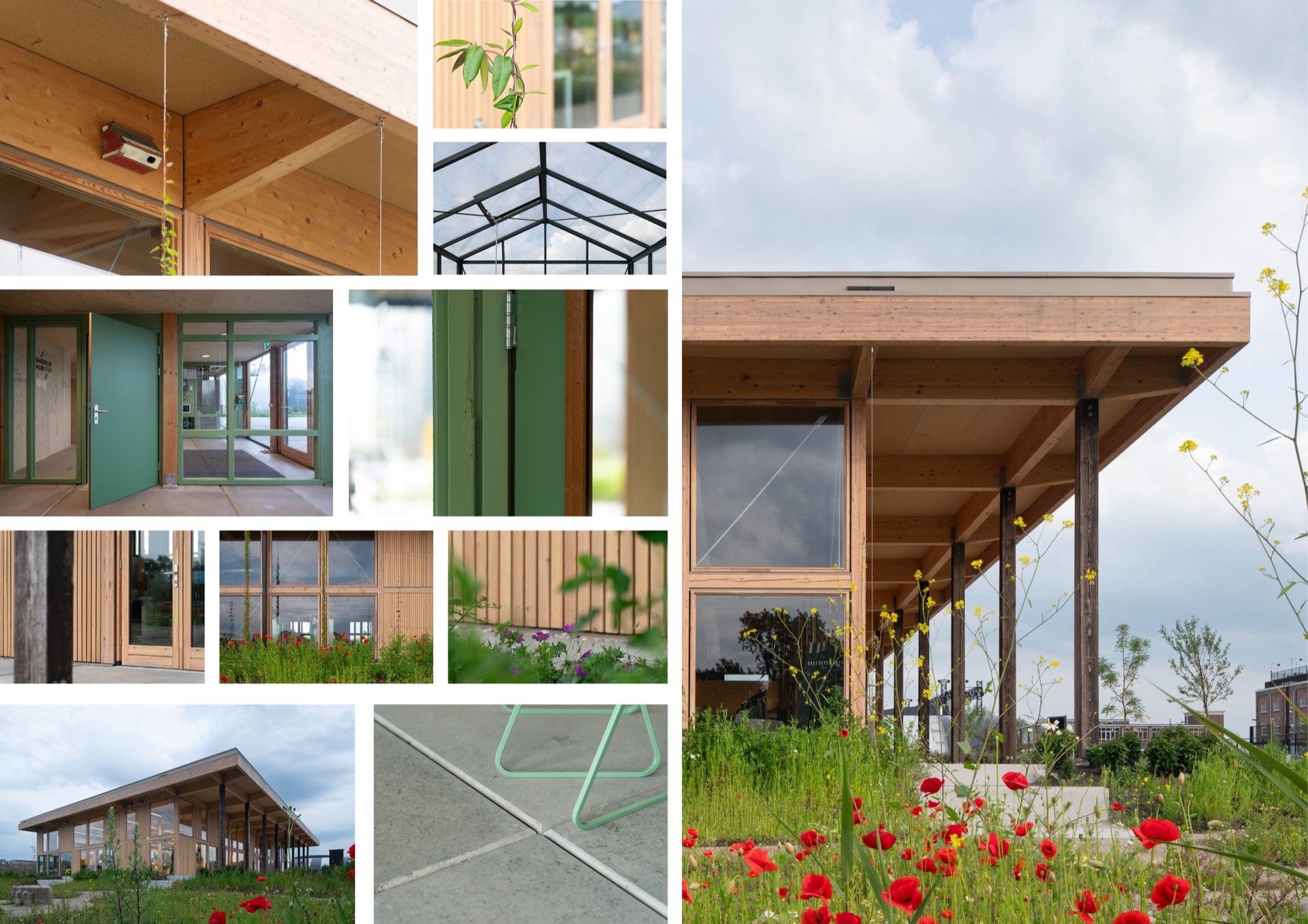 De Unie Architecten ontwierp voor de opleiding Energietransitie van het Alfa-college nieuwe huisvesting op het Suikerterrein in Groningen. Onderdeel van de prijsvraag was het gegeven dat het terrein in 2030 een andere bestemming krijgt en dat de opleiding dan moet verhuizen. De Energiehub050 is daarom van fundament tot schil en interieur ontworpen als een remontabel bouwpakket. Met hulp van een handleiding kan het onderwijspaviljoen binnen een week gedemonteerd worden en elders weer opnieuw neergezet. Dankzij de slim ontworpen modulaire structuur kan het gebouw ook andere configuraties krijgen, waarmee ingespeeld kan worden op veranderende onderwijsbehoeften en de ruimtelijke situatie op een nieuwe locatie. Op die manier behoudt het tijdelijke paviljoen zijn (rest)waarde en kan het mogelijk zelfs in waarde stijgen. Het gebouw is immers na het tijdelijke gebruik elders herbouwbaar, maar ook te demonteren in hele, verhandelbare materialen die opnieuw verkocht kunnen worden. Het gebouw is ontworpen als een aantrekkelijk, alzijdig natuurinclusief paviljoen dat zelf de bouwkundige basis legt voor een natuurlijke energiehuishouding. Het gebouw houdt warmte en kou op bouwkundige wijze buiten. Een groot overstek houdt zomerzonlicht tegen en zorgt voor een aangename overgang tussen binnen en buiten. Het gebouw voegt geen hittestress toe aan de omgeving, de vergroening van terrein en gebouw is integraal meeontworpen. Spandraden tegen de gevel met bloeiende soorten en klimplanten versterken de vriendelijke uitstraling. Een transparante gevel van hout en glas met strakke detaillering zorgt voor een warme, lichte en uitnodigende uitstraling, zowel binnen als buiten. Met een circulaire ontwerpmethodiek is er een BCI score 74% gerealiseerd. Het paviljoen is grotendeels opgetrokken uit van te voren geoogste materialen. Nieuwe materialen zijn lokaal, biobased, demontabel en goed te hergebruiken. De fundering bestaat uit stelconplaten uit de oude Afsluitdijk, met uitneembare funderingsbalken en losse isolatie. Het flexibele, vrije casco is van hout en de buitenkolommen en dragende binnenwanden zijn gemaakt van hergebruikte balken. Gevel en dakelementen zijn van biobased vlas en ESB beplating en hebben een hoge isolatiewaarde. De installaties zijn los van het casco aangehaakt op een modulaire ringleiding, waar ook de educatieve installaties op aangehaakt zijn. Op die manier is het gebouw, met materialen uit het verleden, het bouwpakket van een duurzame toekomst!
