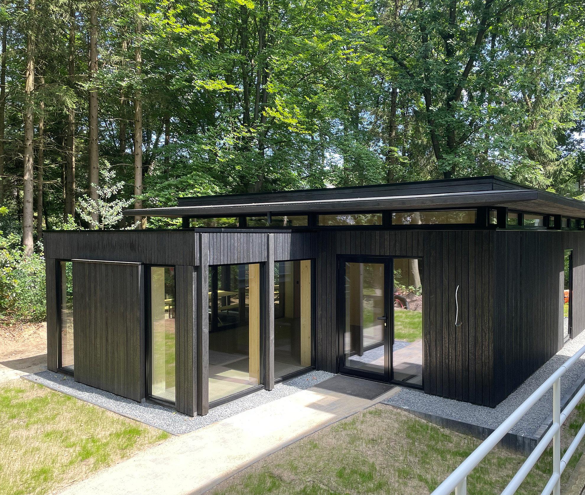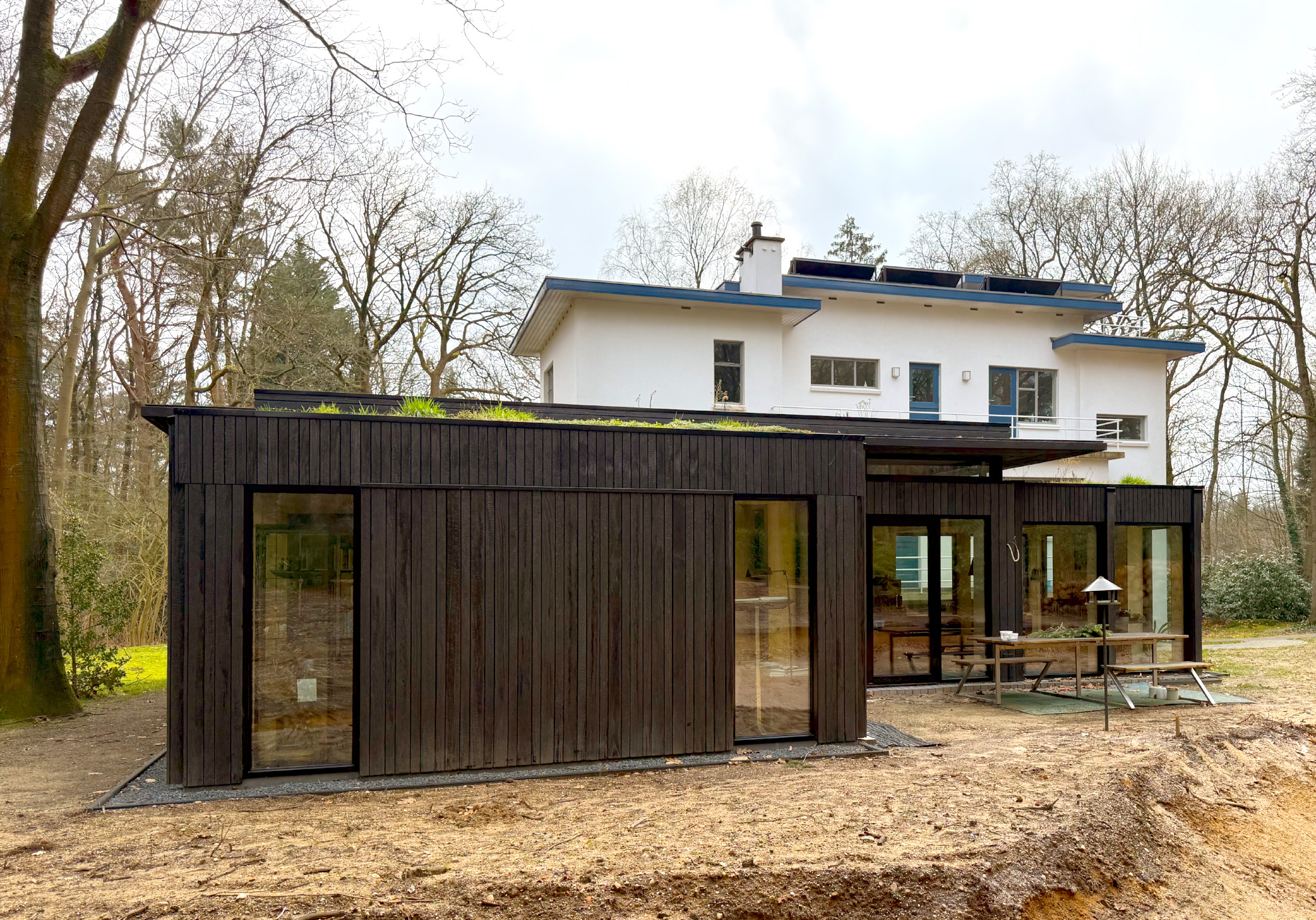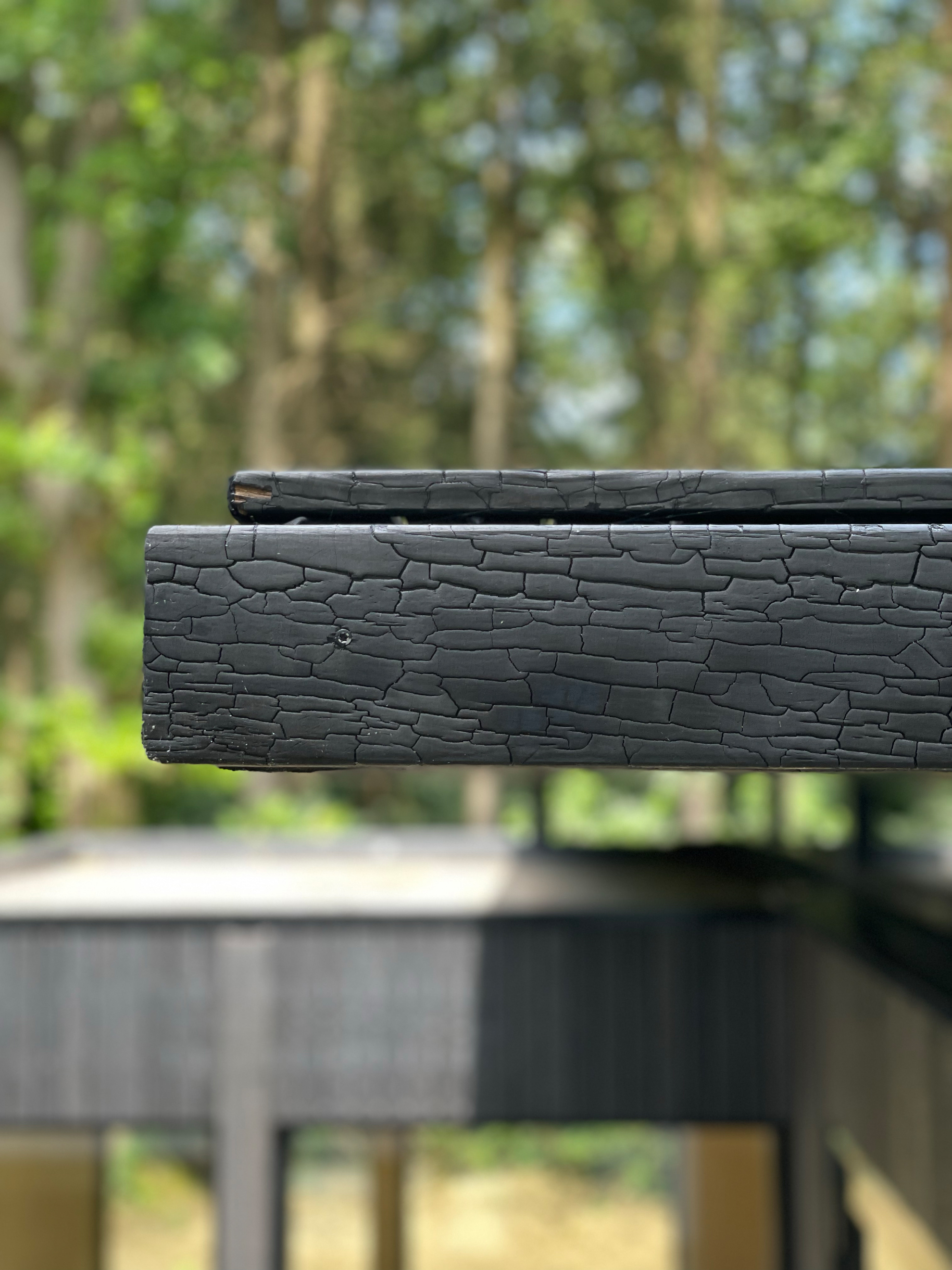 De afwerking met ‘Shou Sugi Ban’ gebrand zwart hout heeft twee redenen. Ten eerste geeft het vanaf de straatzijde een rustige achtergrond voor Huis van Beek. Tweede reden is dat de brandmethode niet alleen een erg duurzaam, onderhoudsarm materiaal oplevert, maar ook een mooi subtiel patina aan het hout geeft. Door toepassing van zwarte aluminium renovatieprofielen hebben de kozijnen een slank uiterlijk die wegvallen in de zwarte houten gevels.