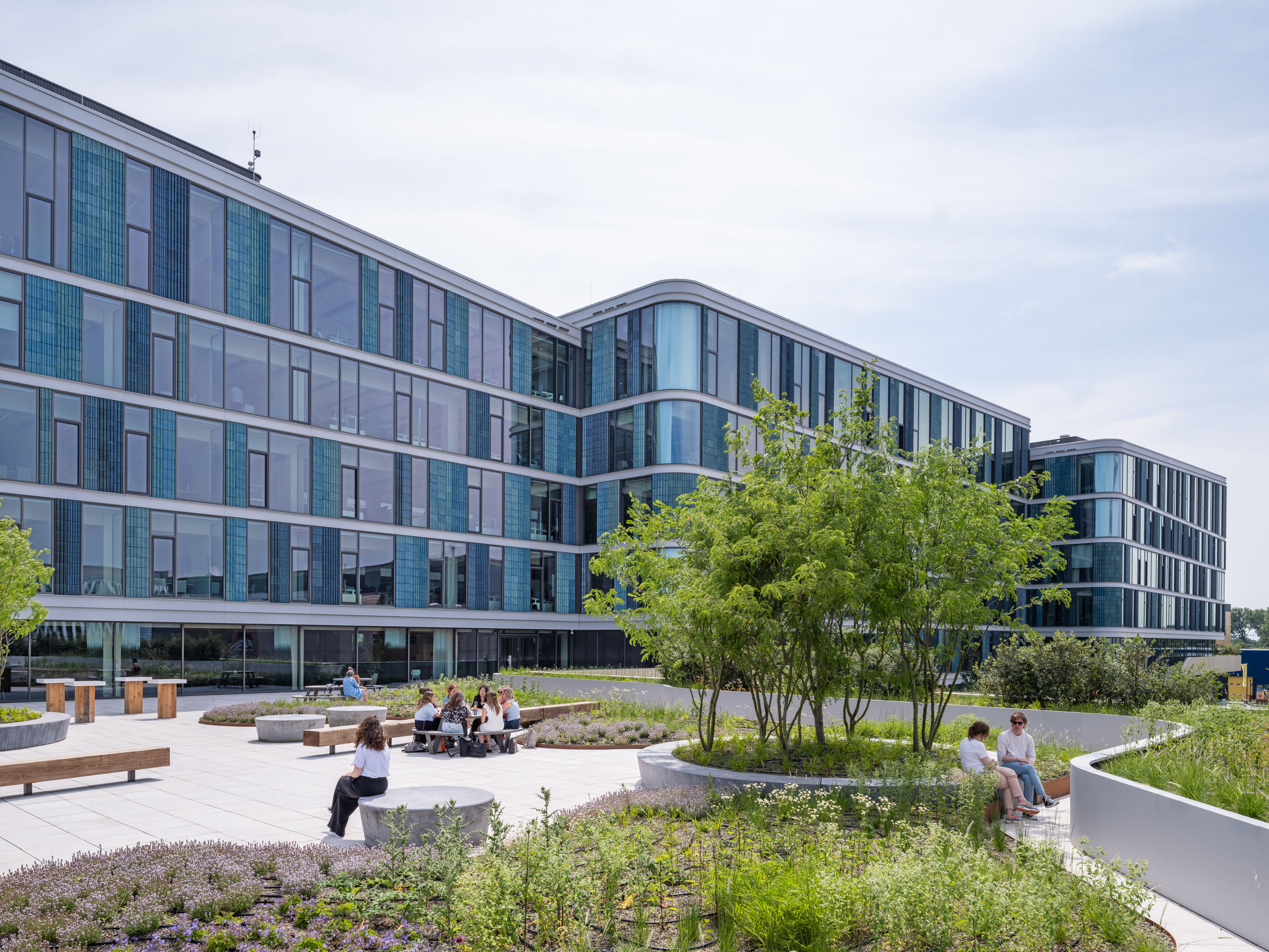 Rondom het gebouw loopt de vormgegeven plint met daktuinen. Door Delva zijn ronde tuinen ontworpen voor de omgeving, de omloop en de terrassen. Op het dak van de Eventspace ligt een grote daktuin, toegankelijk voor medewerkers. Het is ingericht met overwegend lokale plantensoorten die de biodiversiteit ondersteunen en fungeren als waterbuffer bij regenval en droogte. In de gevels zitten nestkasten en er zijn veel zonnepanelen geplaatst.