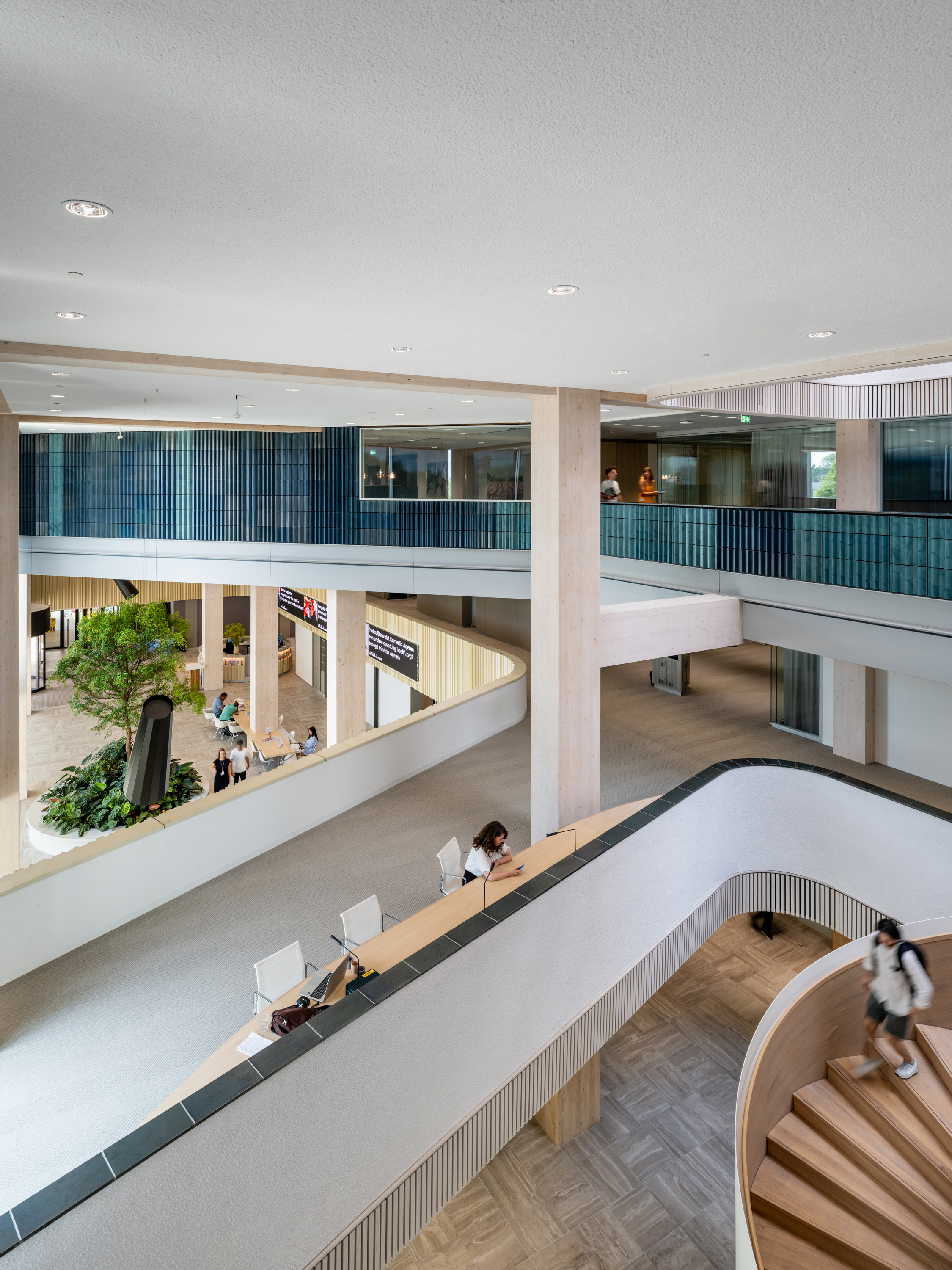 Het interieur is ingetogen, zodat merken hun eigenheid en identiteit kunnen meebrengen en invullen. Het kleurenpalet bestaat voornamelijk uit neutrale tinten. De kleuren groen, blauw en roze komen terug in het meubilair en vilten wandbekleding van de gemeenschappelijke ruimtes.