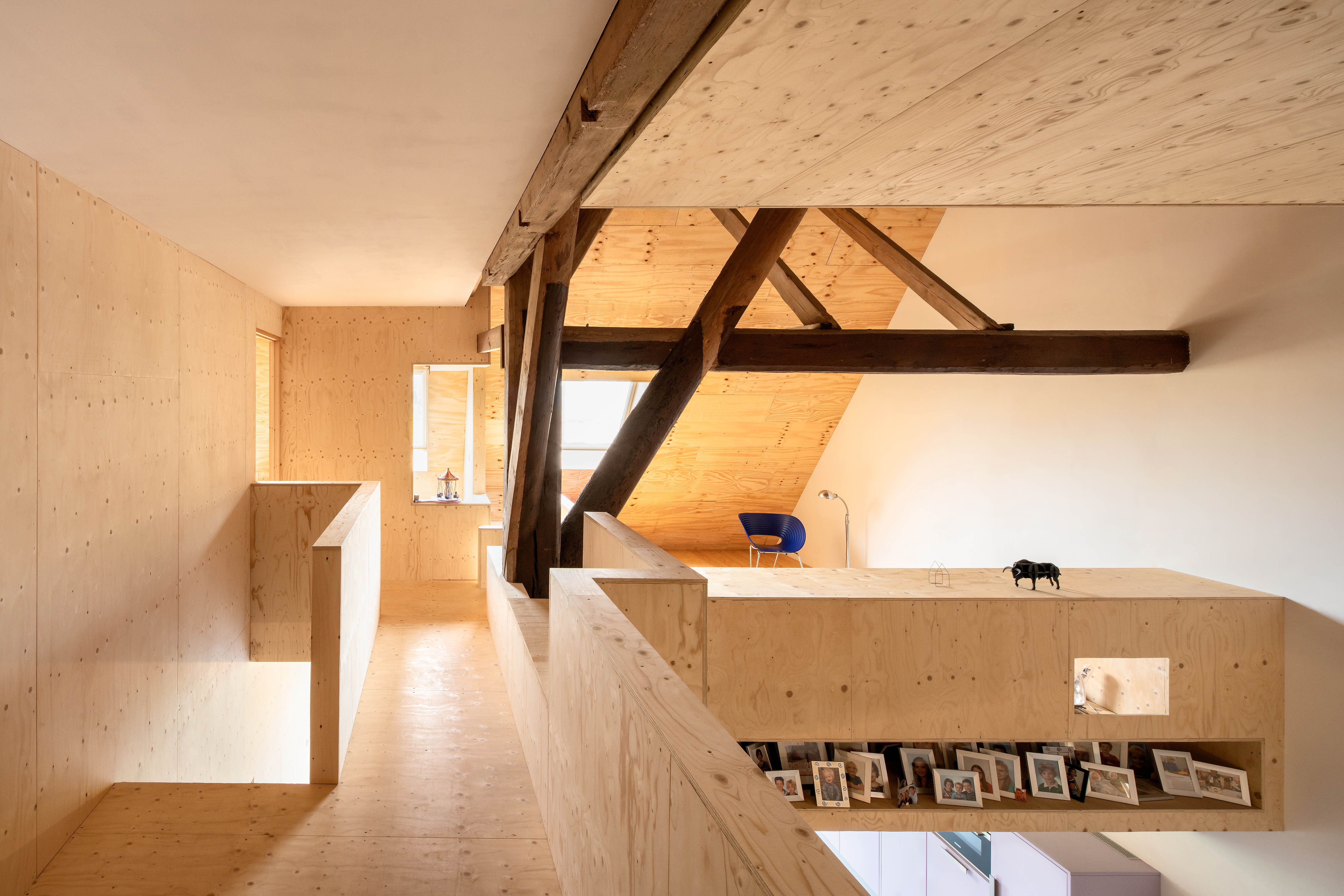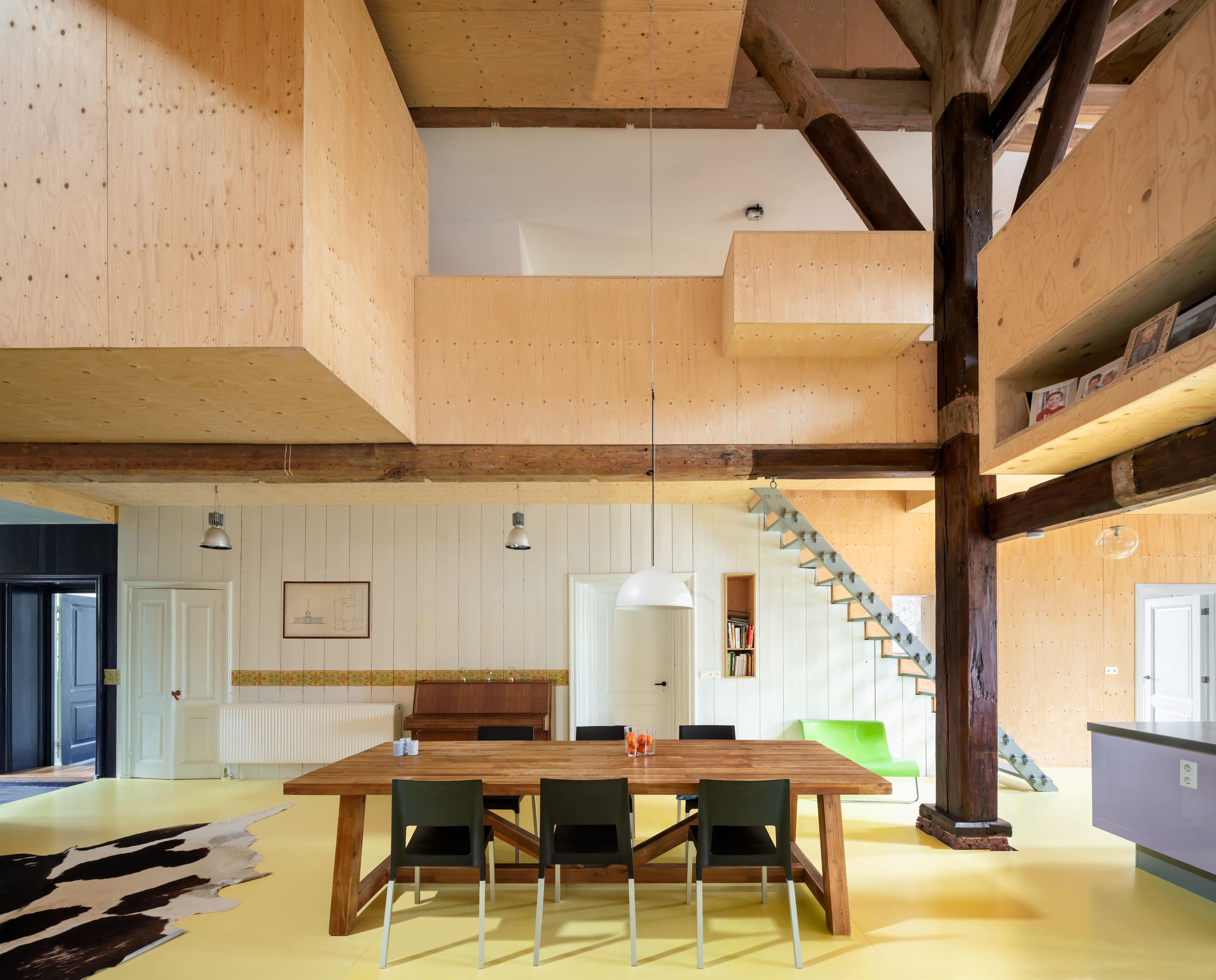 Veranderingen in gebruik zijn een belangrijk thema in ons werk. De rijksmonumentale boerderij in Hoogkarspel is nu een woonhuis. Maar tot in het midden van de jaren zeventig van de vorige eeuw was het een boerderij. Toen Patrick Fransen het huis 10 jaar geleden kocht vroeg hij zich af wat hij zou doen met al die ruimte (3300 m3) onder de enorme kap. Zijn kinderen bouwden hutten en dat bracht ons op het idee om zo ook met het huis om te gaan, er een soort hutten in te bouwen. Patrick vroeg zijn kinderen om mee te denken over hun nieuwe huis. Zijn zoon Castor maakte een maquette van zijn kamer, met een platform erin en een plek voor zijn tweelingzusje Meike. Ook de andere kinderen werd gevraagd hun eigen kamer te ontwerpen en mee te denken over het hele huis. Zo ontstond langzaam een idee dat het beste omschreven kan worden als ‘constante vrijheid’. Een voortdurend verder werken aan het ideale huis waarbij ook de kinderen meegroeiden van kind naar jonge volwassenen en regelmatig met nieuwe verzoeken kwamen vanuit een belevingswereld die steeds veranderde.