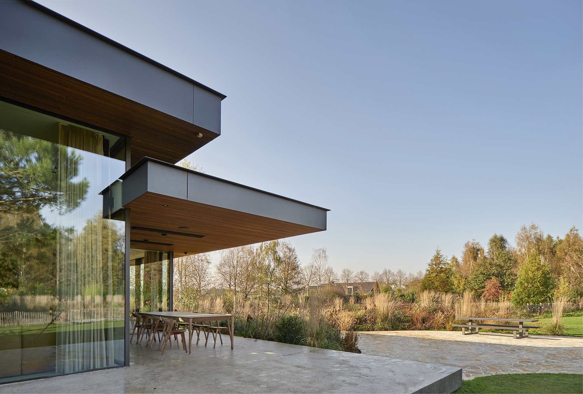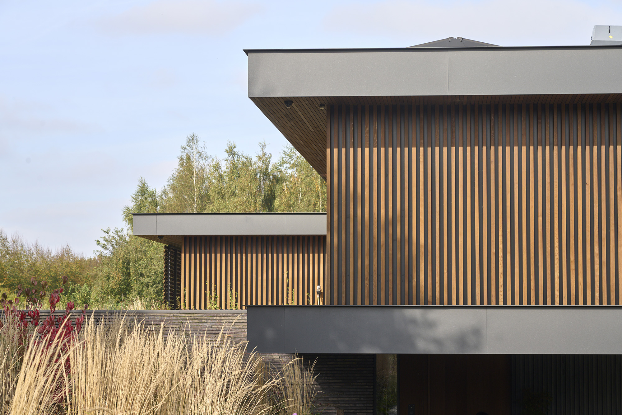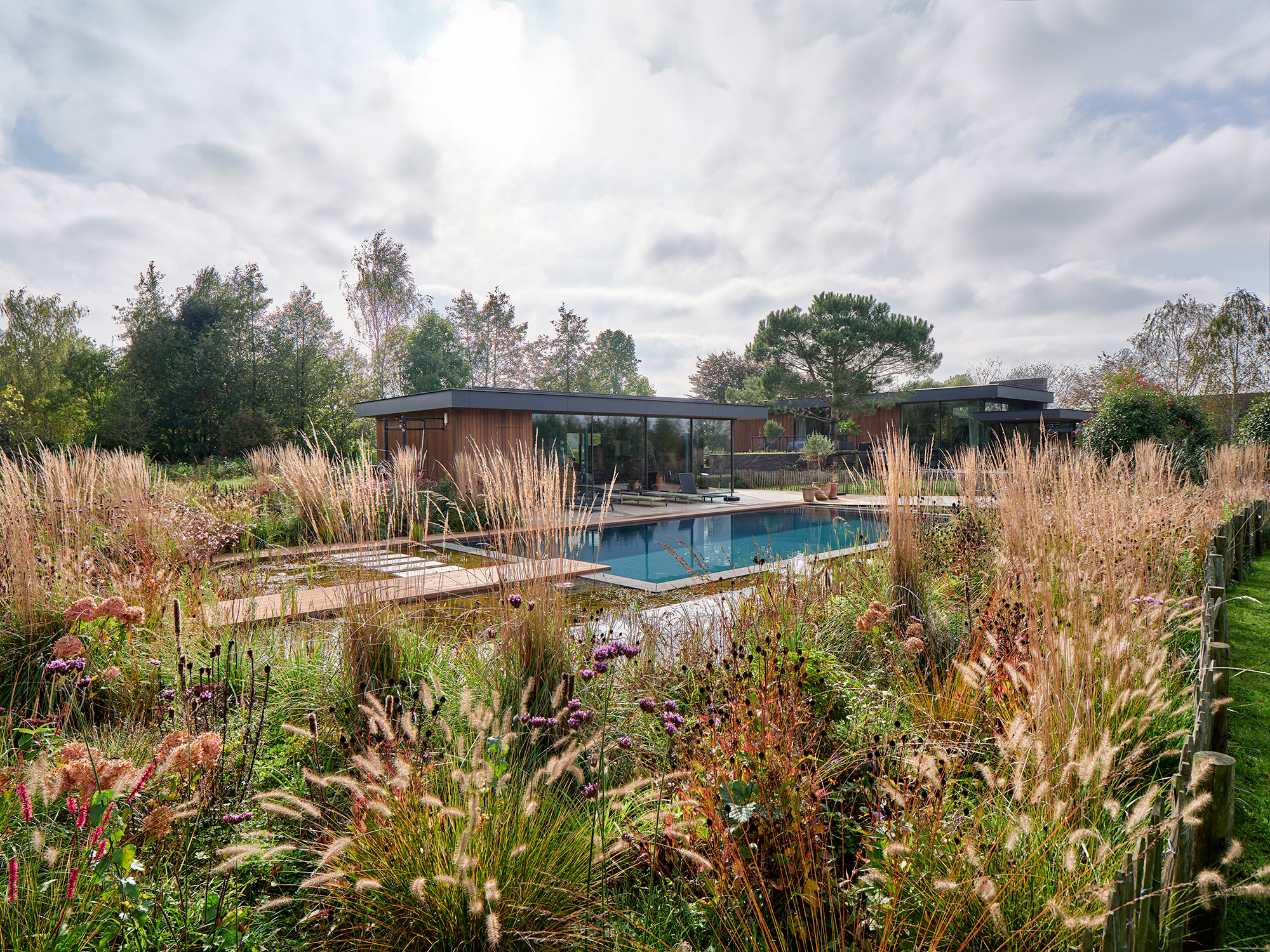 Net buiten het dorp, in het grasrijke agrarische buitengebied, wordt een nieuw landgoed ontwikkeld. De oriëntering op de zon en de ligging en het uitzicht van de woning in het coulisselandschap is leidend in het ontwerp. Door enkel natuurlijke en donkere materialen te gebruiken, probeert het huis op te gaan in zijn natuurlijke omgeving.