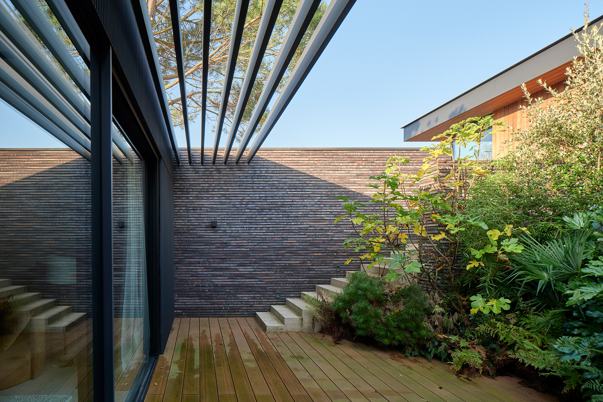 De woning wordt opgebouwd uit gemetselde schijven in een donkere baksteen die haaks op elkaar geplaatst worden. Door de gekruiste stapeling ontstaan er rondom private ruimtes en wordt de coulissen werking doorgezet. Tevens zorgt de manier van stapelen voor afscheiding en privacy waardoor het huis naar de openbare weg en de buren een meer gesloten karakter heeft.